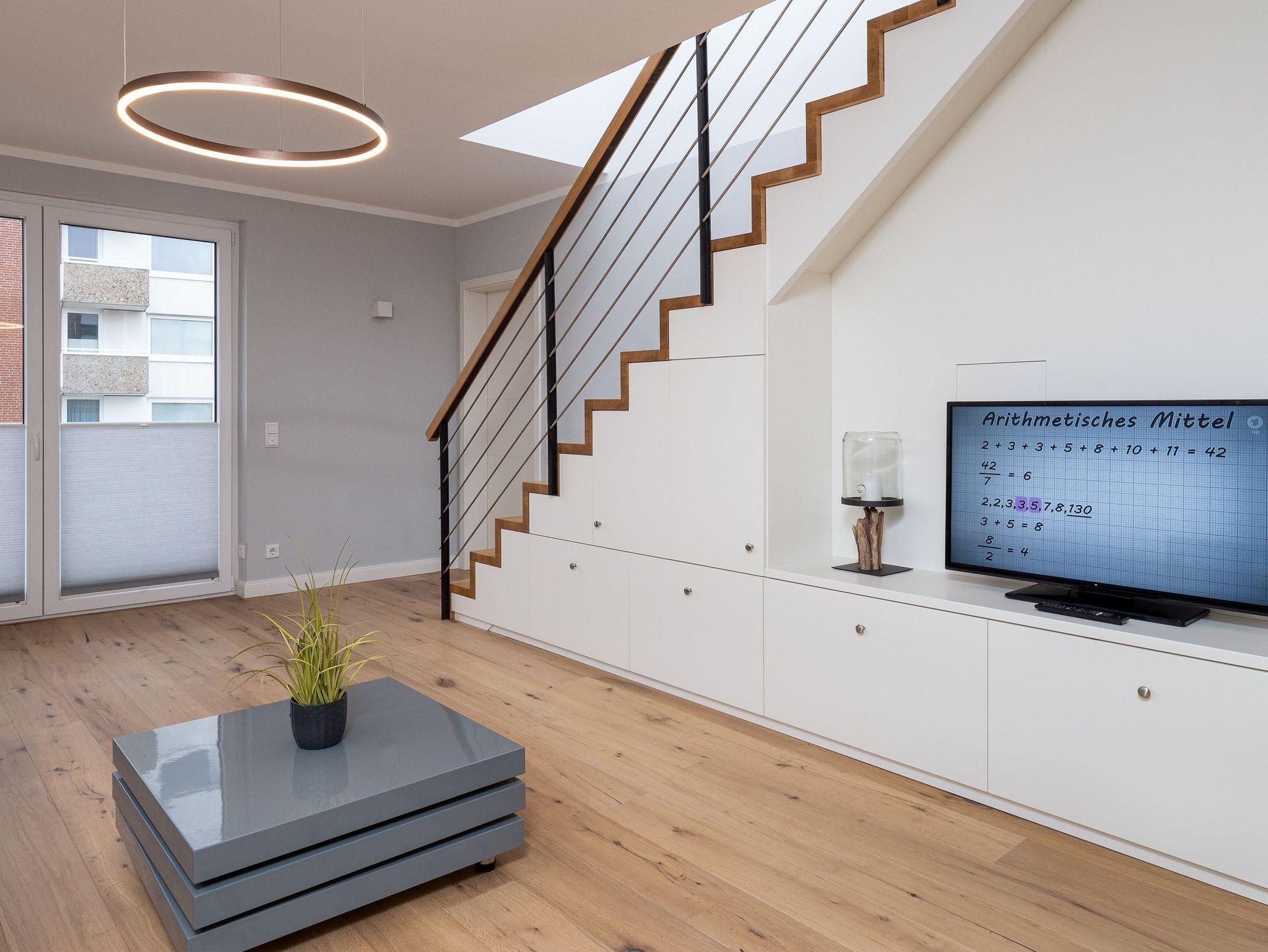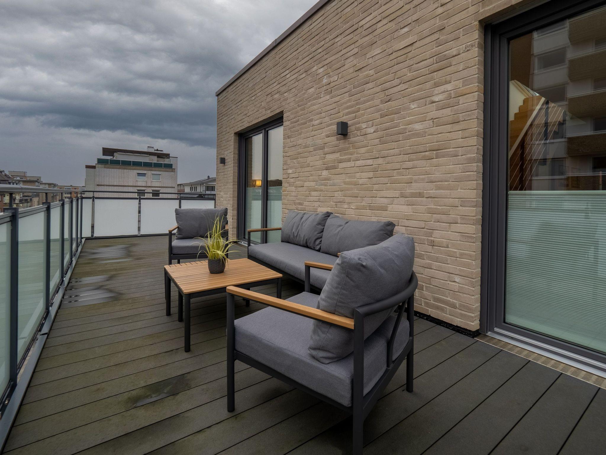 Unser Penthouse bietet Ihnen Platz für bis zu 4 Personen. Alle Räume sind gefliest z.T. in warmer Holzoptik. 2 Schlafzimmer mit Boxspringbetten 180×200, jeweils mit Einbauschrank, Kommode und TV ausgestattet, lassen Sich durch elektr. Rollläden auch perfekt verdunkeln. Zusätzlich zu 2 Duschbädern, steht ein separates Gäste-WC zur Verfügung. Der Wohn-Essbereich wurde mit einer interessanten Küche zum Familienmittelpunkt gestaltet! Auf der großzügigen Terrasse lässt sich das Freiluftfrühstück oder der Sundowner gut genießen.