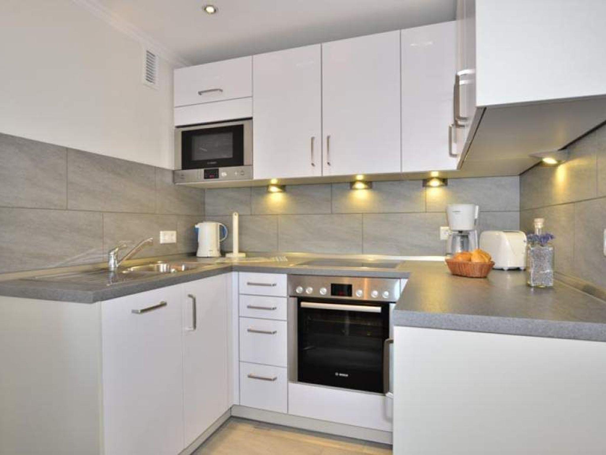 Die moderne, offene Küche hat ein Kochfeld, Backofen und einen Kühlschrank mit 3*-Gefrierfach. Kaffeemaschine, Wasserkocher und Toaster gehören zur Grundausstattung.