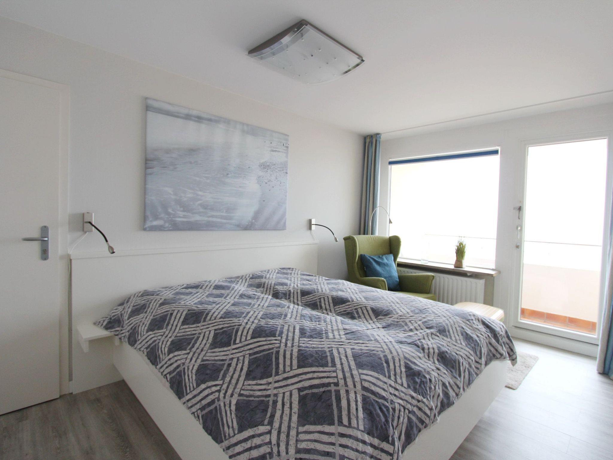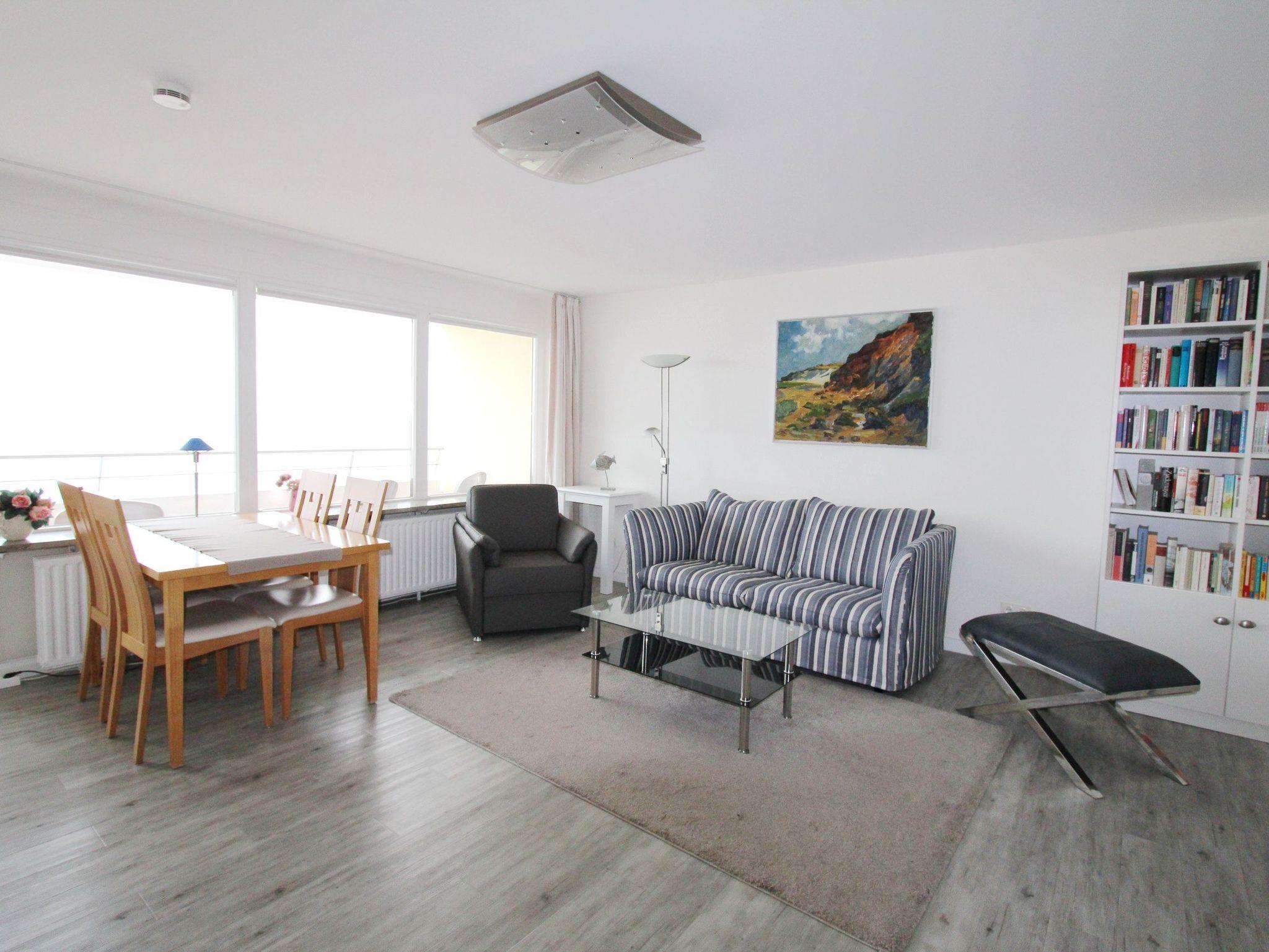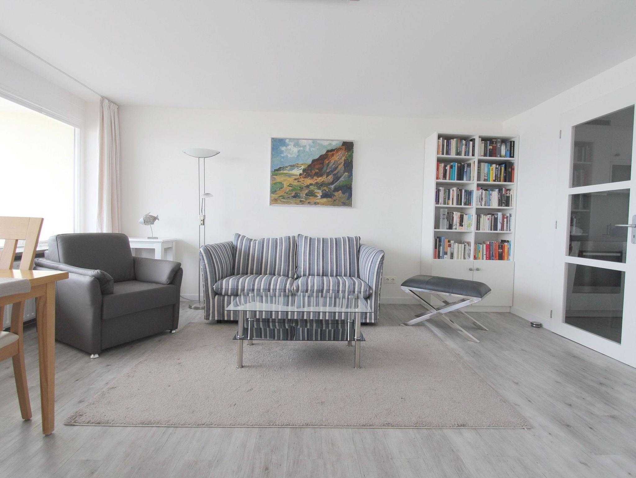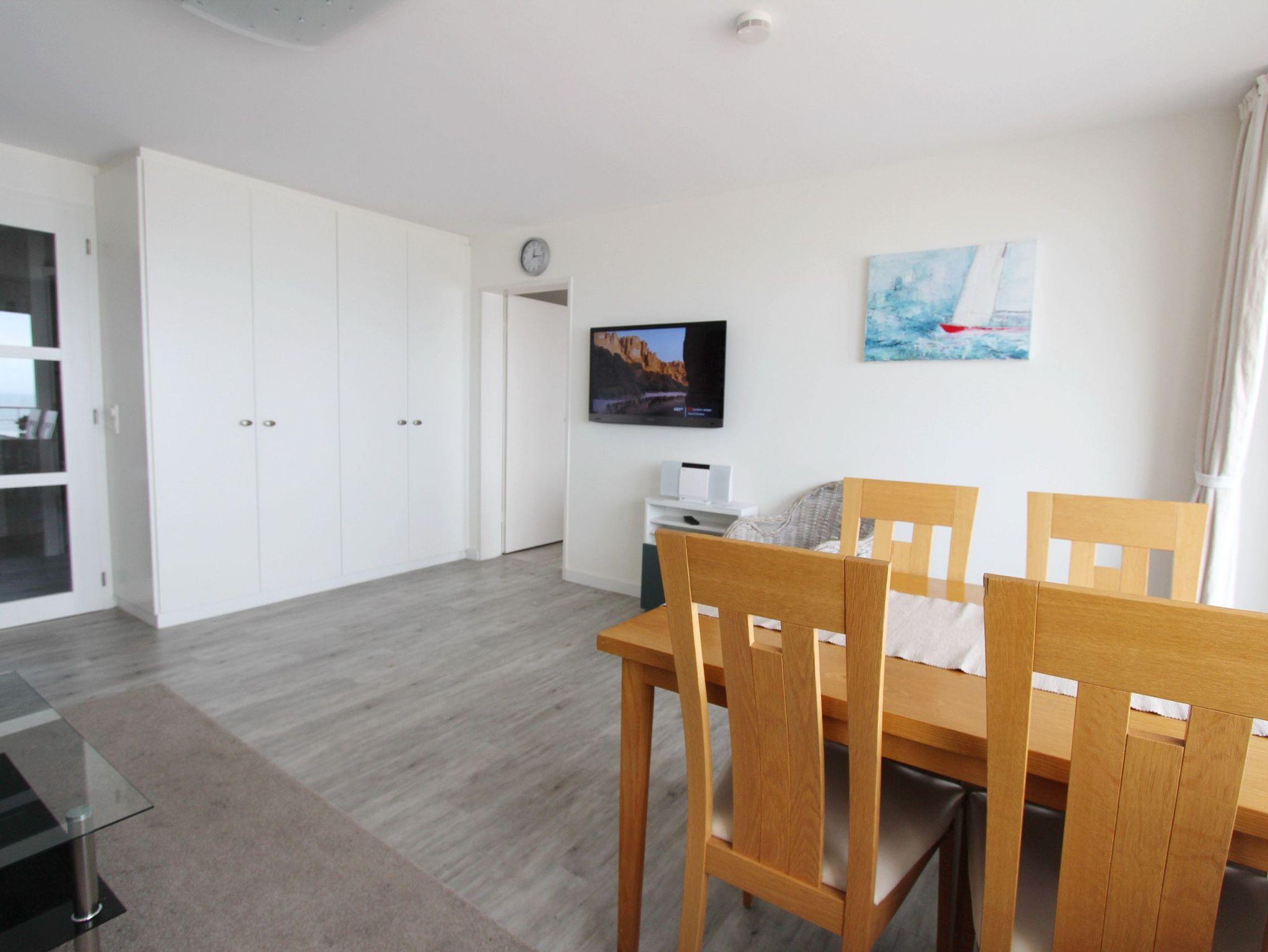 Zweizimmerwohnung in der 5. Etage im Haus Metropol mit herrlichem Blick über den Strand und die Nordsee. Das Wohnzimmer mit vorgelagertem, großzügigen Westbalkon und Balkonmöbeln verfügt über eine Sitzgruppe, einen Ledersessel, einen Korbstuhl und einen Esstisch mit 4 Stühlen. Hochwertige Tischlerarbeiten in der ganzen Wohnung bieten ihnen viel Stauraum für ihre persönlichen Dinge. Schlafzimmer mit feststehendem Doppelbett, kleiner Sitzecke und zusätzlichem Flachbildfernseher (HDTV) und Westbalkon. Die Küche befindet sich im Flur und ist ausgestattet mit Geschirrspüler, Backofen, Mikrowelle und Ceranfeld. Das Badezimmer hat eine Dusche. Im Wohnraum und Schlafzimmer wurde hochwertiger Designfussboden verlegt. Zur technischen Ausstattung dieser Nichtraucherwohnung gehört: ein Flachbildfernseher (HDTV) mit Bose Audiosystem sowie Bluetooth. Ein freies WLAN Netzwerk (WEG Haus Metropol - Passwortfrei - ohne Gewähr) steht ihnen kostenfrei zur Verfügung. Wohnungsgröße: ca. 58 m².