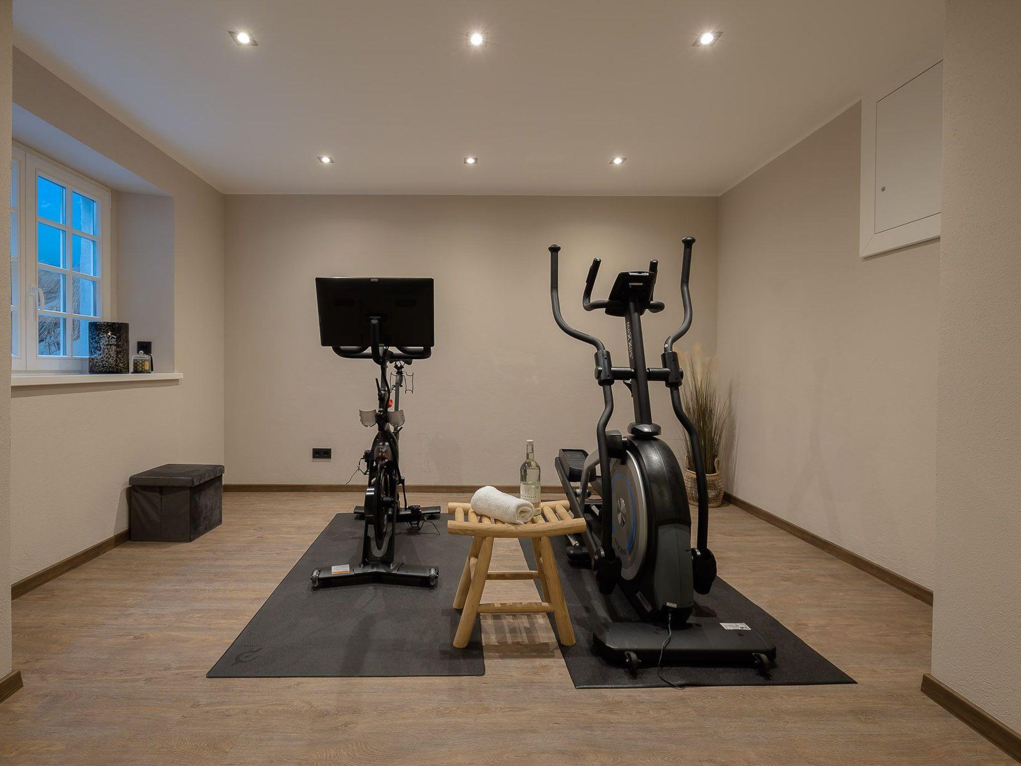 Sie möchten sich auch in Ihrem Urlaub fit halten und Sport machen? Als Gast unseres Hauses profitieren Sie von einer kostenfreien Nutzung unseres gemeinschaftlichen Fitnessraums mit Peloton®-Bike, Crosstrainer und Spiegelwand. Gerne können Sie auch nach Yogamatten fragen, die Sie jederzeit dazu buchen können. Für eine Runde Entspannung nach dem Sport sorgt unsere Sauna inklusive Liegen.