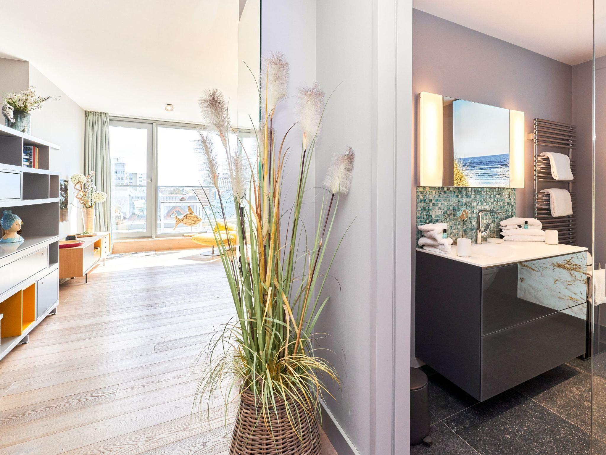 Sölring Loft - Neue Mitte - Westerland , Wohnung 23. Exklusive Ferienwohnung für 2 Personen lässt keine Wünsche offen. Lichtdurchfluteter Wohnraum im zeitlosen Design sowie offenes Wohnambiente im außergewöhnlichen Stil erwarten Sie hier. Die Ausstattung lässt keine Wünsche offen - hochwertige Materialien, feinste Stoffe und edle Wohnaccessoires sowie ein traumhaftes geräumiges Luxusbad und eine integrierte Luxusküche im Beton- Look verstehen sich von selber.