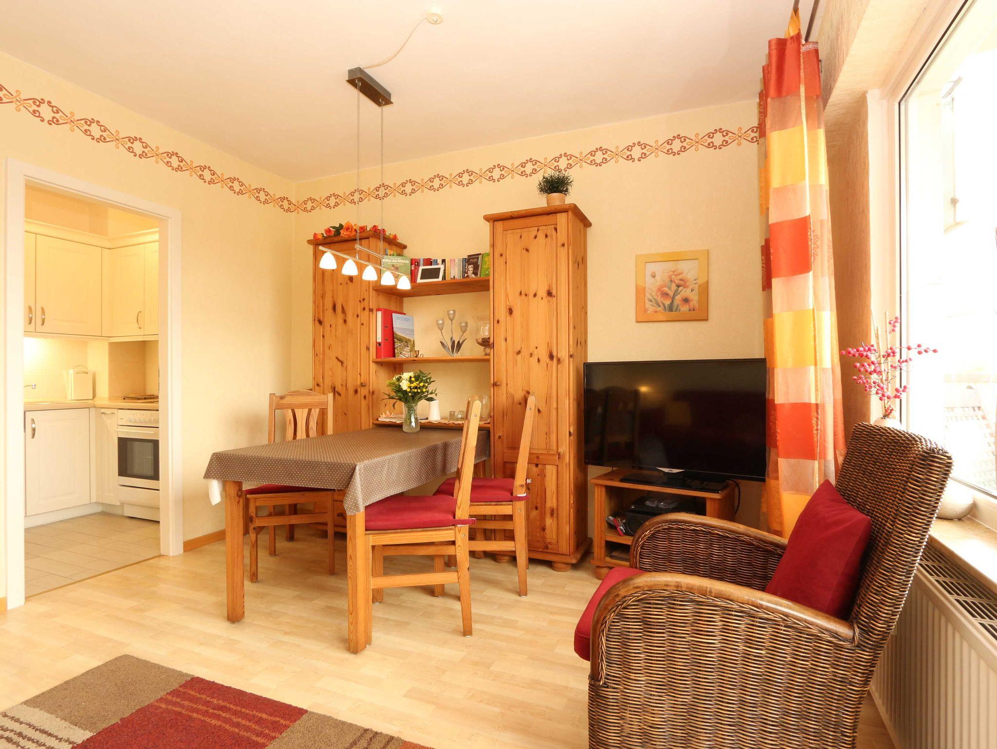 • Das Wohnzimmer ist mit Kabel-TV, Sofa und Sessel, Esstisch mit 4 Stühlen, Wohnzimmerschrank und Flachbildfernseher und DVD ausgestattet.