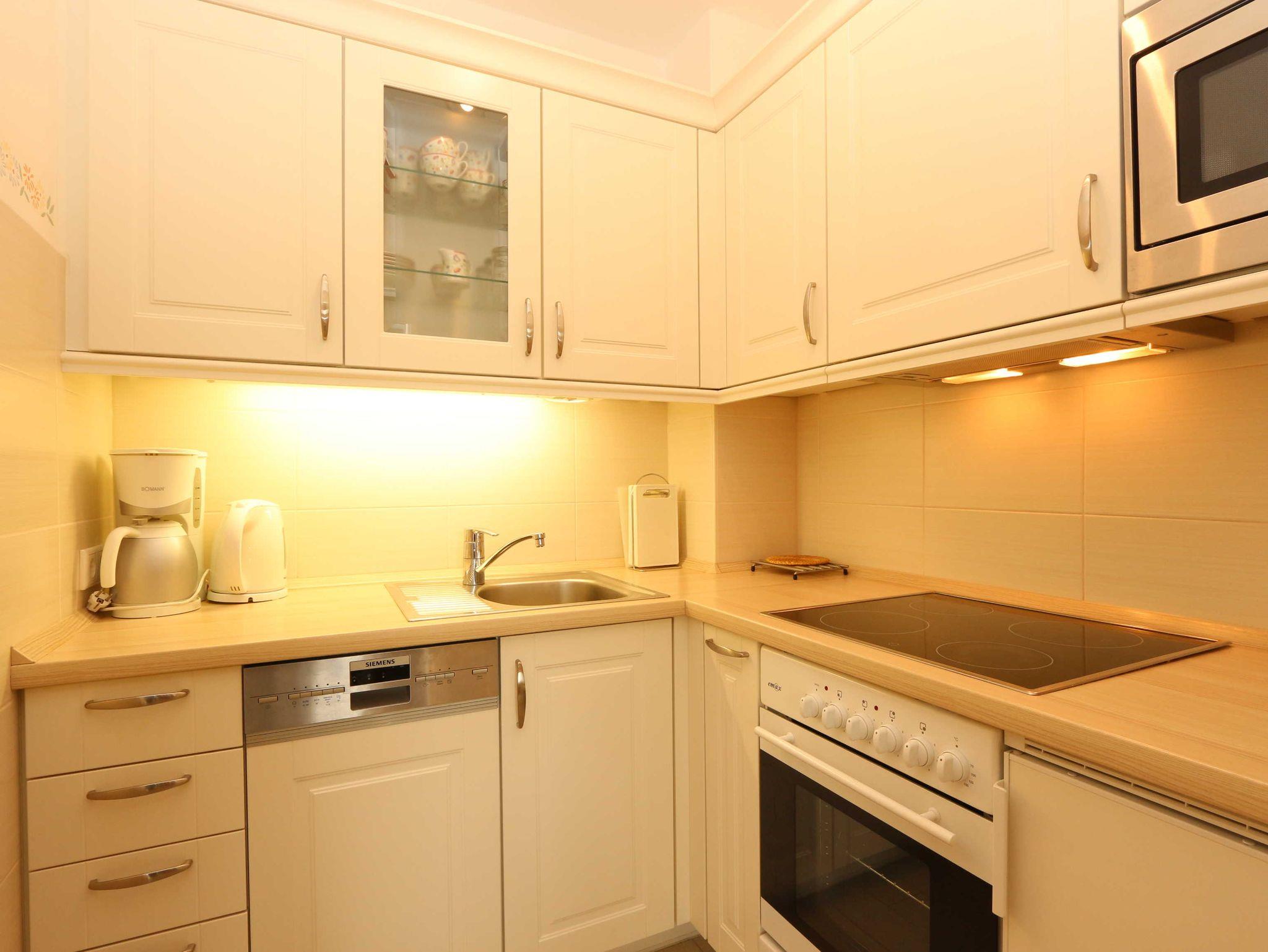 • Die Einbauküche verfügt über ein 4-Platten-Glaskeramikkochfeld, Backofen, Mikrowelle, Kühlschrank mit Gefrierfach, Wasserkocher, Kaffeemaschine, Toaster und ausreichend Geschirr.
