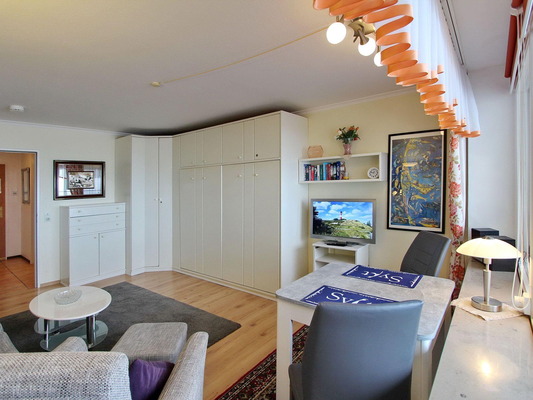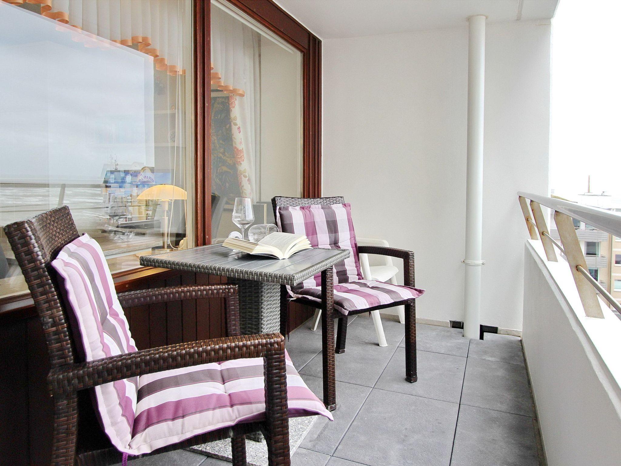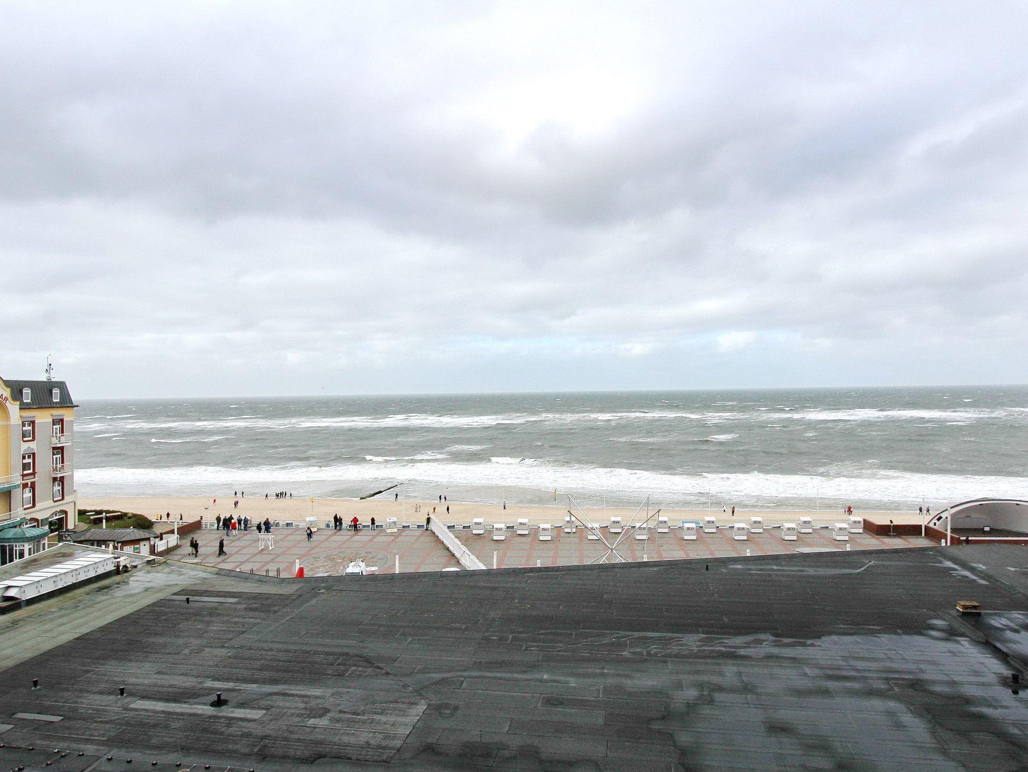 Schöne 1-Zimmer- Wohnung im Haus am Meer in der 4. Etage mit herrlichem Blick auf die Nordsee. Von der vorgelagerten Loggia haben Sie einen tollen Blick auf die Promenade und können die Sonnenuntergänge genießen. Der kombinierte Wohn-/Schlafraum verfügt über 2 Einzelschrankbetten, einer gemütlichen Couchgarnitur mit Sessel und einem Essplatz mit zwei Stühlen am Fenster. Die kleine Küchenzeile im Flur ist ausgestattet mit einem Cerankochfeld mit 4 Platten, einem Backofen und einem Kühlschrank. Modernes Duschbad/WC. Nichtraucherwohnung. Haustiere nicht gestattet. Kostenfreier W-Lan-Hotspot (WEG Haus am Meer - Passwortfrei - ohne Gewähr). Wohnungsgröße 34 m².