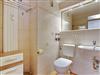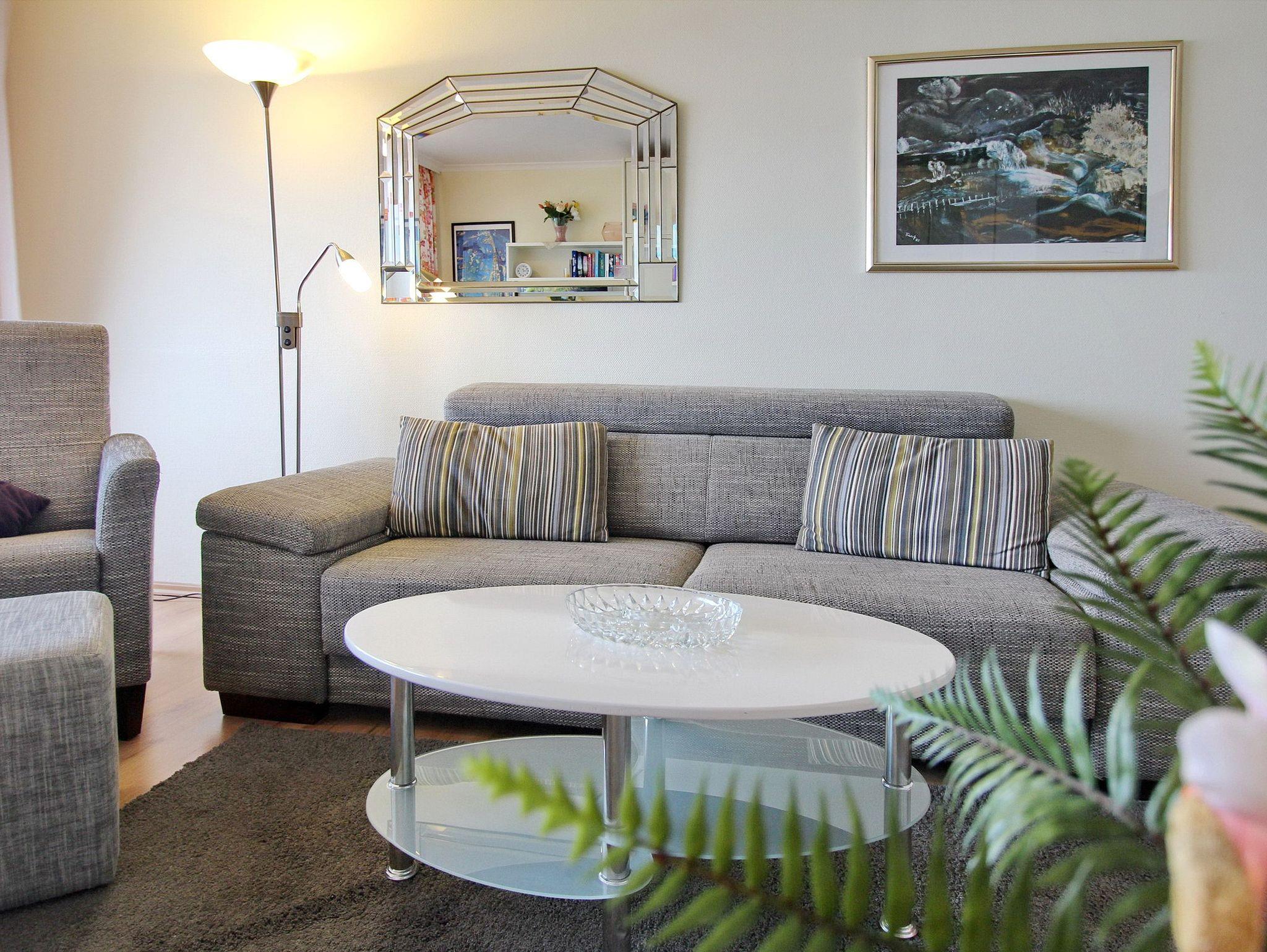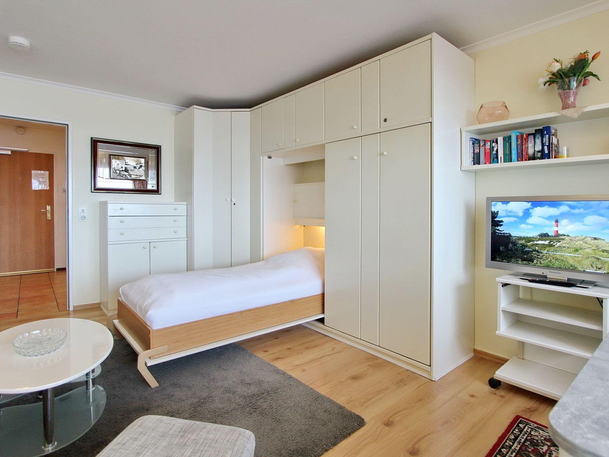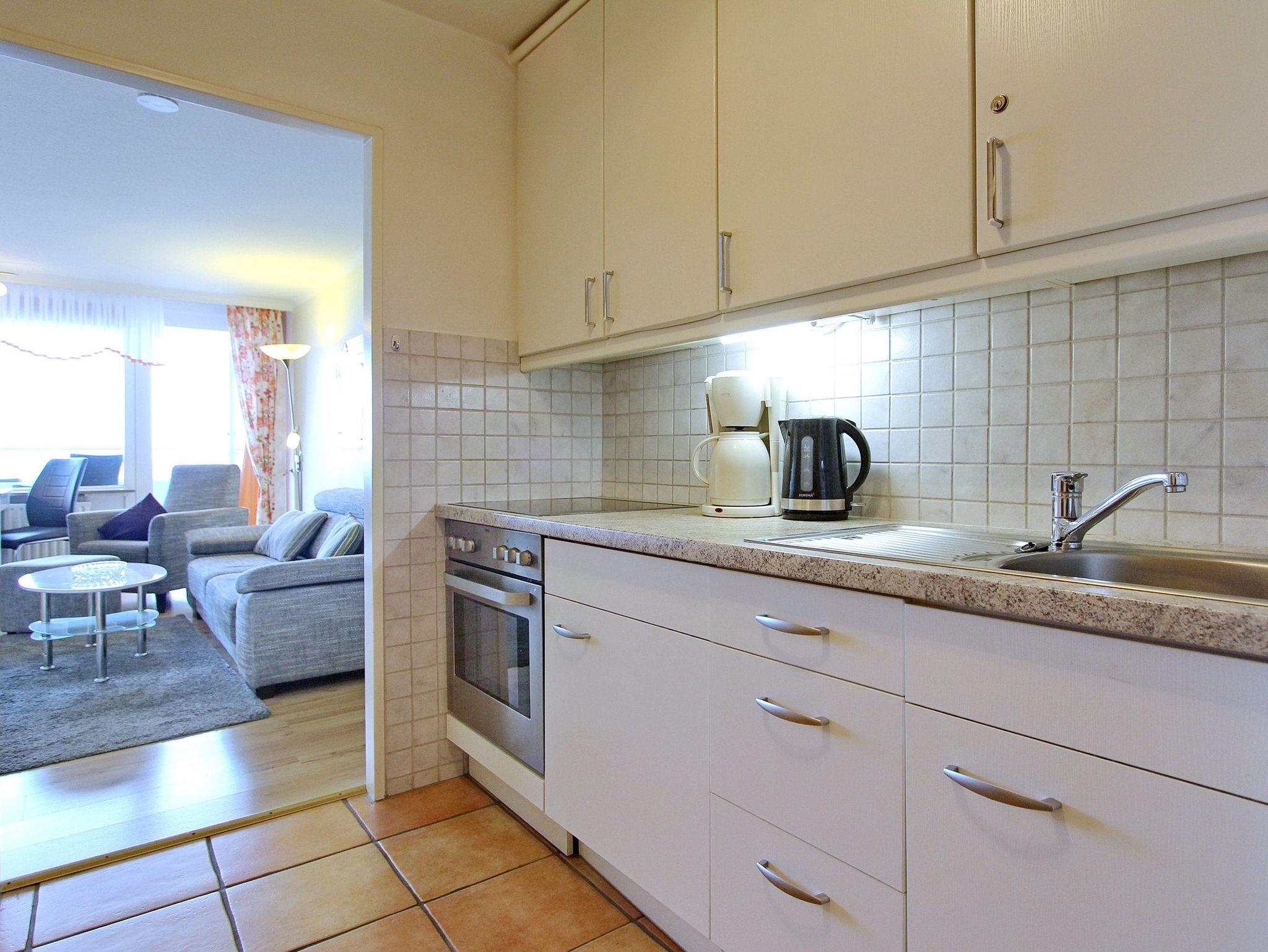Schöne 1-Zimmer- Wohnung im Haus am Meer in der 4. Etage mit herrlichem Blick auf die Nordsee. Von der vorgelagerten Loggia haben Sie einen tollen Blick auf die Promenade und können die Sonnenuntergänge genießen. Der kombinierte Wohn-/Schlafraum verfügt über 2 Einzelschrankbetten, einer gemütlichen Couchgarnitur mit Sessel und einem Essplatz mit zwei Stühlen am Fenster. Die kleine Küchenzeile im Flur ist ausgestattet mit einem Cerankochfeld mit 4 Platten, einem Backofen und einem Kühlschrank. Modernes Duschbad/WC. Nichtraucherwohnung. Haustiere nicht gestattet. Kostenfreier W-Lan-Hotspot (WEG Haus am Meer - Passwortfrei - ohne Gewähr). Wohnungsgröße 34 m².