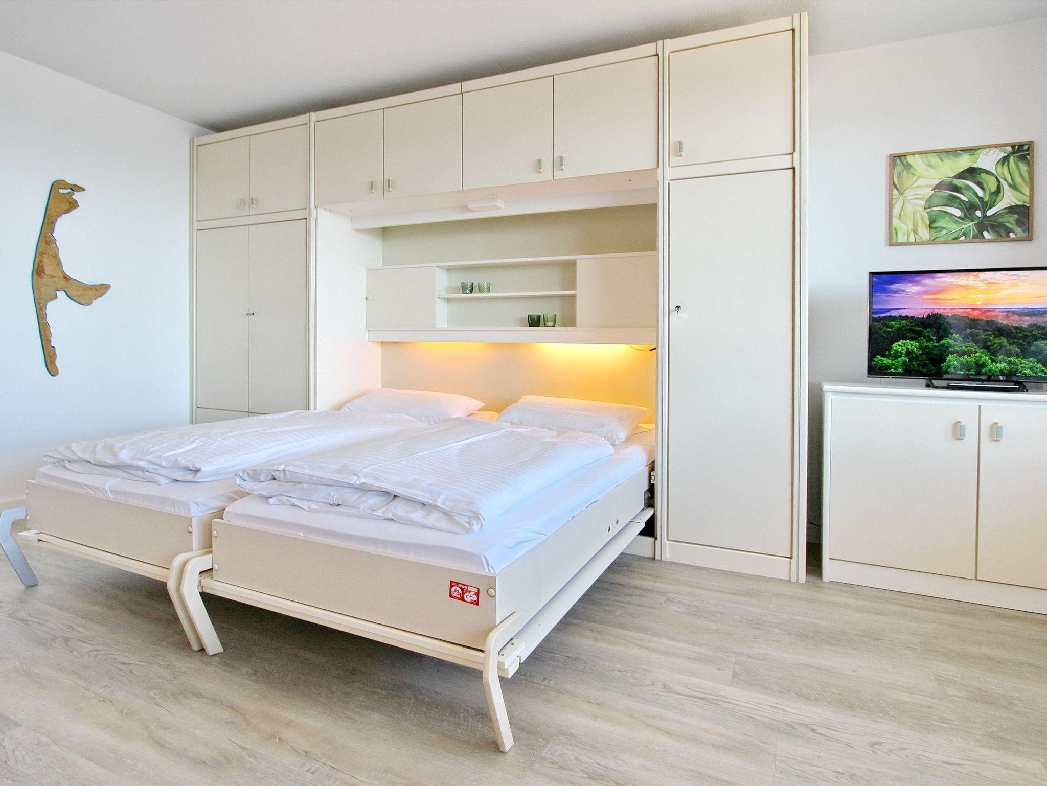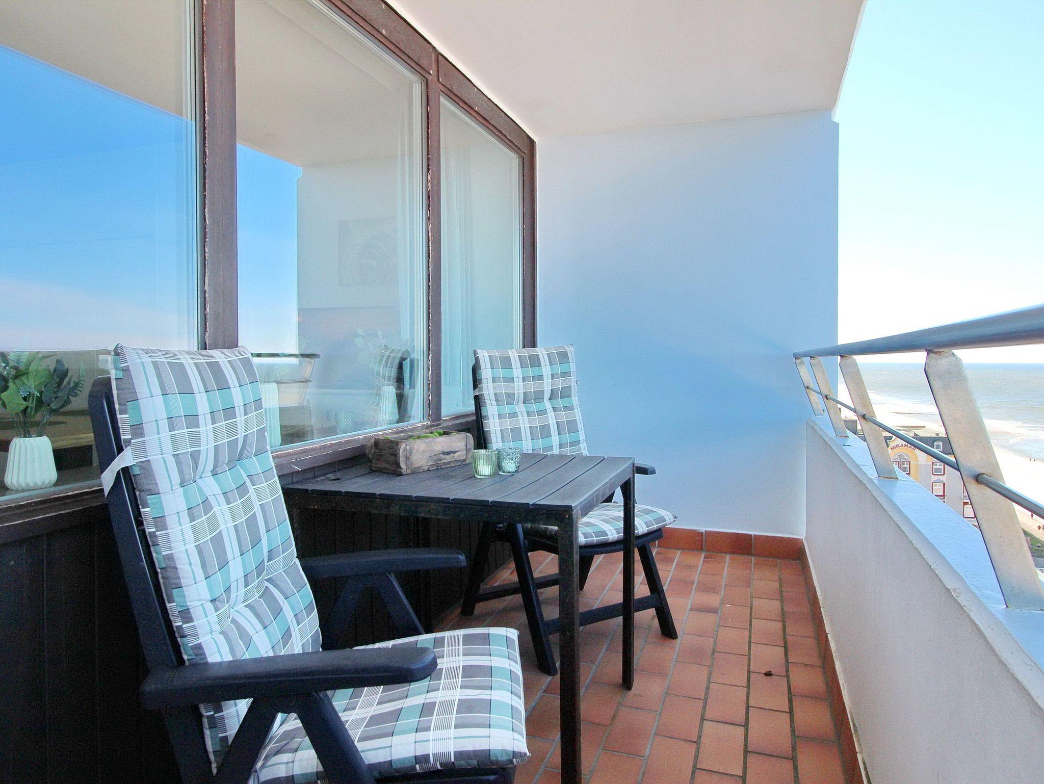 Das geräumige Appartement für bis zu 2 Personen in der 10. Etage im Haus Metropol hat eine Wohnungsgröße von ca. 42 m². Das wirklich Schöne an dieser Wohnung ist der herrliche Panoramablick über die Nordsee und den weißen Strand von Westerland. Der kombinierte Wohn-/Schlafraum hat einen Westbalkon mit Balkonmöbeln und Auflagen und verfügt über Einzelschrankbetten, einen Essplatz mit 2 Stühlen am Fenster, ein neues 3-Sitzer Sofa und einen elektrisch verstellbaren Relaxsessel für die Entspannung. Das Badezimmer mit Dusche hat einen beheizten Handtuchtrockner, der Flur eine zusätzliche Garderobennische. In der separaten Küche mit Backofen können Sie sich selbst verpflegen. Zur technischen Ausstattung gehört: ein 32 Zoll Flachbildfernseher und ein Radio. Ein freies WLAN Netzwerk (WEG Haus Metropol - Passwortfrei - ohne Gewähr) steht ihnen kostenfrei zur Verfügung.
