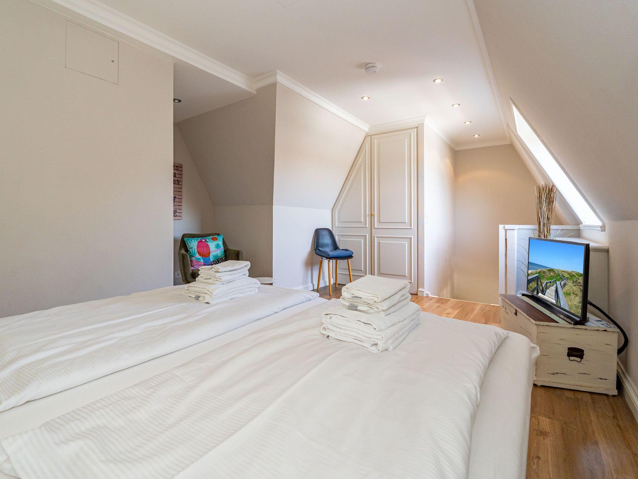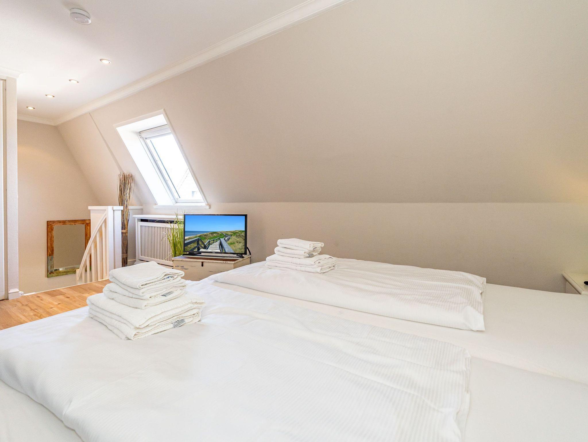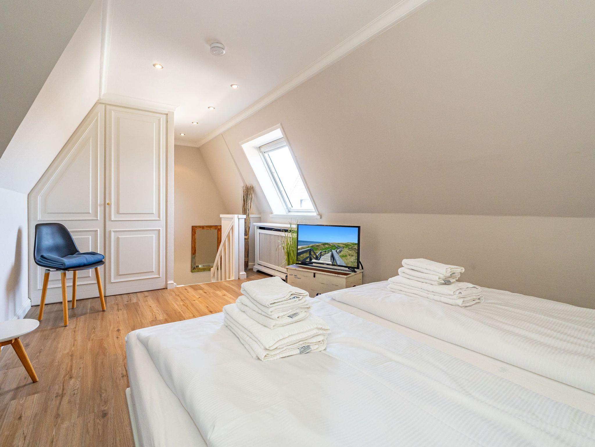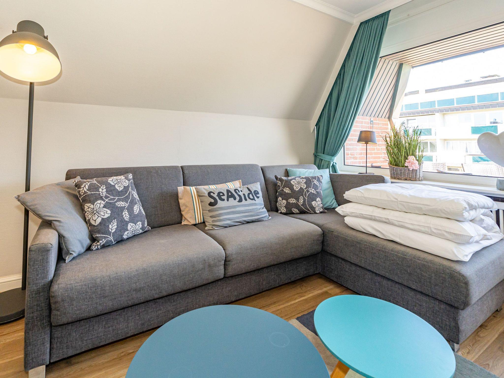 Mit pastelligen Farben und einem modernen Möbelmix bietet diese hochwertig ausgestattete Ferienwohnung Sylter Glück in Westerland auf einer Fläche von 75 m² Platz für maximal 4 Personen. Sie befindet sich in der 2. Etage und verfügt neben dem Wohnzimmer über ein Schlafzimmer sowie ein Badezimmer. Zur Ausstattung gehören ein Ostbalkon mit Balkonmöbeln, Auflagen, sowie ein offener WLAN Hotspot im Haus. Der Wohnbereich vereint eine gemütliche Schlafcouch (Liegefläche 1,40 x 2m), einen Flachbild-TV sowie eine voll ausgestattete offene Einbauküche mit Backofen, Geschirrspüler, Cerankochfeld sowie Nespressomaschine (Kapseln). Kühlschrank, Kaffeemaschine, Toaster und Wasserkocher gehören zur Grundausstattung. Vom Wohnzimmer aus hat man Zutritt auf den geschützten Balkon, der bei schönem Wetter zum sonnenbaden und verweilen einlädt. Für einen guten Start in den Tag sorgt das trendige großzügige Badezimmer, das nicht nur ein optischer Hingucker ist, sondern mit Regendusche, Fön und Handtuchtrockner entsprechende Annehmlichkeiten mit sich bringt.