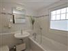 Das 1. geräumige Schlafzimmer (Vinylboden) hat ein gutes Doppelbett sowie ein schickes Wannenbad/WC.