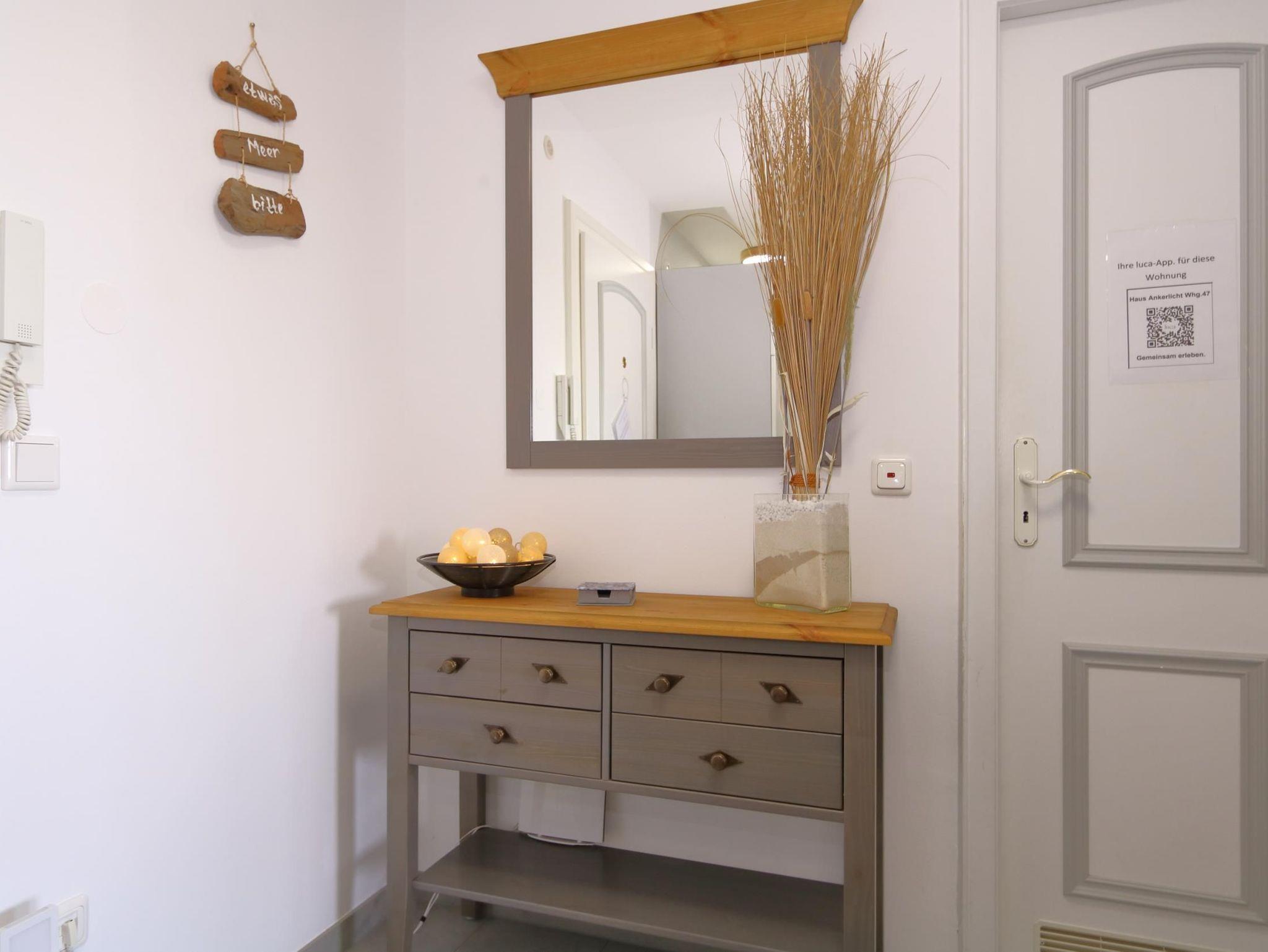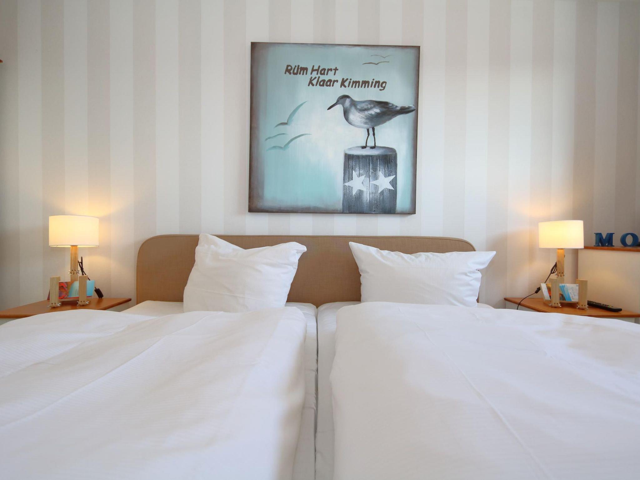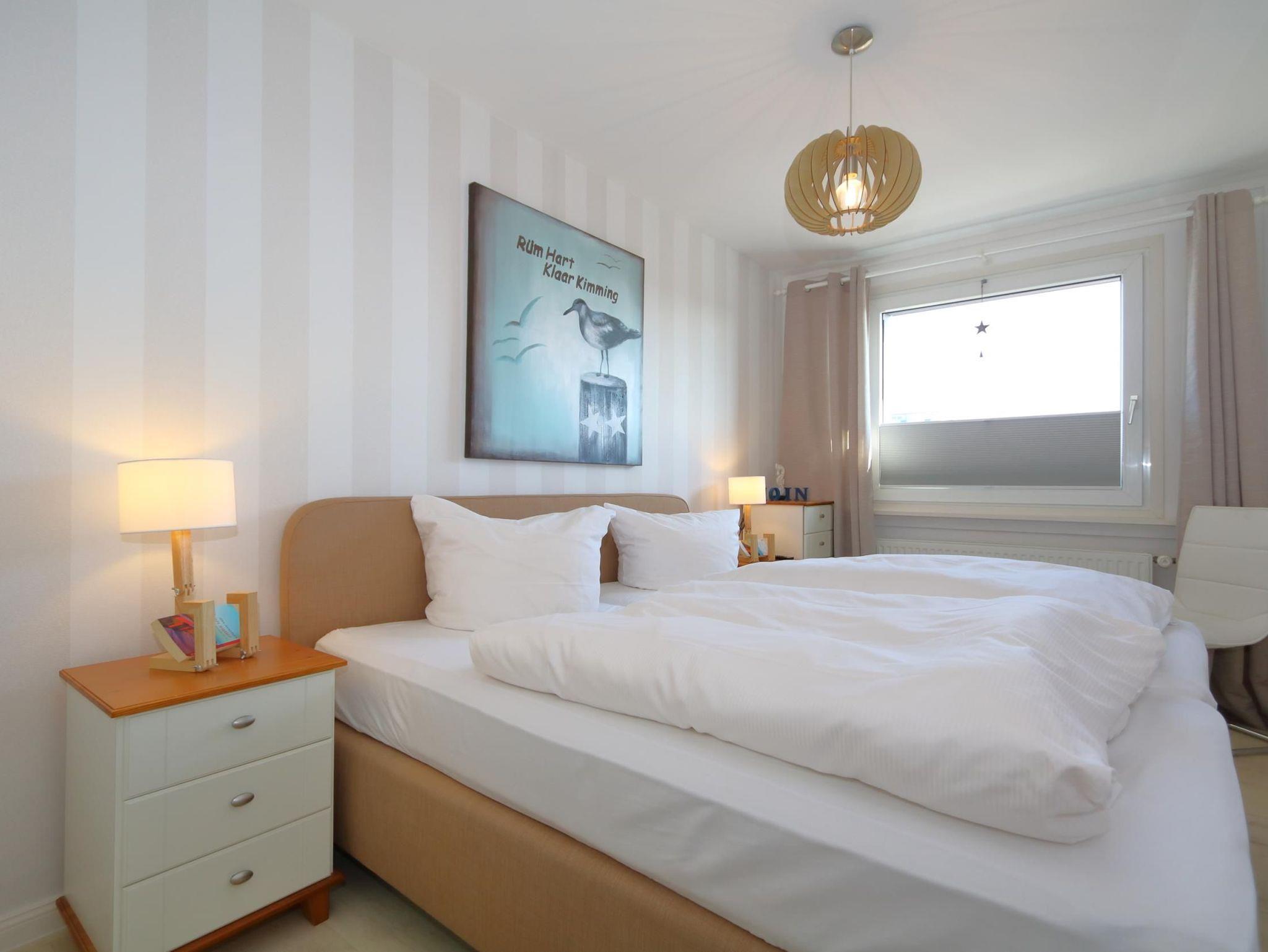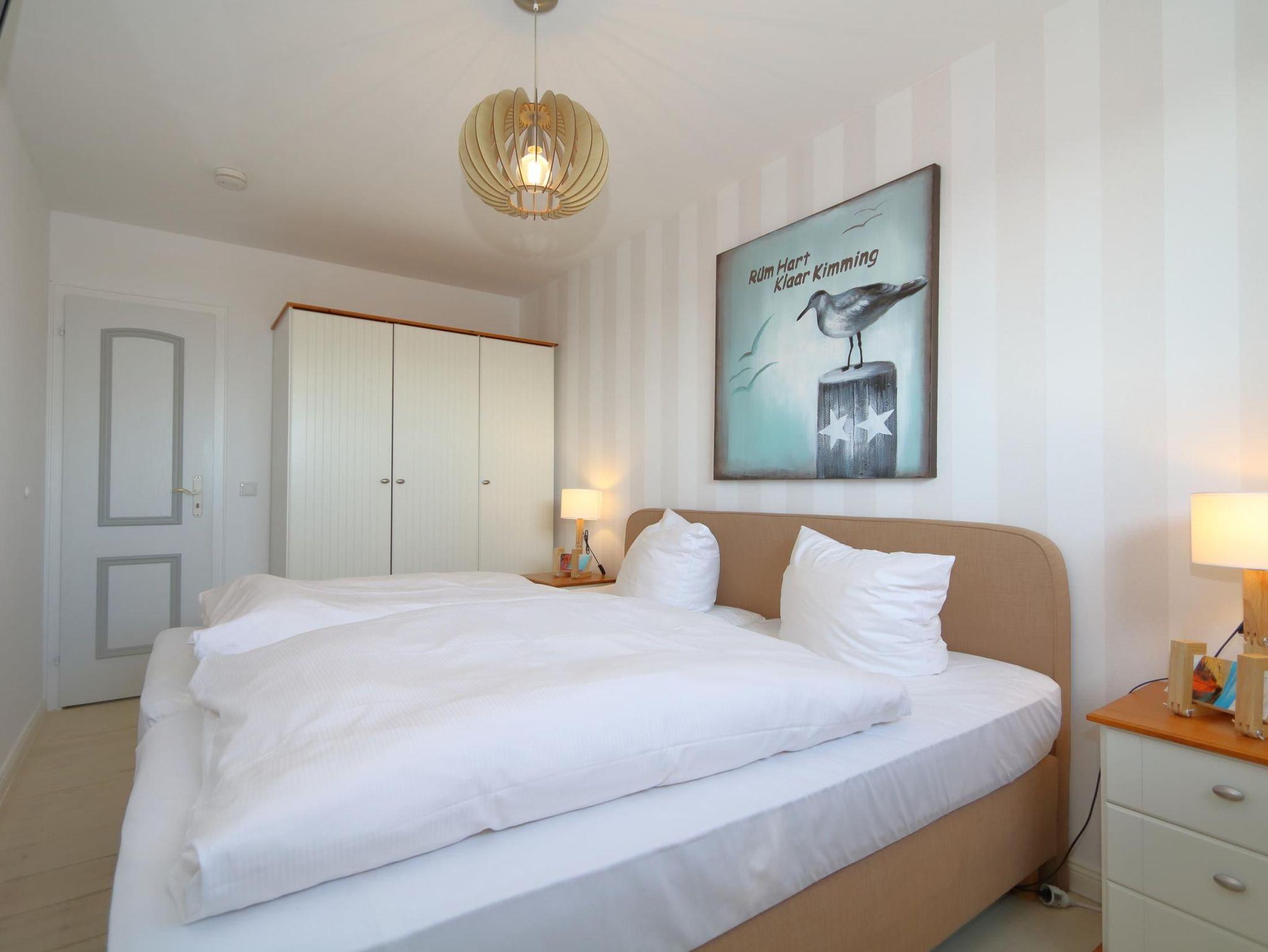 Das Schlafzimmer, ebenfalls mit einem Echtholzfußboden ausgestattet, komfortablen Boxspringbett (2,0x 2,0m) und LED- Fernseher sorgen für erholsame Nächte nach ausgedehnten Strandspaziergängen oder einer durchgefeierten Nacht. Ein Bettchen für die kleinsten ist natürlich auch da und kann bei Bedarf aufgestellt werden.