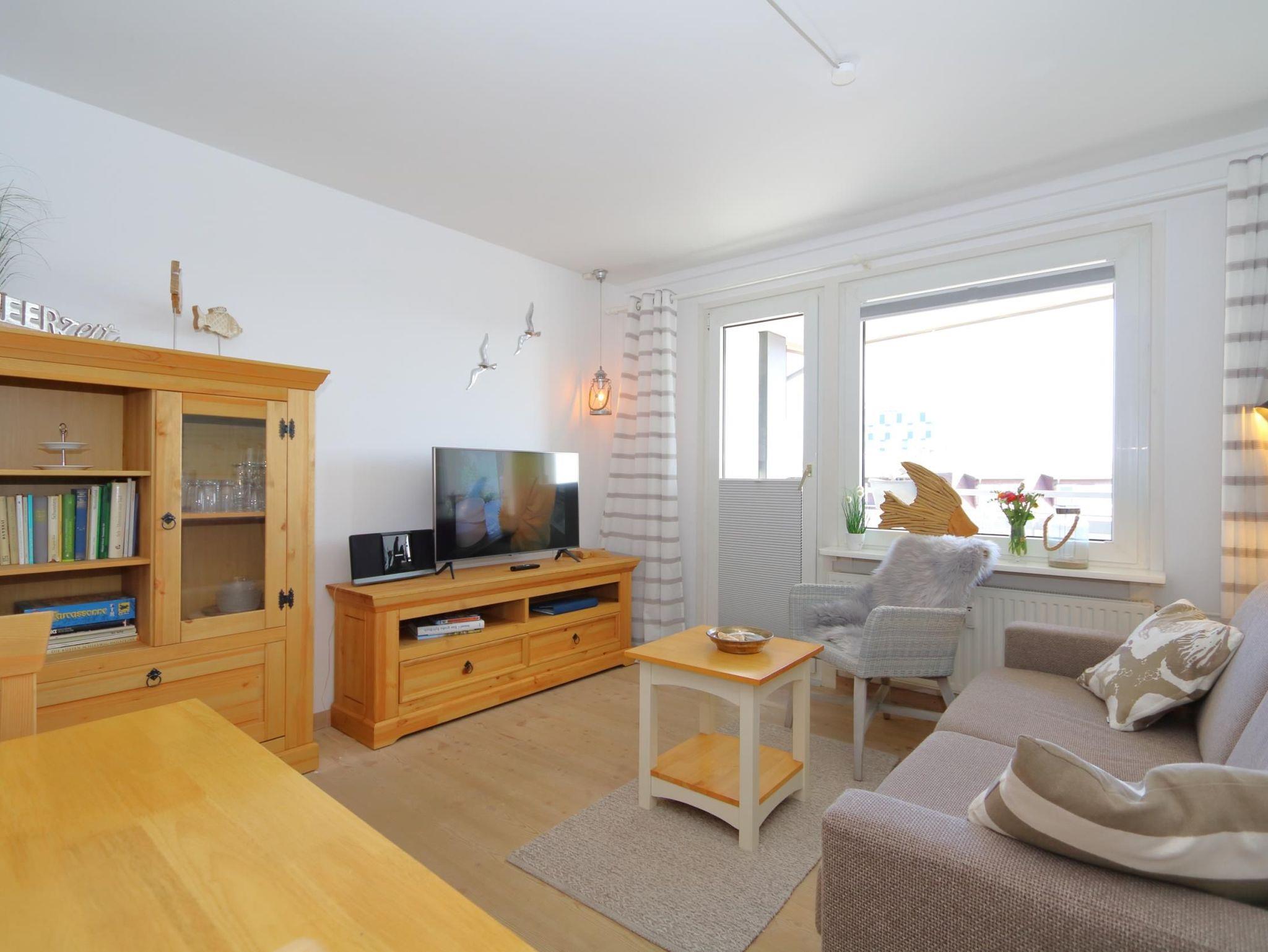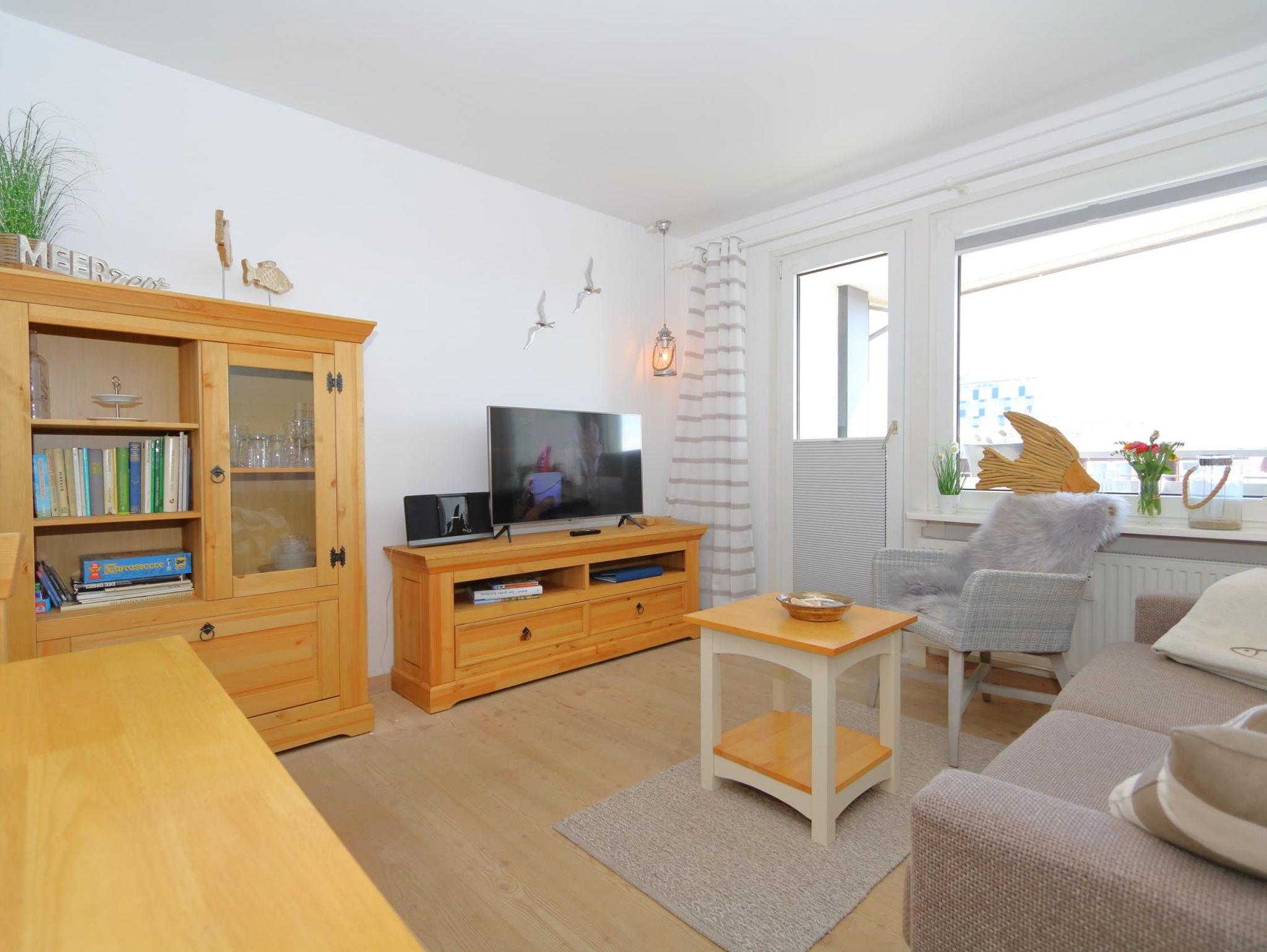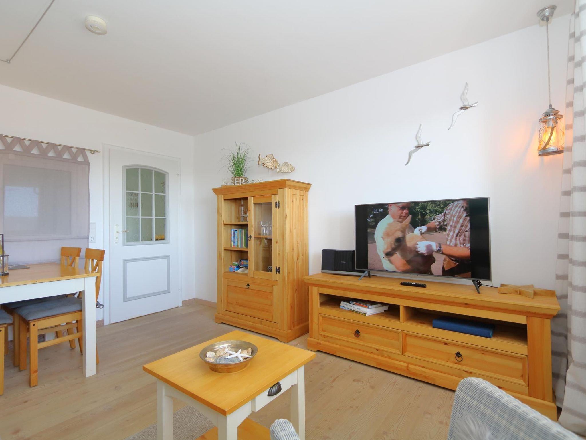 Das gemütliche Wohnzimmer, mit Balkon, Echtholzfußboden, Massivholz Möbeln, großem, 43 Smart- TV, Grundig Kompaktanlage mit Radio, W'Lan, CD- Player und Bluetooth, Esstisch mit Stühlen für 4 Personen und einer hochwertigen Schlafcouch (mit Lattenrost) warten hier auf euch. Von hier können Sie auch den möblierten Balkon erreichen.
