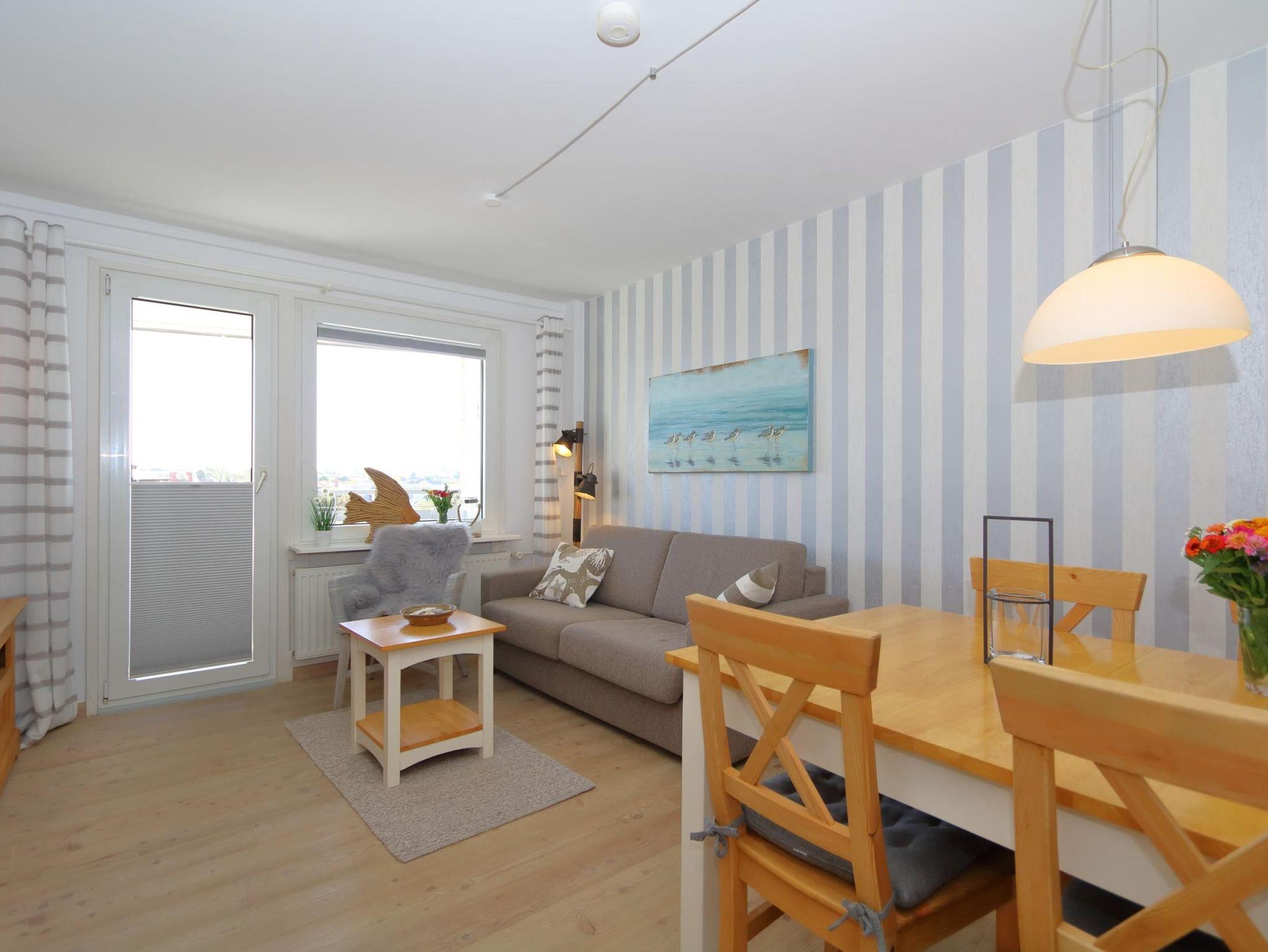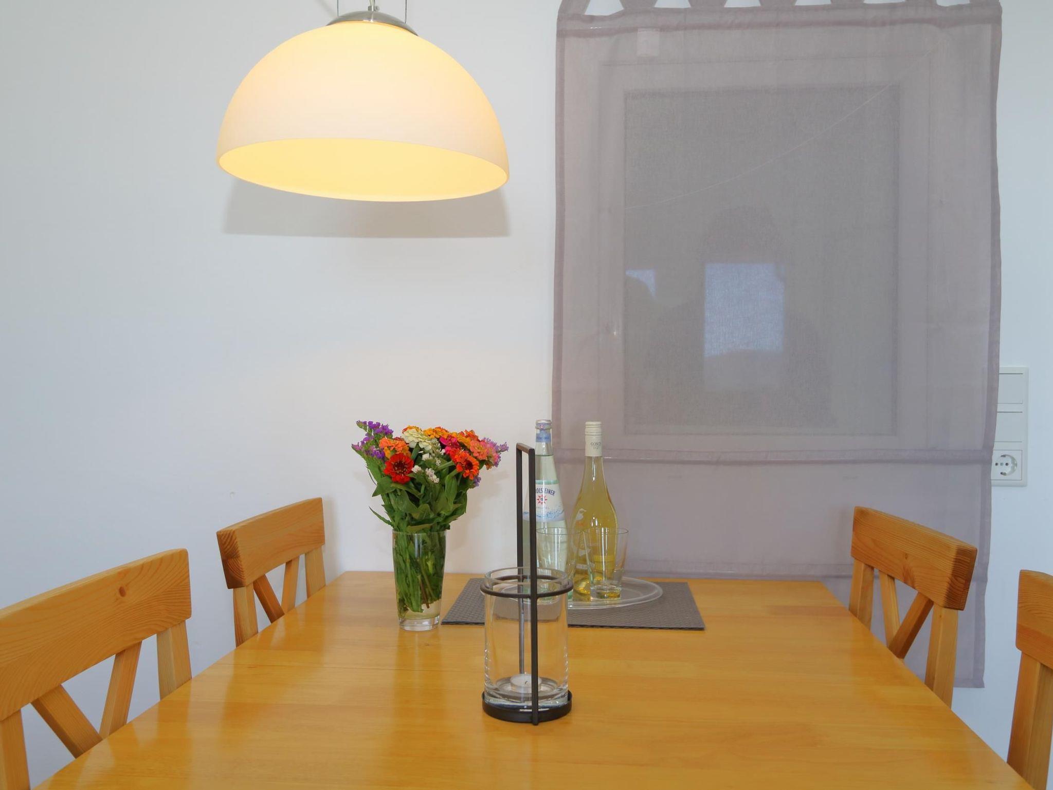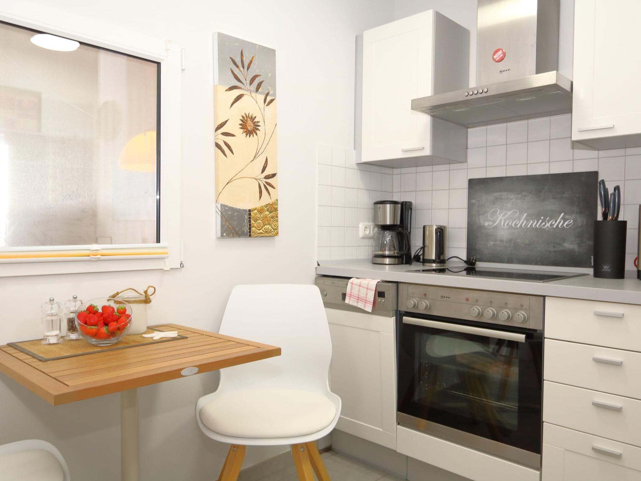 Die Küche ist sehr umfangreich ausgestattet. Das Geschirr ist für 4 Personen ausgelegt. Ein Backofen, Spülmaschine, Kühl- Gefrierschrank, Mikrowelle, Toaster, Filterkaffeemaschine, Padmaschine (Krupps Dolce-Gusto), viele weitere Utensilien zum Kochen/ Backen und vieles mehr gehören hier zum Standard .Ein kleiner Tisch mit Stühlen erweitert den Arbeitsbereich oder lädt zum Essen.