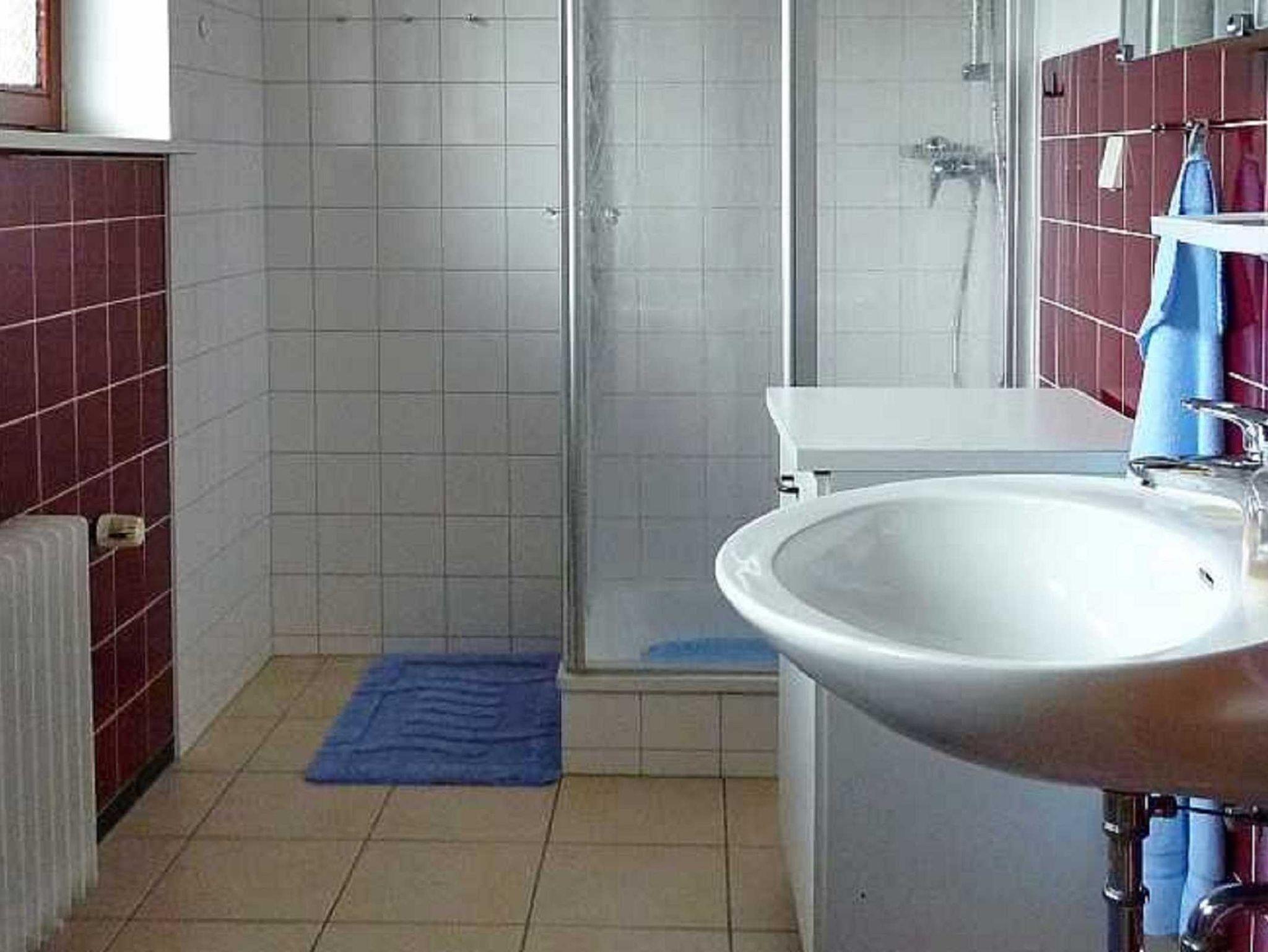 Ein helles Bad mit Waschbecken, WC, Dusche und Außenfenster.