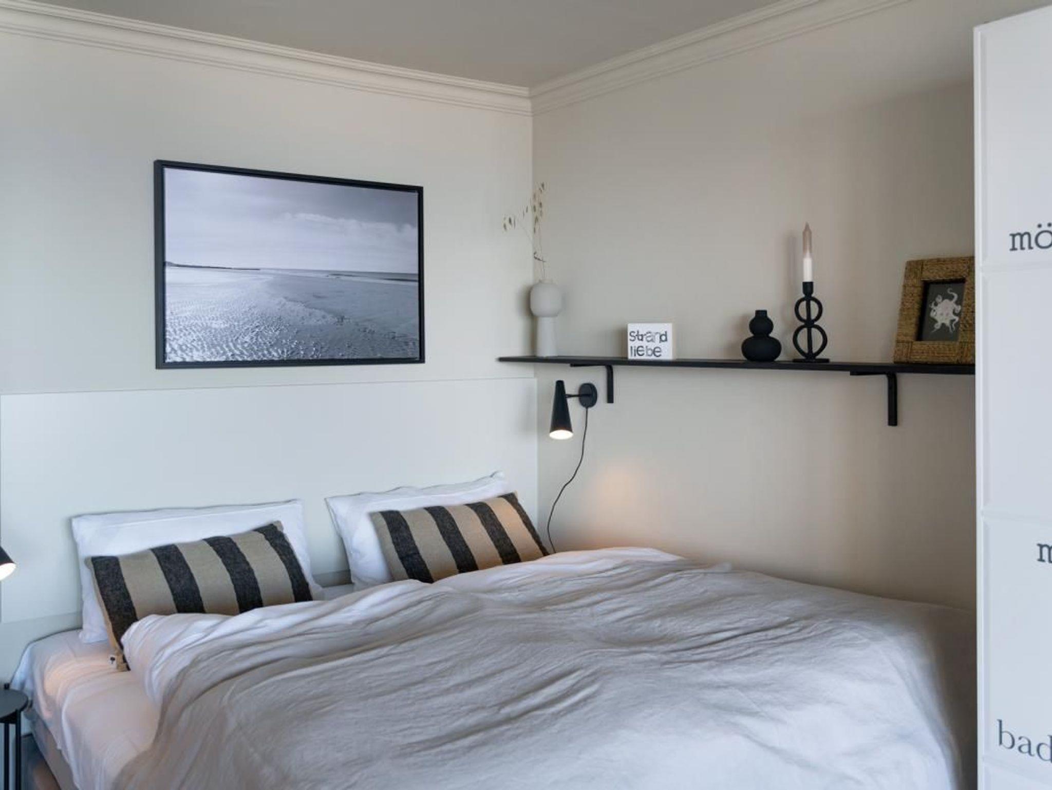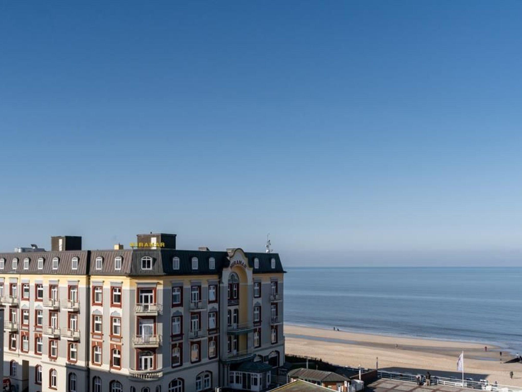 1-Zimmer-Appartement ca. 43 m² für 2 Personen. Das gut aufgeteilte Appartement verfügt über eine Küche, die nach Wunsch durch eine Tür bzw. einen Vorhang abgetrennt werden kann. Zudem hat die Ferienwohnung ein Badezimmer mit kleiner Duschwanne und mehreren Handtuchhalterungen. Durch den Flur gelangen Sie nun in den in den offenen Wohn-und Schlafbereich, der über große Fenster verfügt. Der Westbalkon ermöglicht es Ihnen, den Strand und das Meer über das Flachdach gut zu sehen. Zusätzlich kann man das Hotel Miramar und die Kurmuschel erkennen.