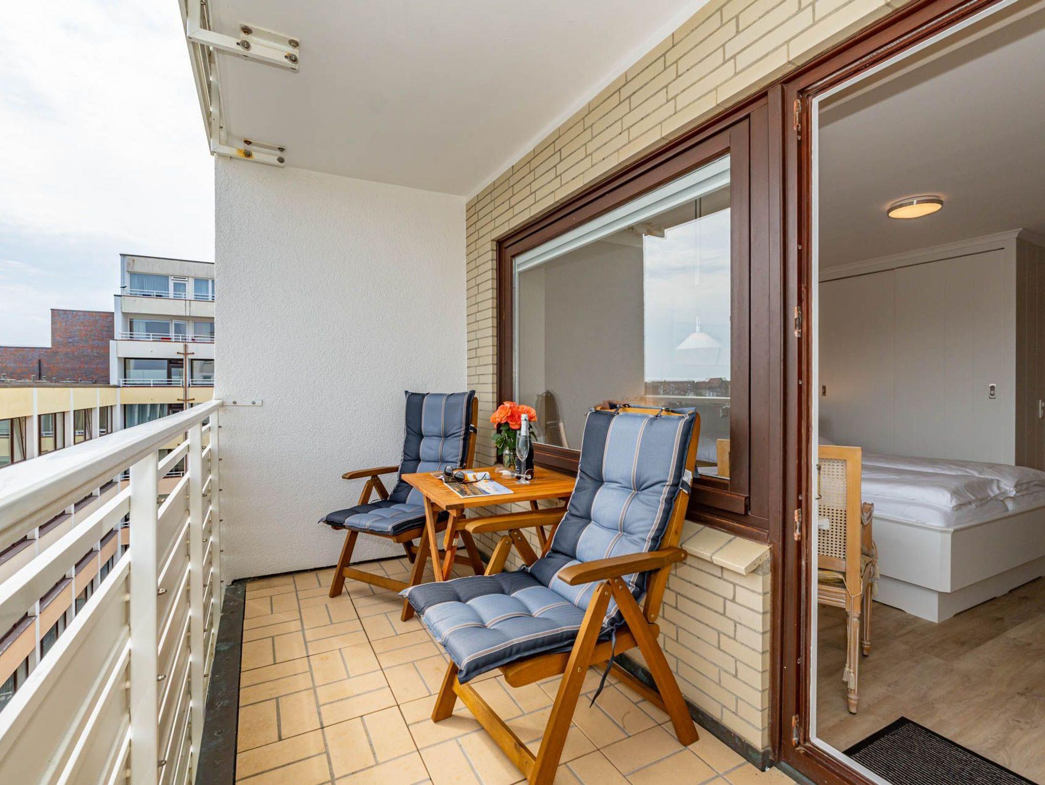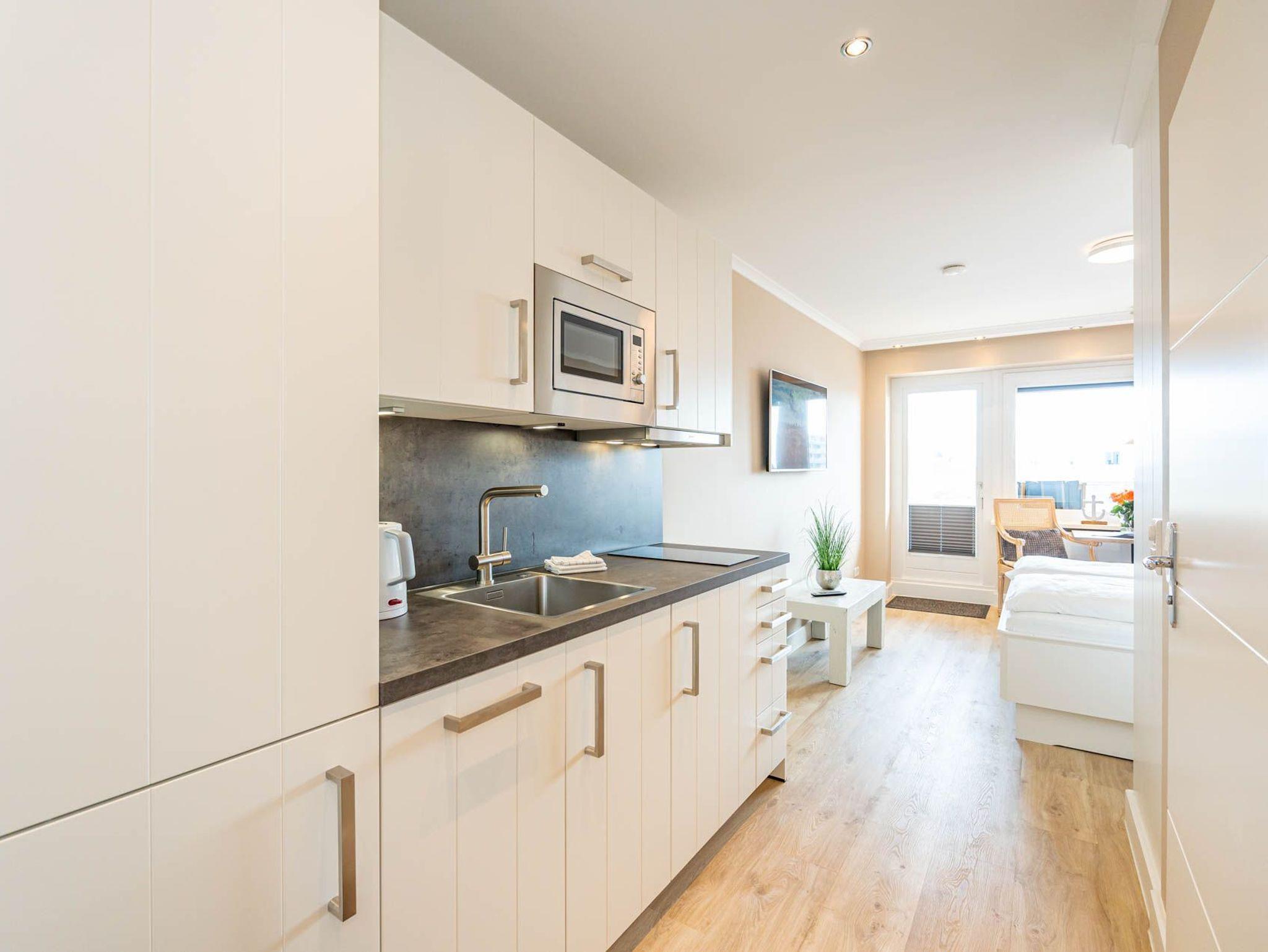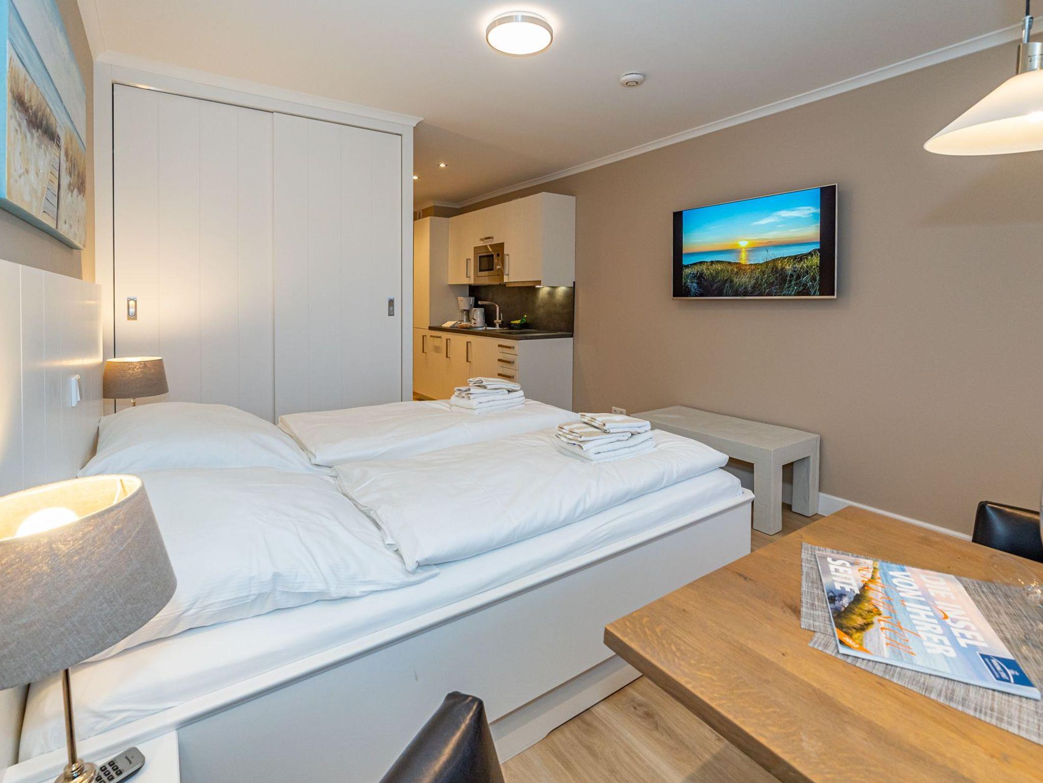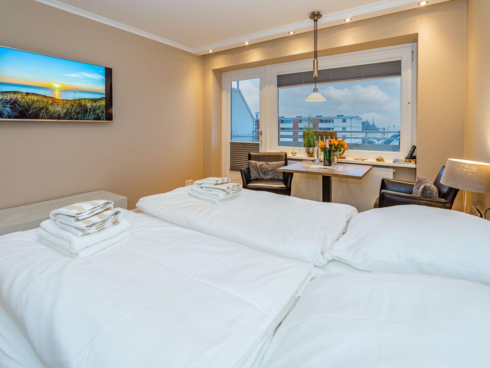 Aufwendig renovierte 1-Zimmer-Nichtraucher-Ferienwohnung mit modernem Designerboden in Holzoptik, ca. 24 qm in der 4. Etage (Fahrstuhl im Haus) zur Ostseite mit weitem Blick über Westerland. Kombinieter Wohn/Schlafraum mit feststehendem Tischler-Doppelbett (Liegefläche 1,60 x 2m, mit guten Einzelmatratzen), großer Flachbild-TV, Kleiderschrank, Essplatz am Fenster mit 2 bequemen Stühlen, WLAN und kostenlose Telefonie ins deutsche Festnetz (Handynummern gesperrt), offene neue Einbau-Küchenzeile mit Mikrowelle, Nespresso-Maschine, Ceranfeld (2 Kochfelder) und Spülmaschine. Kaffeemaschine, Wasserkocher und Toaster gehören zur Grundausstattung, Neues Duschbad/WC, Ostbalkon mit Balkonmöbeln (Hochlehner) und Auflagen (Morgensonne).