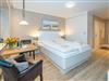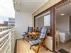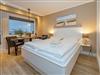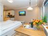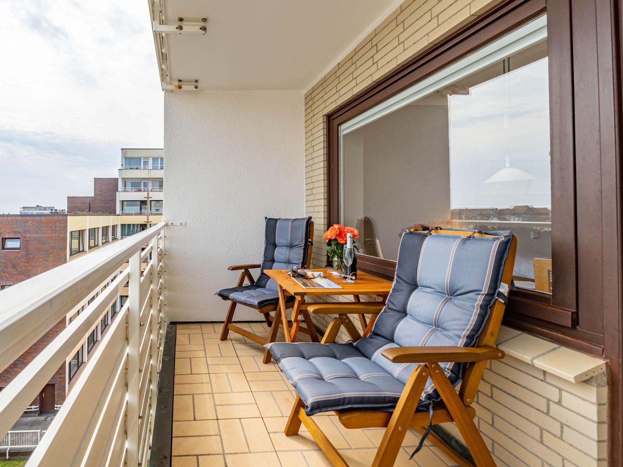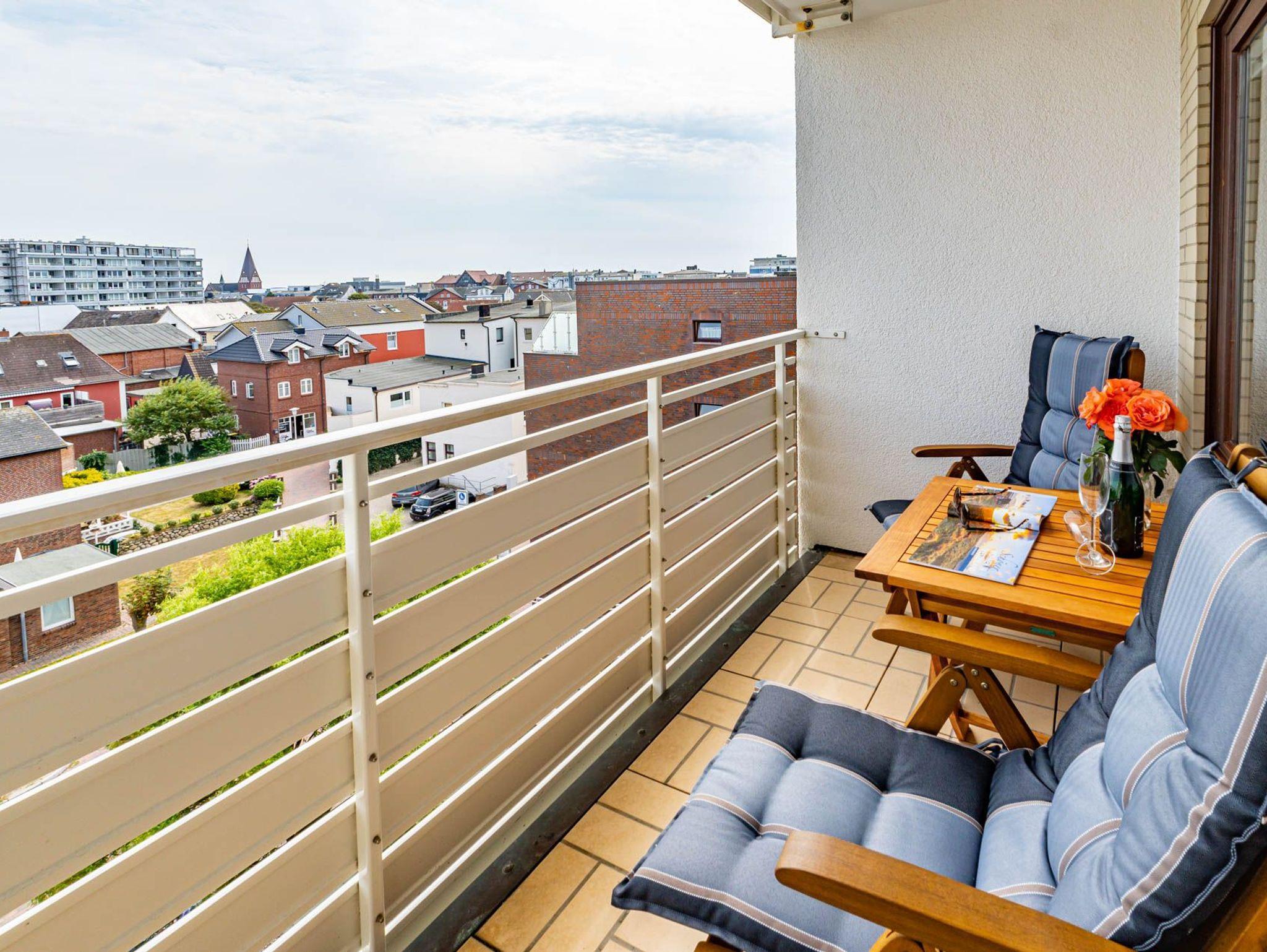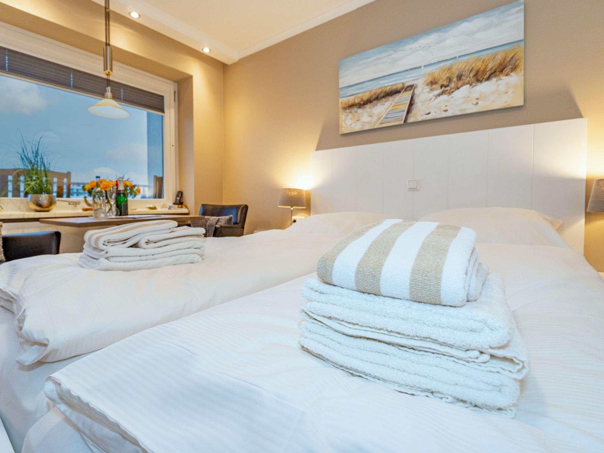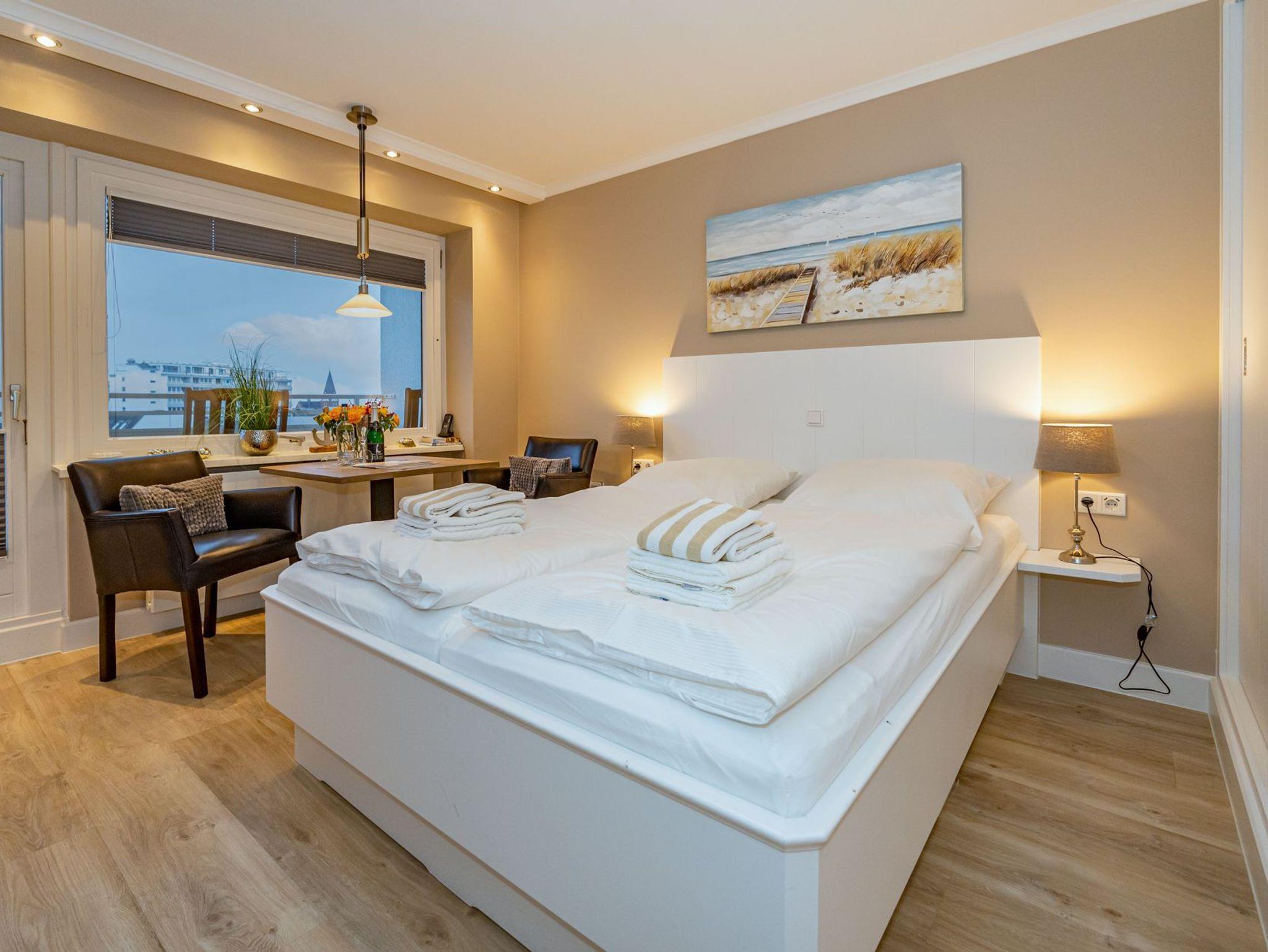Aufwendig renovierte 1-Zimmer-Nichtraucher-Ferienwohnung mit modernem Designerboden in Holzoptik, ca. 24 qm in der 4. Etage (Fahrstuhl im Haus) zur Ostseite mit weitem Blick über Westerland. Kombinieter Wohn/Schlafraum mit feststehendem Tischler-Doppelbett (Liegefläche 1,60 x 2m, mit guten Einzelmatratzen), großer Flachbild-TV, Kleiderschrank, Essplatz am Fenster mit 2 bequemen Stühlen, WLAN und kostenlose Telefonie ins deutsche Festnetz (Handynummern gesperrt), offene neue Einbau-Küchenzeile mit Mikrowelle, Nespresso-Maschine, Ceranfeld (2 Kochfelder) und Spülmaschine. Kaffeemaschine, Wasserkocher und Toaster gehören zur Grundausstattung, Neues Duschbad/WC, Ostbalkon mit Balkonmöbeln (Hochlehner) und Auflagen (Morgensonne).