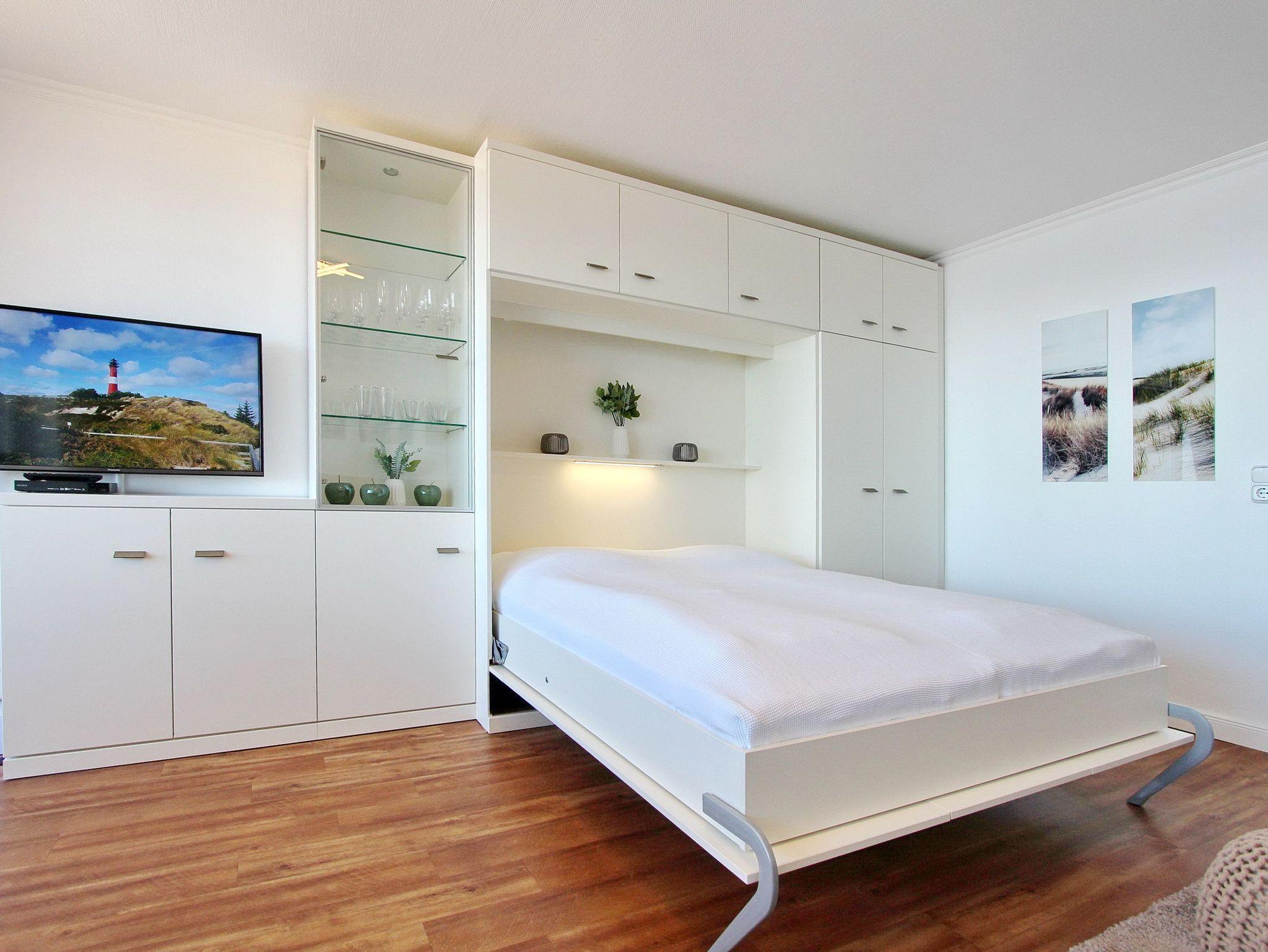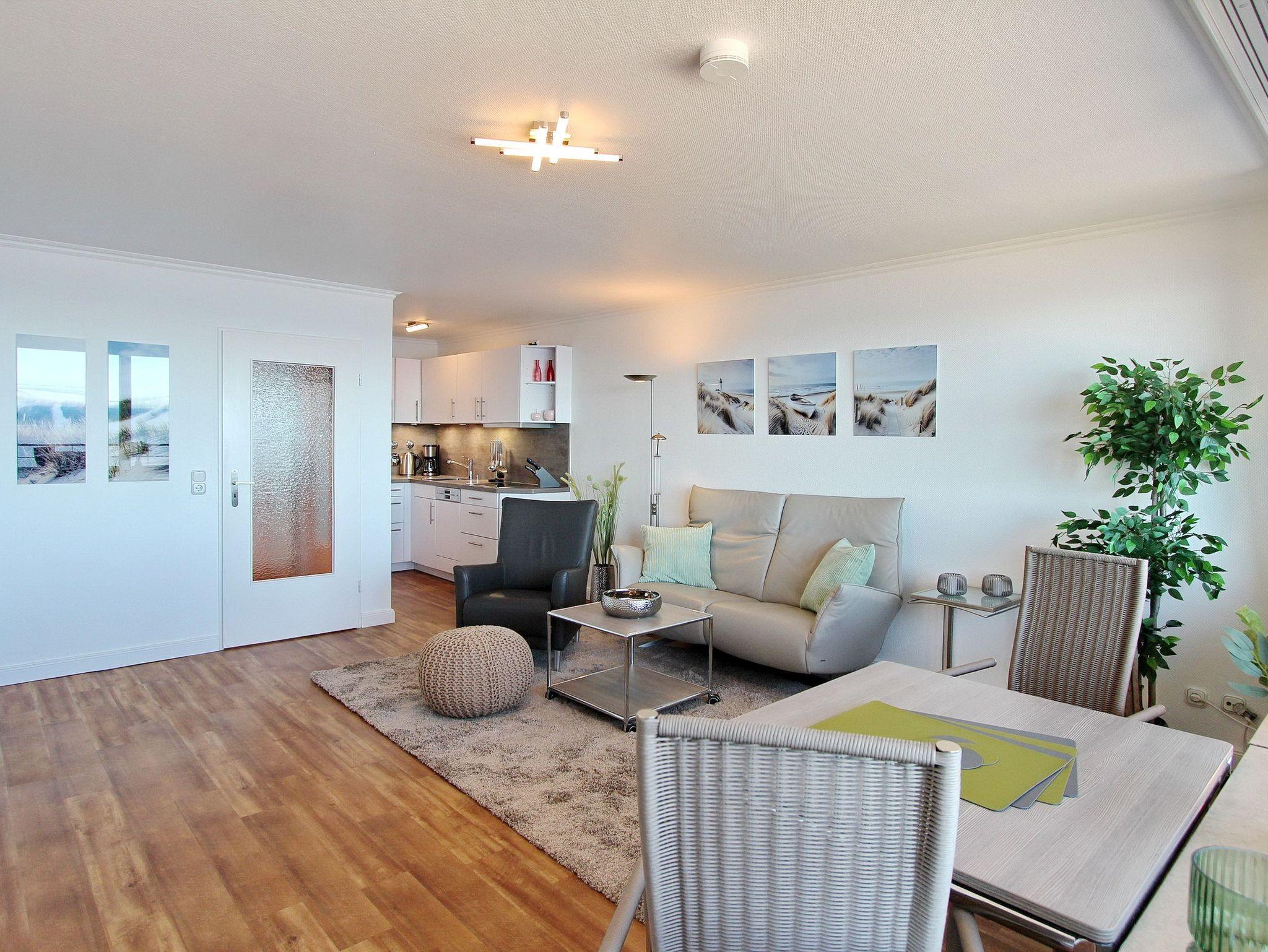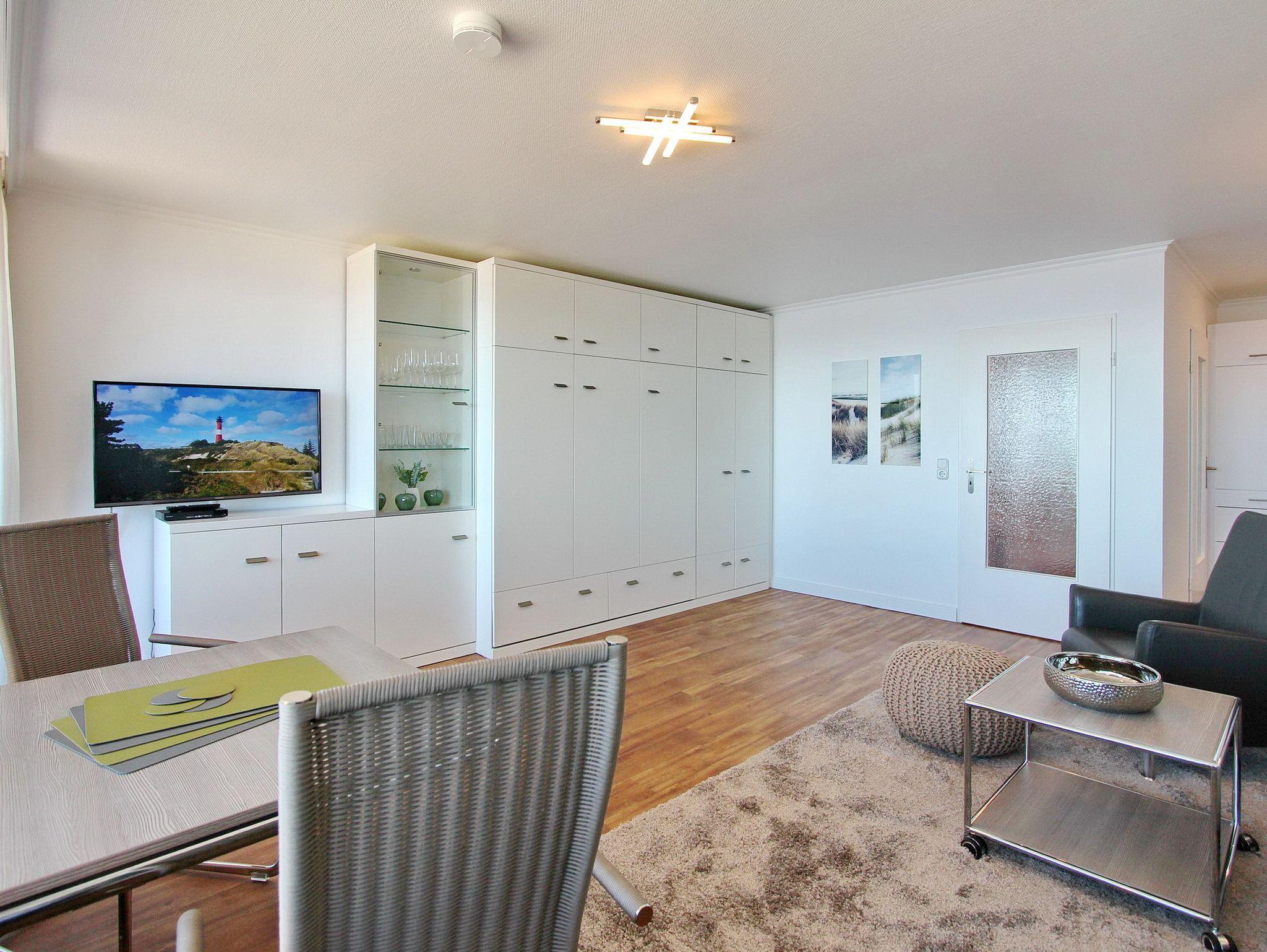 Diese gemütliche Einzimmerwohnung befindet sich in der 9. Etage des Haus Metropol und hat einen herrlichen Blick über den Strand und die Nordsee. Der hell und freundlich eingerichtete Wohn-/Schlafraum mit vorgelagertem Westbalkon verfügt über ein Doppelschrankbett, einen Essplatz mit 2 Stühlen am Fenster sowie eine bequeme Sitzgruppe mit 2er Sofa und Fernsehsessel. Der Holzfussboden verleiht dem Raum Wärme und Gemütlichkeit und in den Schränken ist ausreichend Stauraum für Ihre persönlichen Dinge. Im Badezimmer gibt es eine Dusche, einen Handtuchtrockner, Kosmetikspiegel und Fön. Die zum Wohnraum offene Küche verfügt über ein Ceranfeld mit 4 Herdplatten und einen Geschirrspüler. Moderne Küchengeräte der Firma WMF (z.B. Eierkocher, Smoothiemaker, Mixer) eine zusätzliche Nespresso Maschine und hochwertiges Geschirr und Gläser stehen Ihnen zur Verfügung. Zur technischen Ausstattung dieser Nichtraucherwohnung gehört: ein Flachbildfernseher der Firma LG, ein Bluray Player und eine Bluetoothanlage mit CD Spieler von Sony. Das freie WLAN Netzwerk (WEG Haus Metropol - Passwortfrei - ohne Gewähr) können Sie kostenfrei nutzen. Wohnungsgröße: ca. 42 m².