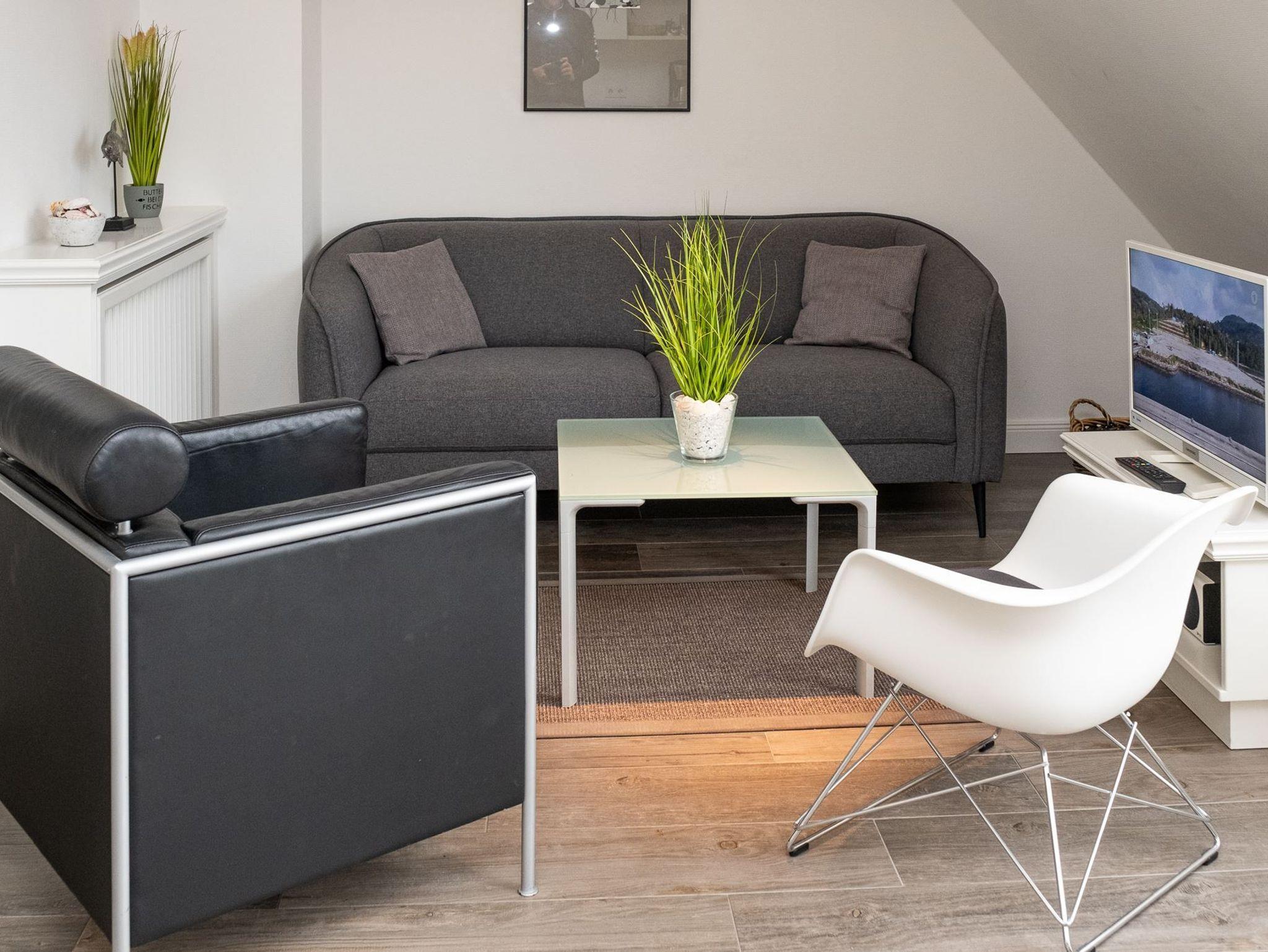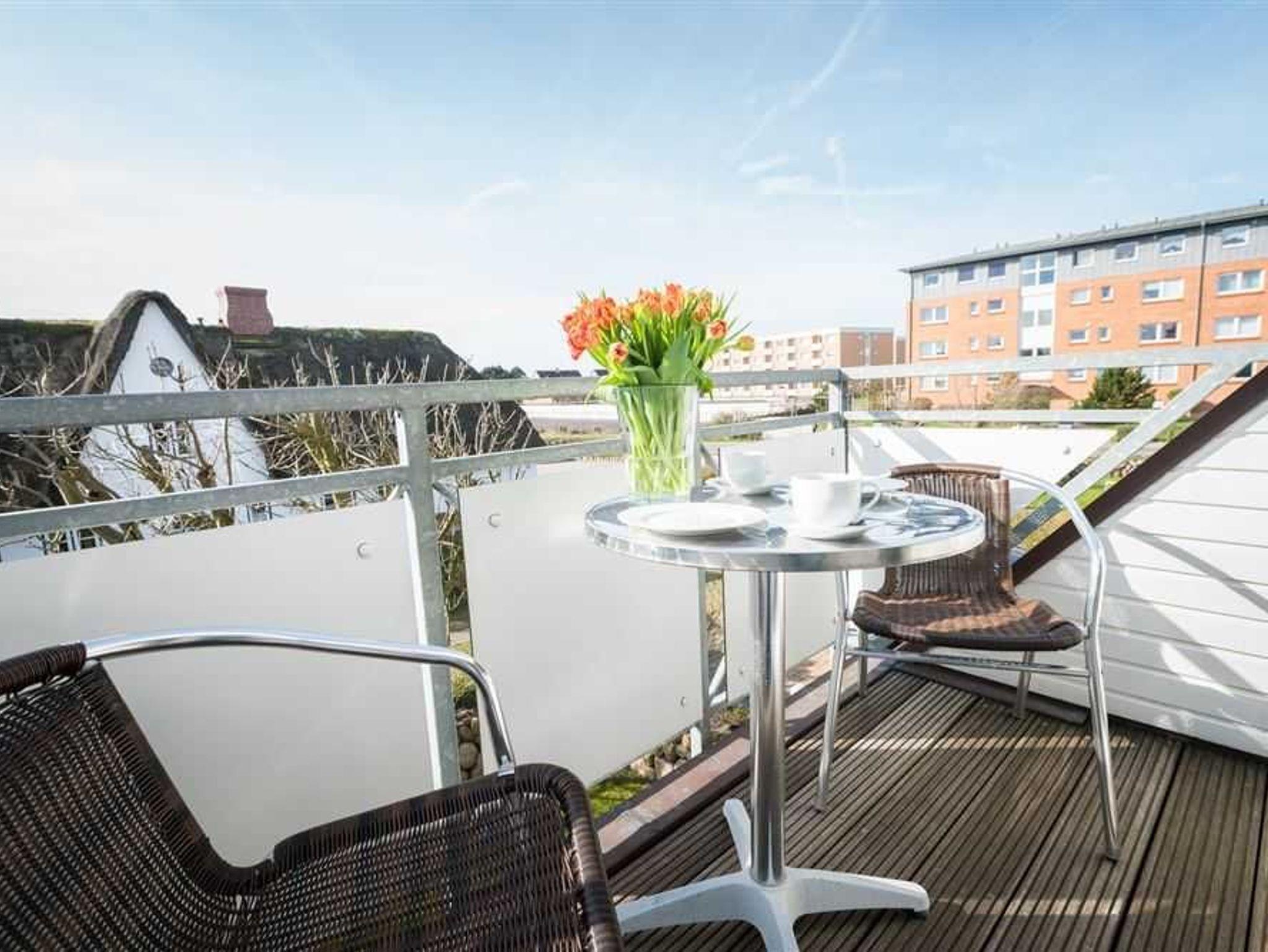 Wunderschön gelegene 3 Zimmer Obergeschosswohnung in Westerland auf Sylt. Die moderne Einrichtung kombiniert mit gutem Farbgefühl ,verschaffen Ihnen eine herrliche Urlaubsatmosphäre. Das lichtdurchflutete Wohnzimmer verfügt über eine bequeme Couch und einen gemütlichen Sessel. Angrenzend an den Wohnbereich befindet sich die großzügige und voll ausgestattete Küchenzeile mit einem bequemen Essplatz. Das Schlafzimmer verfügt über ein Doppelbett. Die Wohnung ist mit einem neuen Fußboden in Holzoptik ausgestattet. Zusätzlich zum eigenen Balkon können Sie auch die Sonnenkuhle im Garten nutzen. Diese ist mit einem Strandkorb ausgestattet. Sie erreichen fußläufig den Strand und das Südwäldchen in 5 Minuten, die Westerländer City in ca. 12 Minuten.