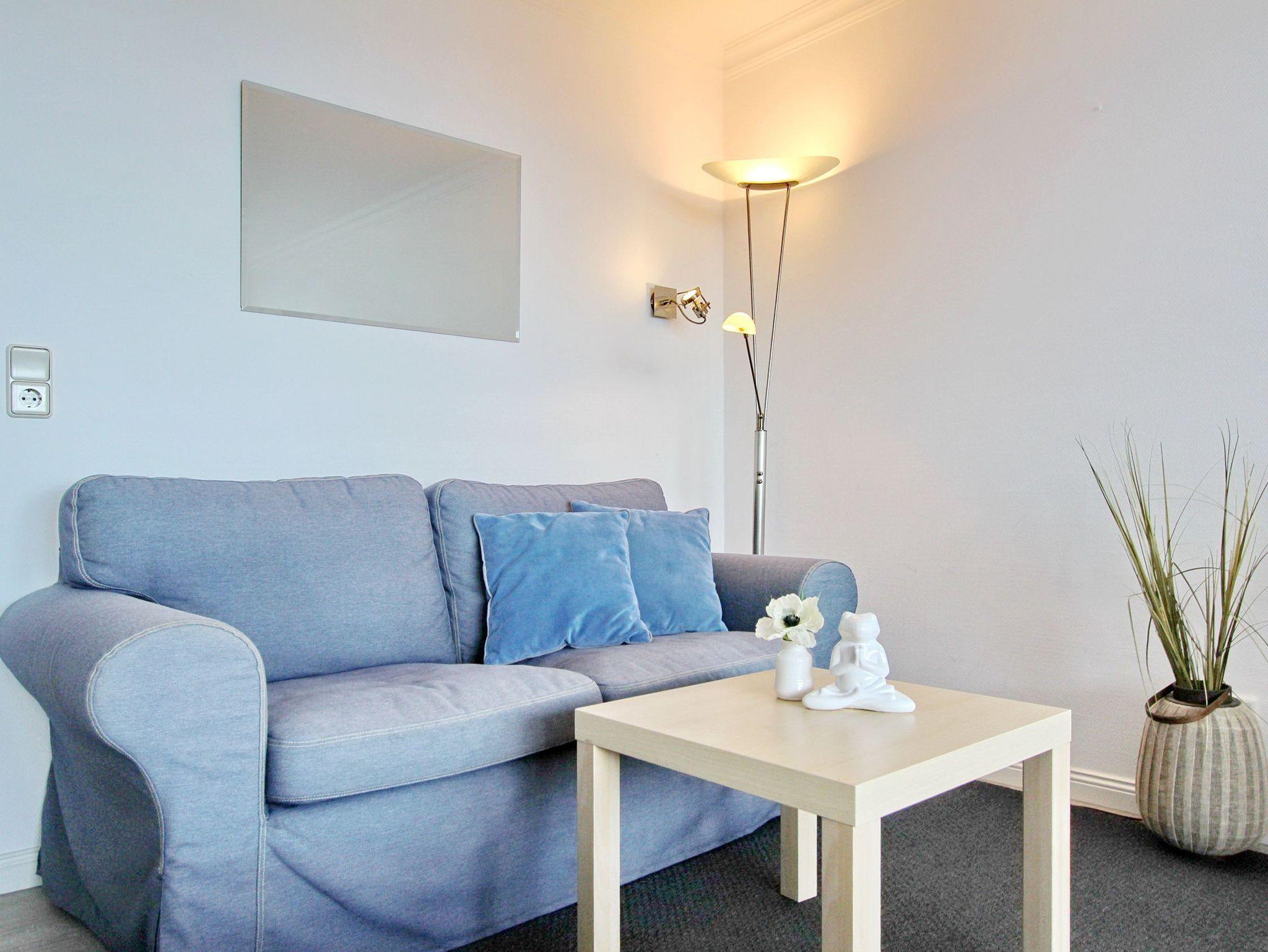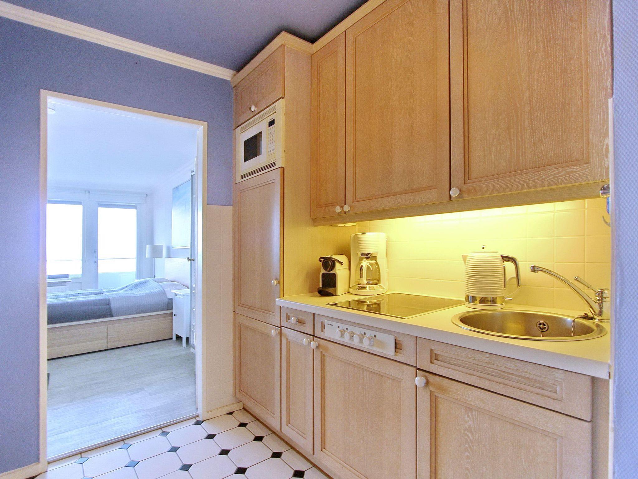 Hell und freundlich eingerichtetes 1 Zimmer Appartement in der 1. Etage im Haus am Meer mit Blick auf die Nordsee. Bequeme Loungemöbel auf dem Balkon laden zum Verweilen ein. Das Wohn-Schlafzimmer, mit vorgelagertem Westbalkon mit Meeresblick, verfügt über ein feststehendes Doppelbett mit 2 Matratzen, 2 Nachttischschränkchen und 2 Leselampen. Eine Couch, ein Kleiderschrank und ein Sideboard für die Unterbringung ihrer persönlichen Dinge ist ebenfalls vorhanden. Der Essplatz am Fenster mit 2 Stühlen bietet ihnen die Möglichkeit beim Essen auf die Nordsee zu schauen. Das im Frühjahr 2021 renovierte Badezimmer verfügt über eine große Dusche mit niedrigem Einstieg, Handtuchtrockner und Fön. Die Küchenzeile mit Mikrowelle und Ceranfeld, sowie zusätzlicher Nespresso Maschine, befindet sich im Flur. Zur technischen Ausstattung gehört: ein Smart-Flachbildfernseher, ein DVD Player, eine Smartphone Ladestation, ein Radiowecker und eine Bluetooth Anlage mit CD Spieler von Sony. Ein kostenloser WLAN Zugang (WEG Haus am Meer - Passwortfrei - ohne Gewähr) steht ihnen zur Verfügung. Vierbeinige Sylturlauber sind ausdrücklich willkommen in dieser ca. 34 m² großen Wohnung.