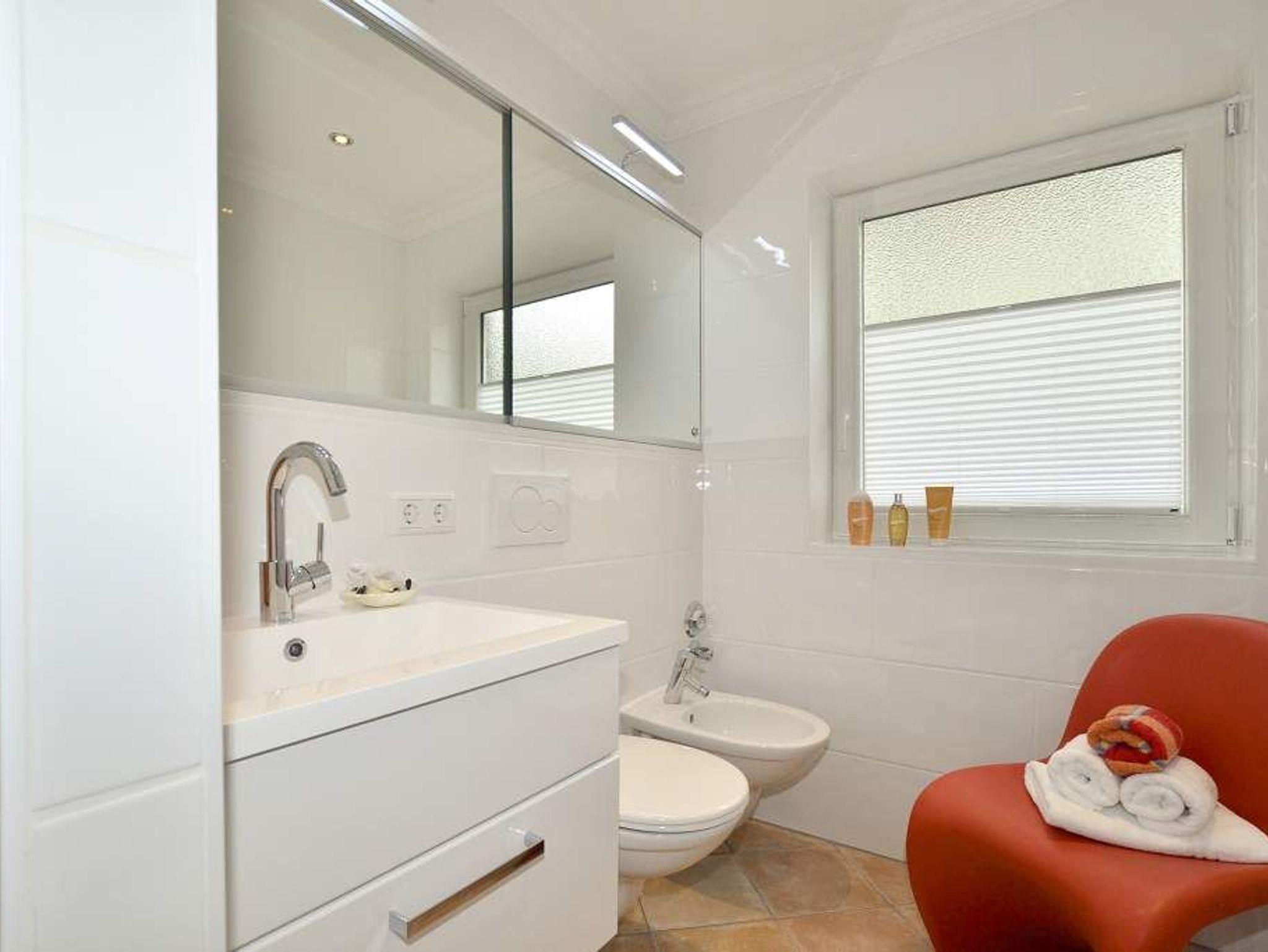 Das modern gestaltete Badezimmer verfügt über eine barrierefreie, mit Granit ausgelegte Dusche, Bidet, WC, einen geräumigen Waschtisch mit Unterschrank sowie einen raumbreiten Spiegelschrank mit integrierten Steckdosen ? ideal für Rasierer und elektrische Zahnbürsten. Ein Handtuchtrockner, Fön und separat zuschaltbare Beleuchtung runden den eleganten Gesamteindruck ab.
