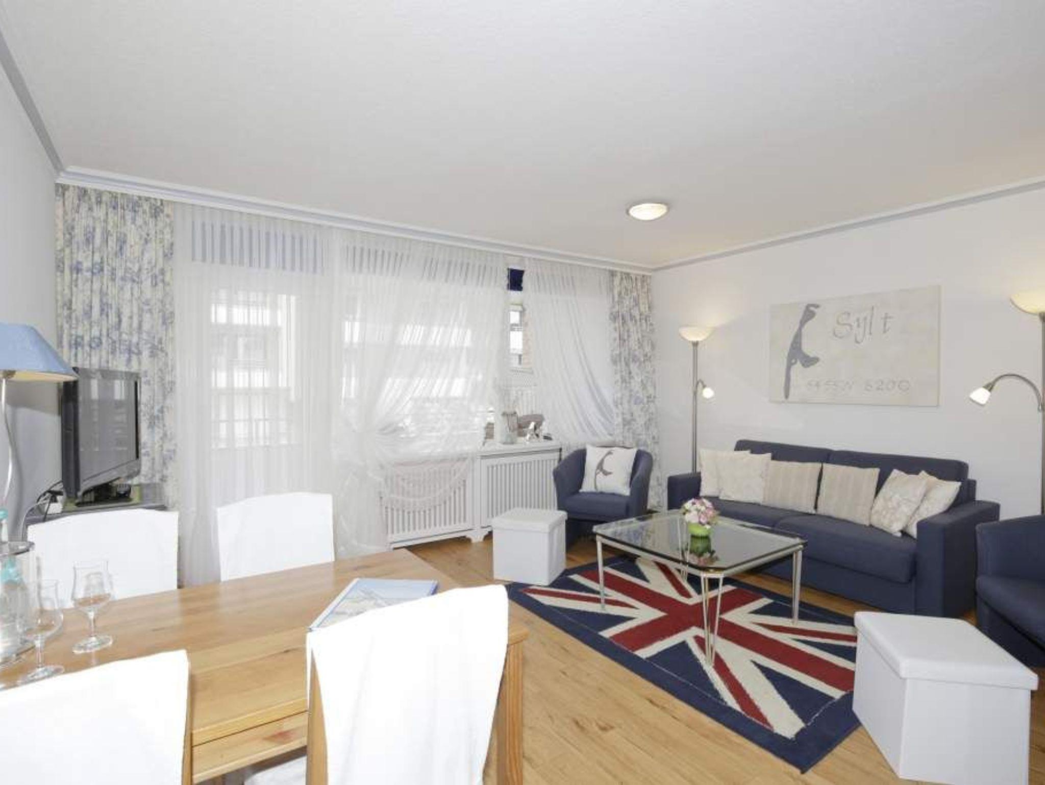 Der gemütliche Wohnbereich ist mit einer komfortablen Sitzgarnitur (3-Sitzer-Couch mit Schlaffunktion) sowie zwei Sesseln, einem separaten Essplatz, Flachbild-TV, Telefon mit Flatrate ins deutsche Festnetz und kostenfreiem WLAN (Vodafone, ohne Gewähr) ausgestattet. Von hier aus gelangen Sie direkt auf die sonnige Westloggia mit Balkonmöbeln, Auflagen und eigenem Strandkorb ? perfekt für entspannte Nachmittage in der Sonne.