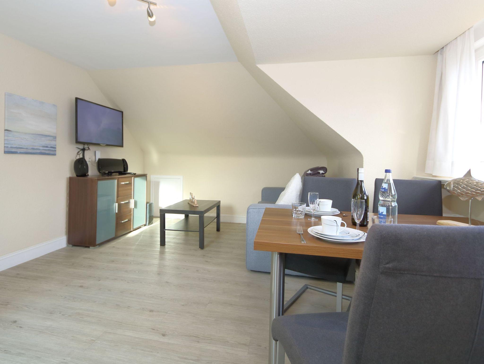 Im Wohnzimmer ist eine bequeme Schlaf-Couchgarnitur mit Clubtisch und Sessel. Eine kleine Eßecke für 4 Personen schließt sich daran an.