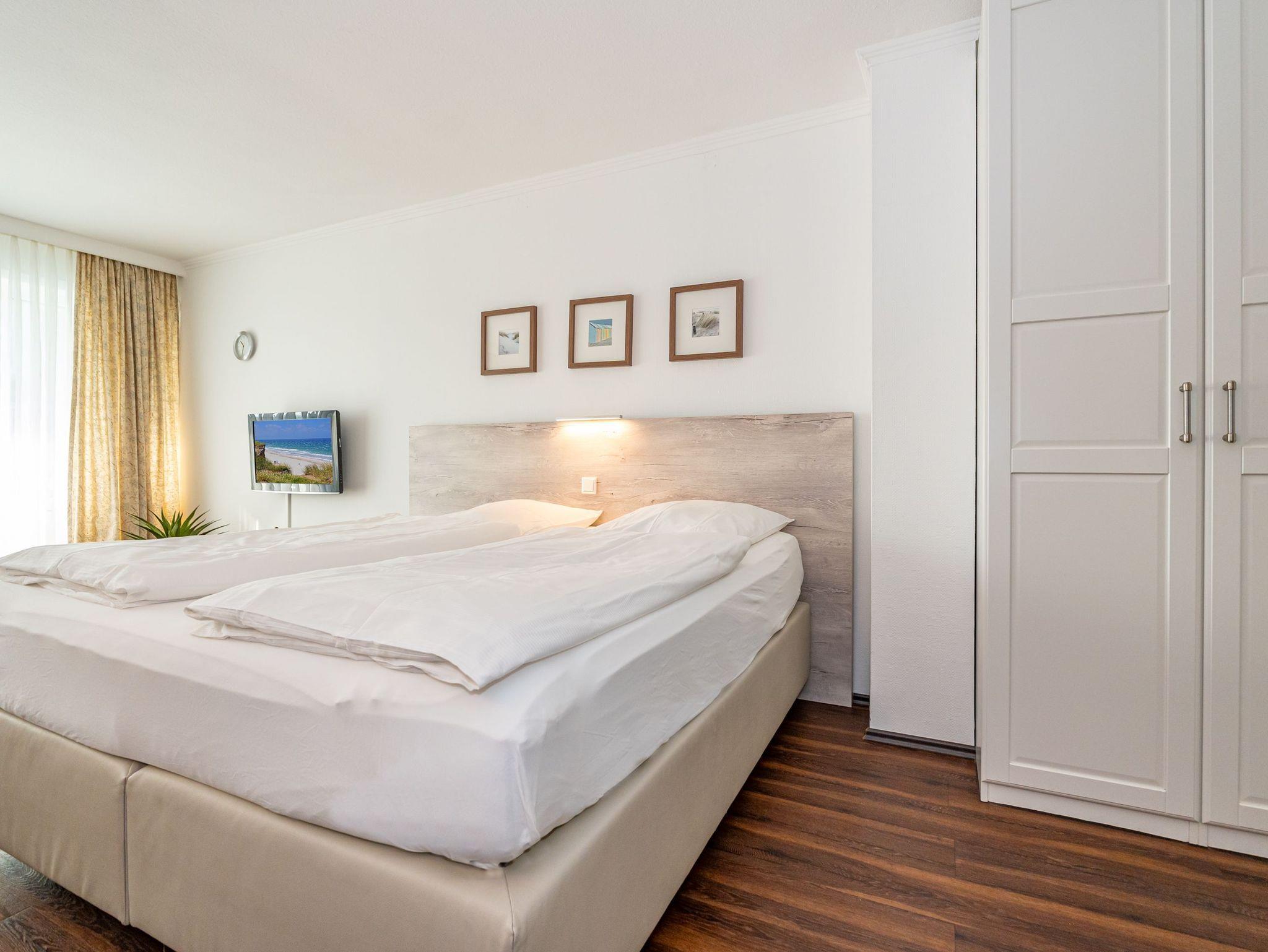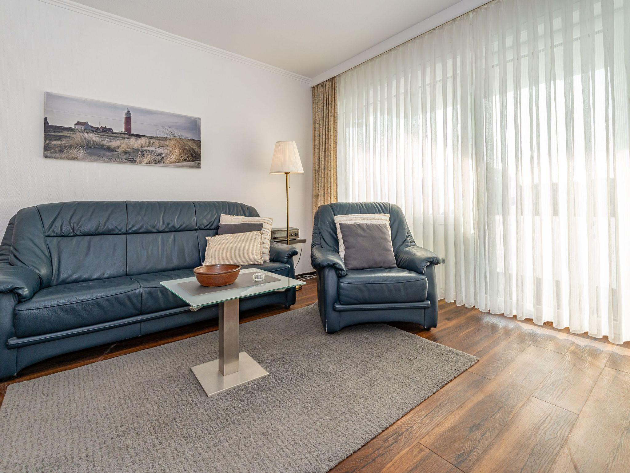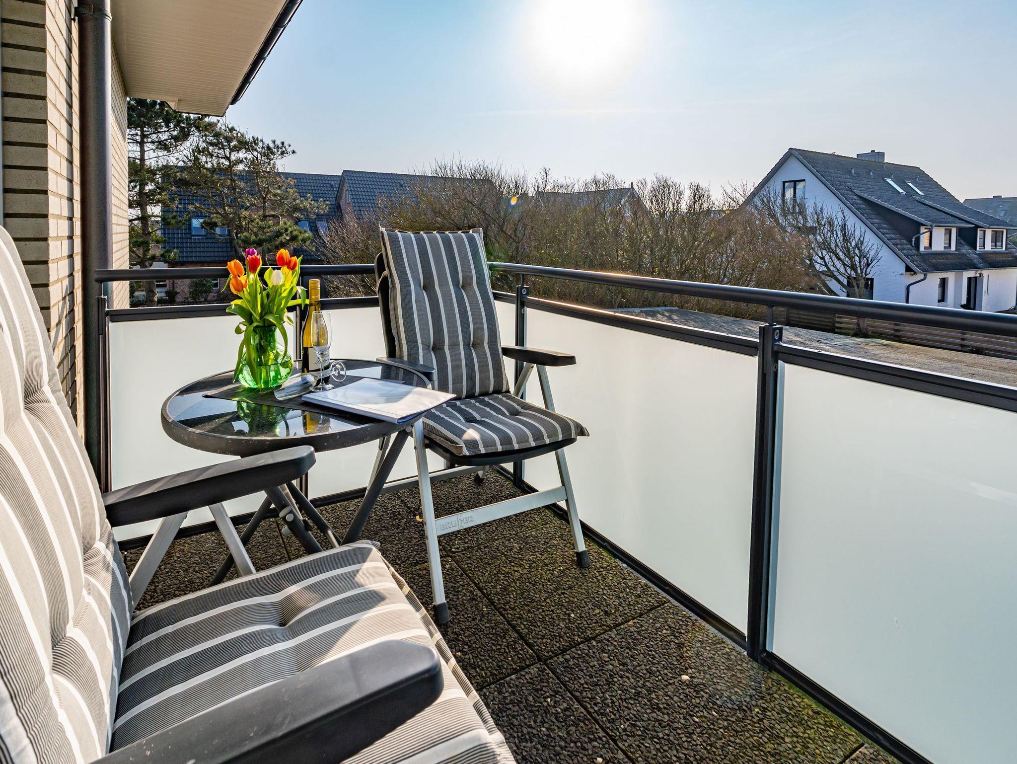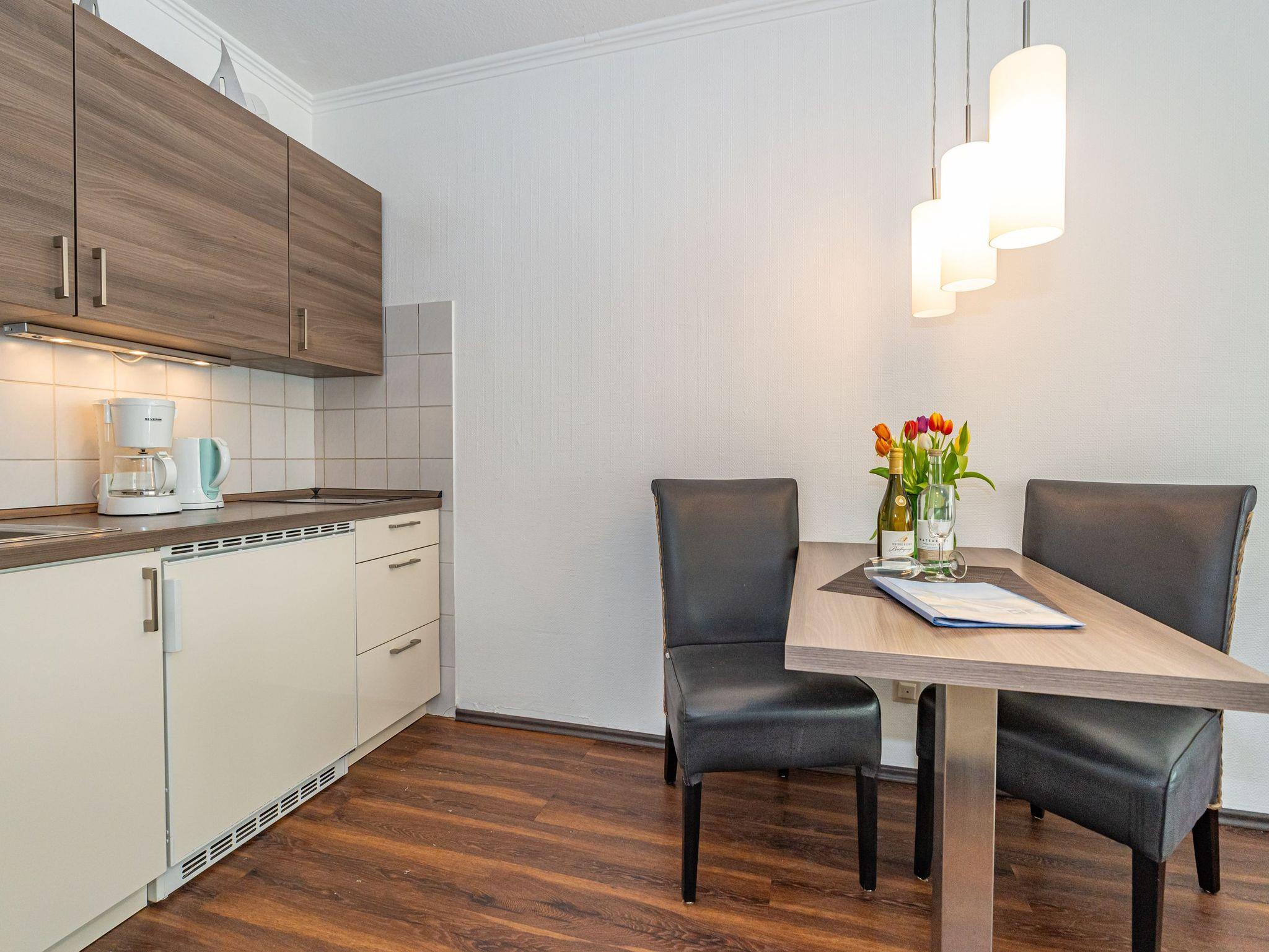 Gepflegte 1-Zimmer-Nichtraucher-Ferienwohnung (ca. 40 qm) mit optimalem Grundriss in der 1.Etage für 2 Personen mit großzügigem, sonnigen Westbalkon (mit Balkonmöbeln und Auflagen) und eigenem PKW-Stellplatz in der Tiefgarage. Vom Vorflur mit Garderobe gelangt man in den kombinierten Wohn-/Schlafraum mit Austritt zum Balkon und in das moderne, neuwertige Duschbad/WC. Der Wohn-/Schlafraum besteht aus einer gemütlichen Ledersitzgarnitur (ein Zweisitzer und ein Sessel), einer separaten Essecke und gutem Doppelbett (Boxspringbett (1,80 x 2 m) mit Einzelmatratzen + Topper, Komfortliegehöhe), Kabel-Flachbild-TV, Radio, Wlan und offener Küchenzeile. Kaffeemaschine, Wasserkocher und Toaster gehören zur Grundausstattung.