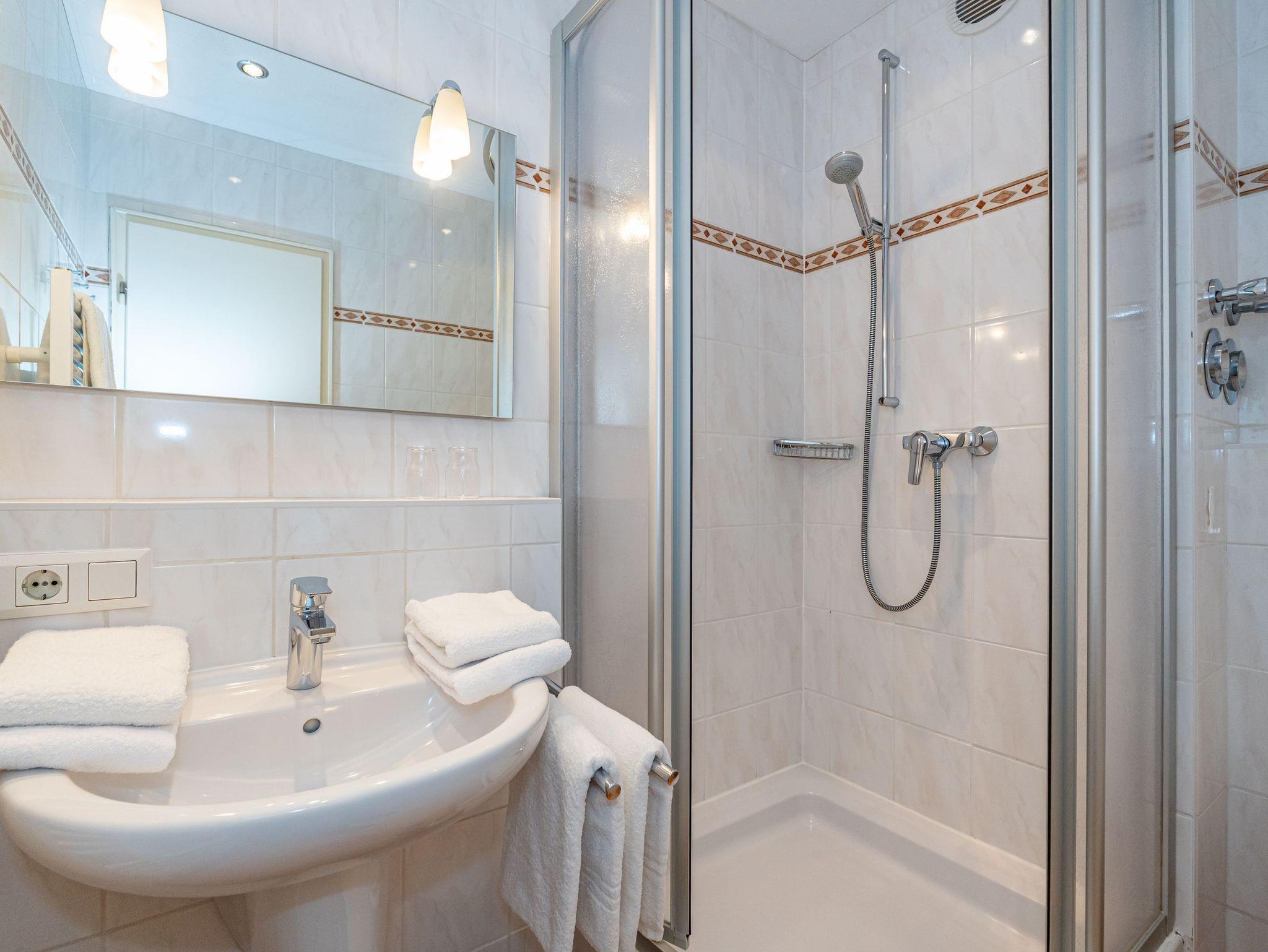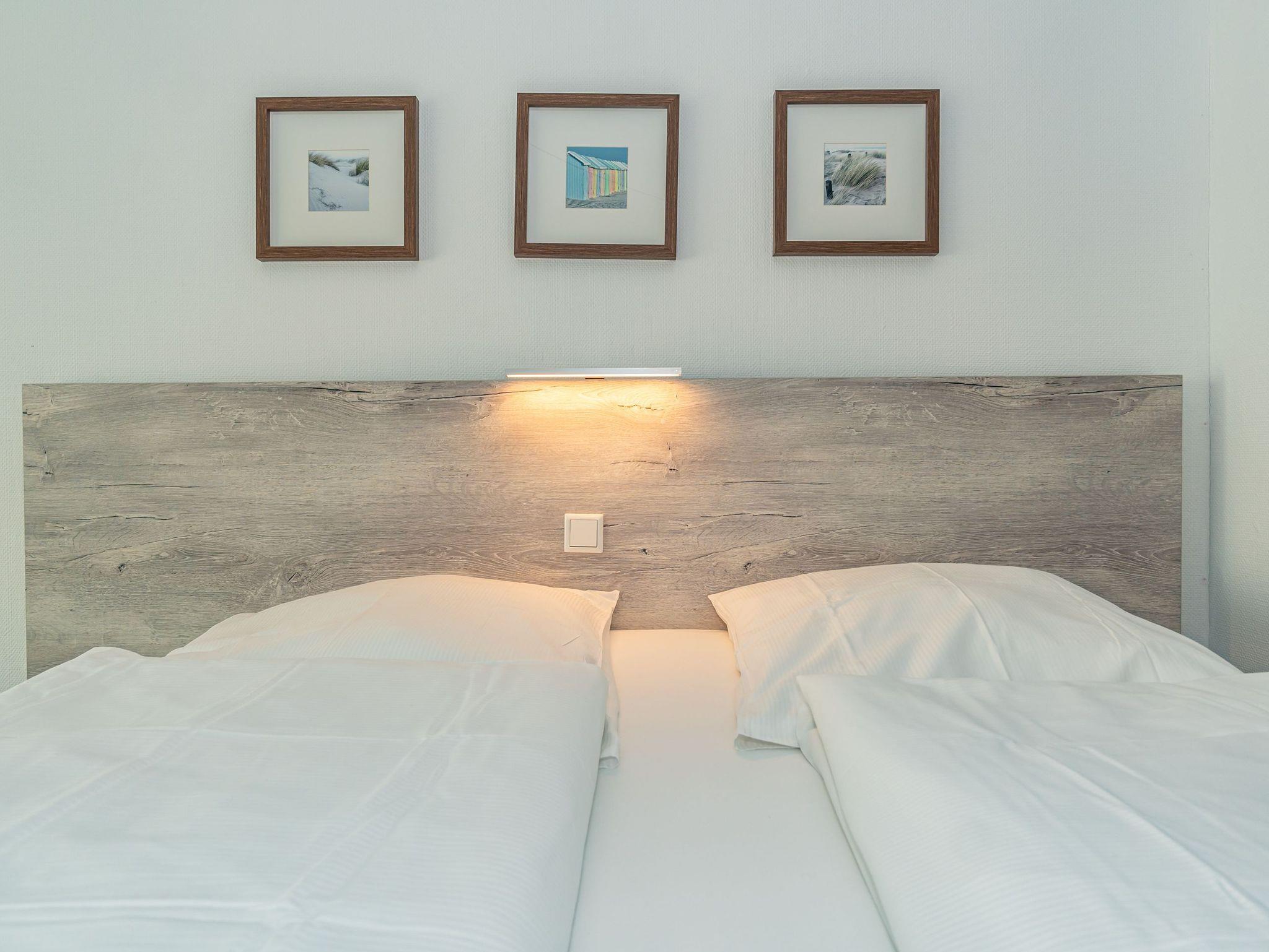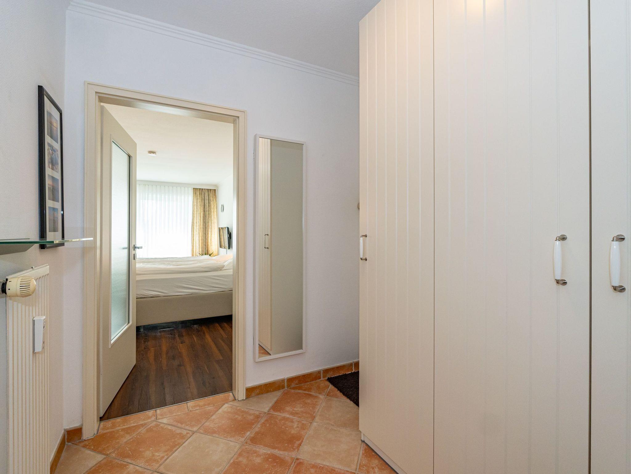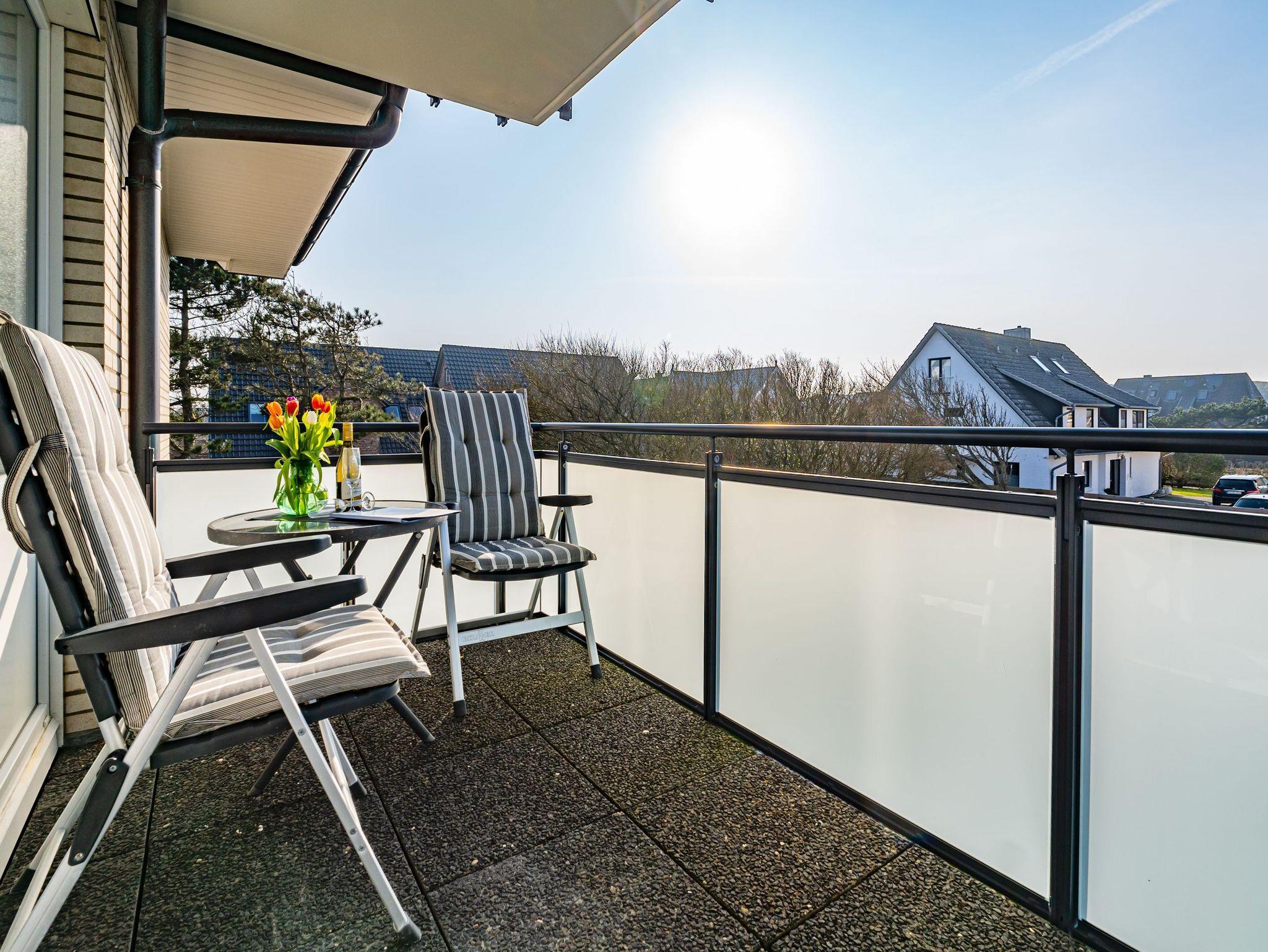 Gepflegte 1-Zimmer-Nichtraucher-Ferienwohnung (ca. 40 qm) mit optimalem Grundriss in der 1.Etage für 2 Personen mit großzügigem, sonnigen Westbalkon (mit Balkonmöbeln und Auflagen) und eigenem PKW-Stellplatz in der Tiefgarage. Vom Vorflur mit Garderobe gelangt man in den kombinierten Wohn-/Schlafraum mit Austritt zum Balkon und in das moderne, neuwertige Duschbad/WC. Der Wohn-/Schlafraum besteht aus einer gemütlichen Ledersitzgarnitur (ein Zweisitzer und ein Sessel), einer separaten Essecke und gutem Doppelbett (Boxspringbett (1,80 x 2 m) mit Einzelmatratzen + Topper, Komfortliegehöhe), Kabel-Flachbild-TV, Radio, Wlan und offener Küchenzeile. Kaffeemaschine, Wasserkocher und Toaster gehören zur Grundausstattung.