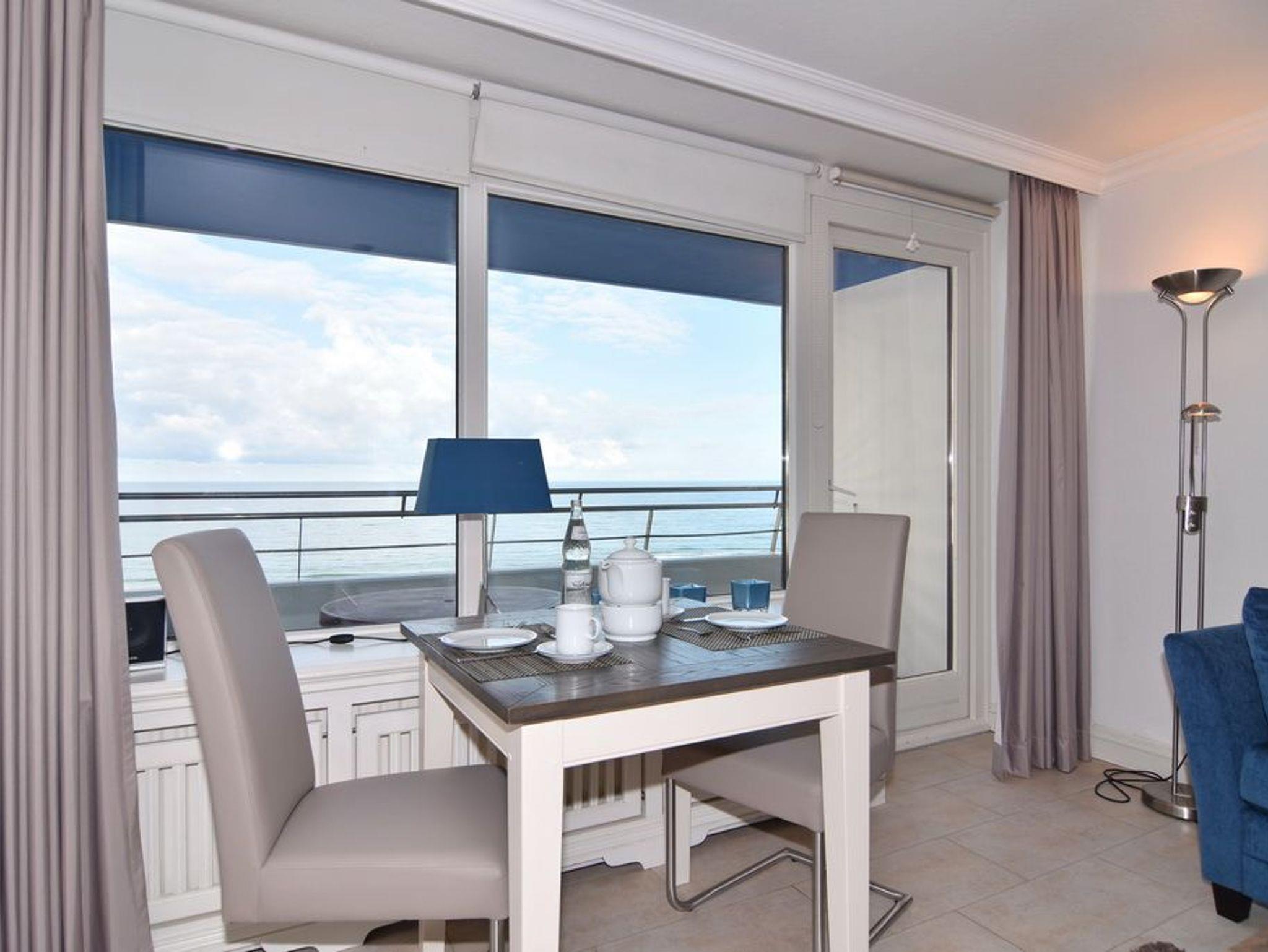 Hübsche, komplett geflieste 1-Zimmer-Ferienwohnung im 6.OG des Haus Sylter Welle. Nichtraucher-App. Unverbaubarer Blick auf die Nordsee. Ca. 34m². Wohn- und Schlafraum mit eingebautem Podest-Doppelbett (1.60 m. breit, 2 Matratzen á 80 cm.). Essplatz am Fenster. 2-Sitzer-Couchecke mit Beistelltisch. Kabel-TV, Radio. W-Lan (ohne Gewähr) Helles Badezimmer mit Dusche und WC. Küchenzeile im Flurbereich. Großer Westbalkon mit Balkonmöbeln. Tierhaltung ist nicht gestattet. Bettwäsche und Handtücher sind zur Anreise aufgezogen. Ein PKW-Stellplatz kann kostenpflichtig zugebucht werden.