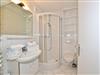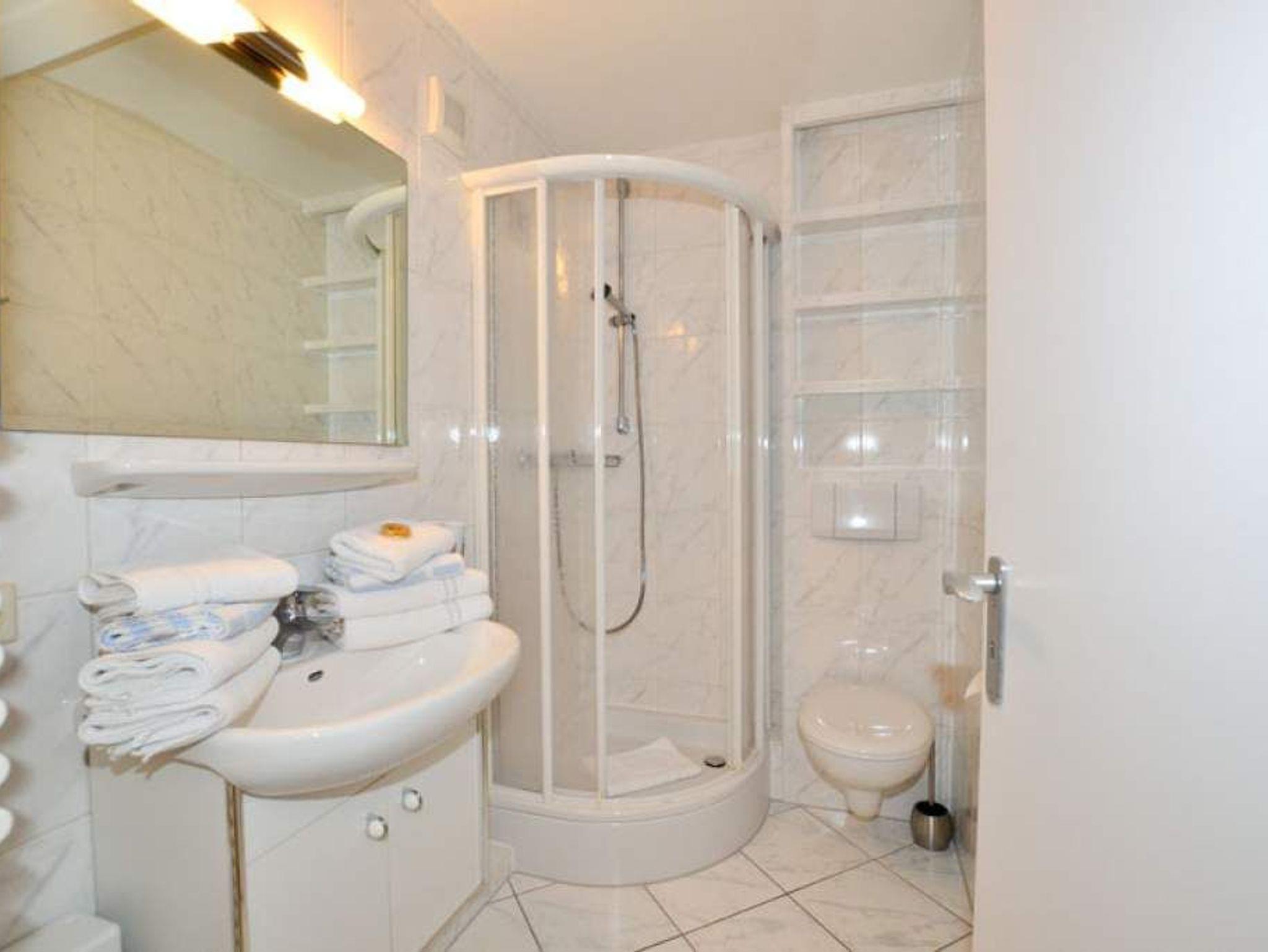 Im Bad befinden sich eine Dusche, ein WC, ein Waschtisch und ein Handtuchtrockner.