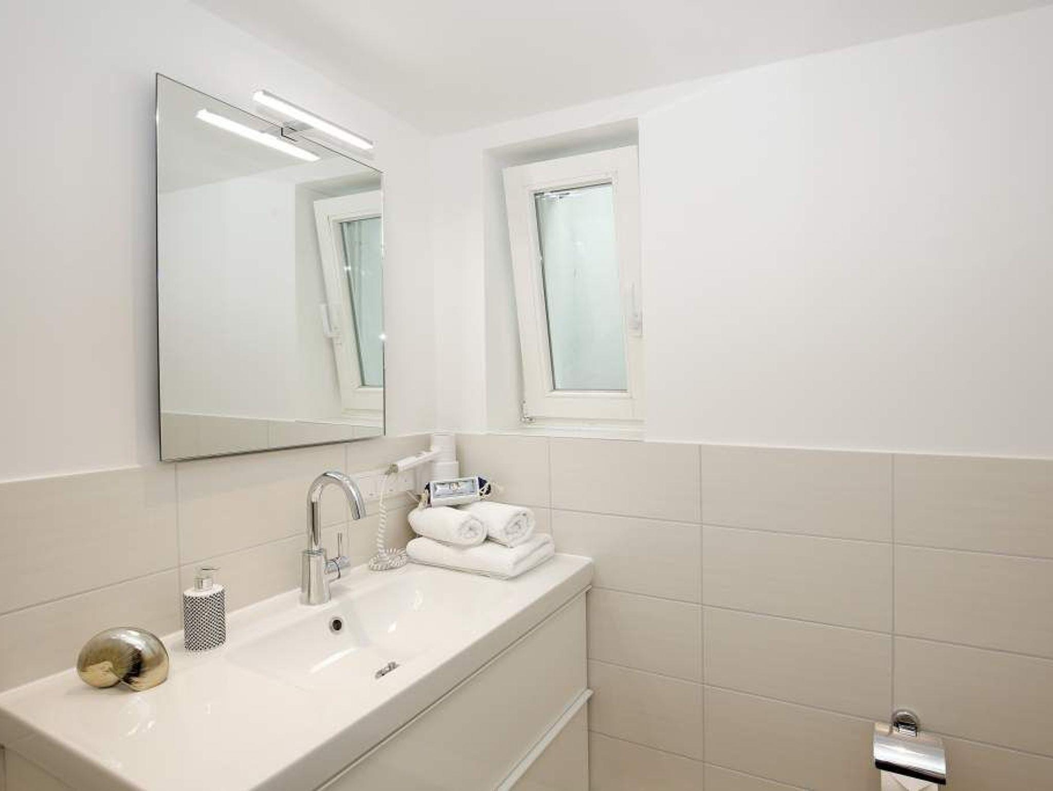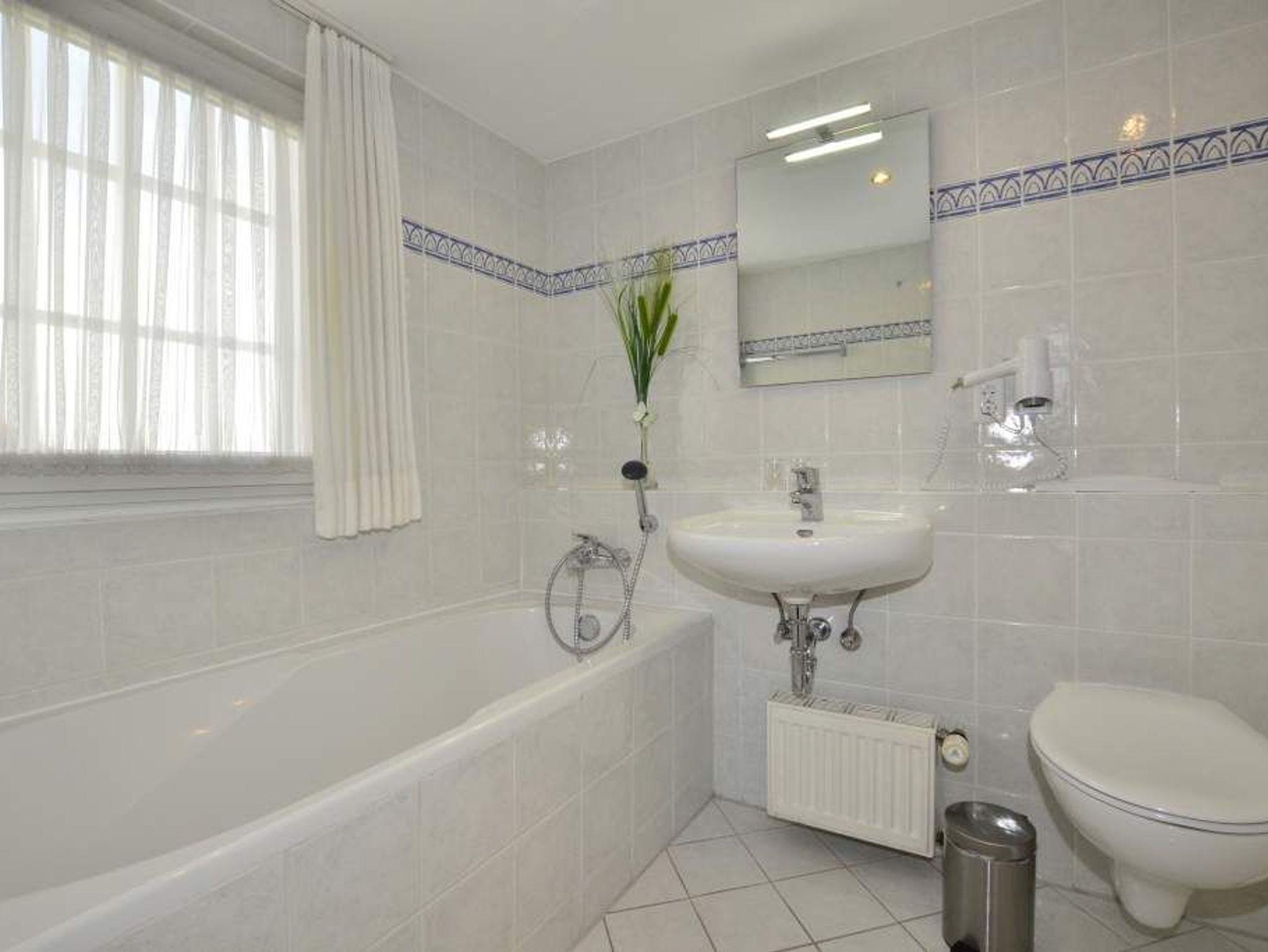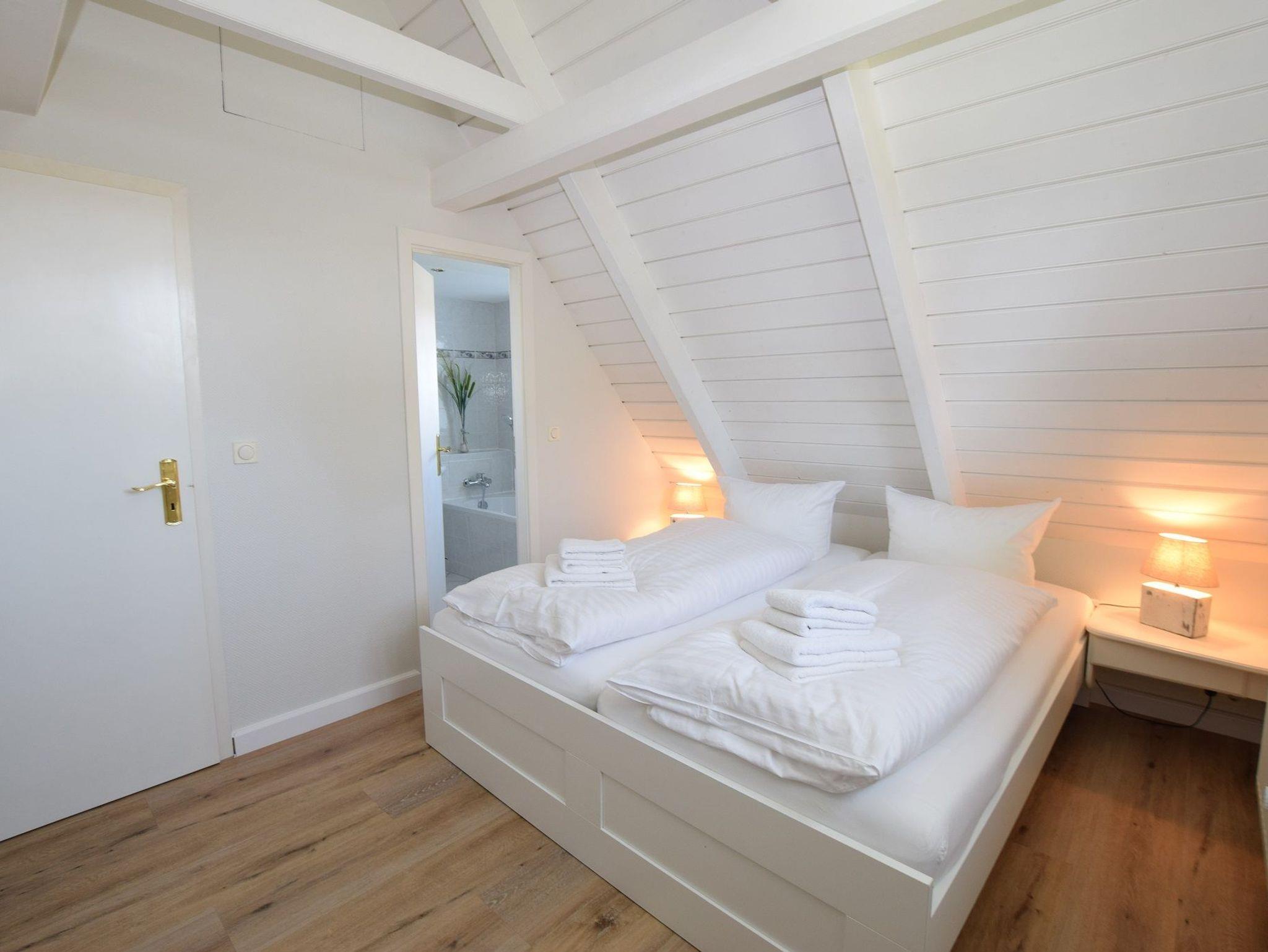 Das 1. geräumige Schlafzimmer (Vinylboden) hat ein gutes Doppelbett (Einzelmatratzen 0,90 x 2,00 m) und Flachbild-TV sowie ein schickes Wannenbad/WC.