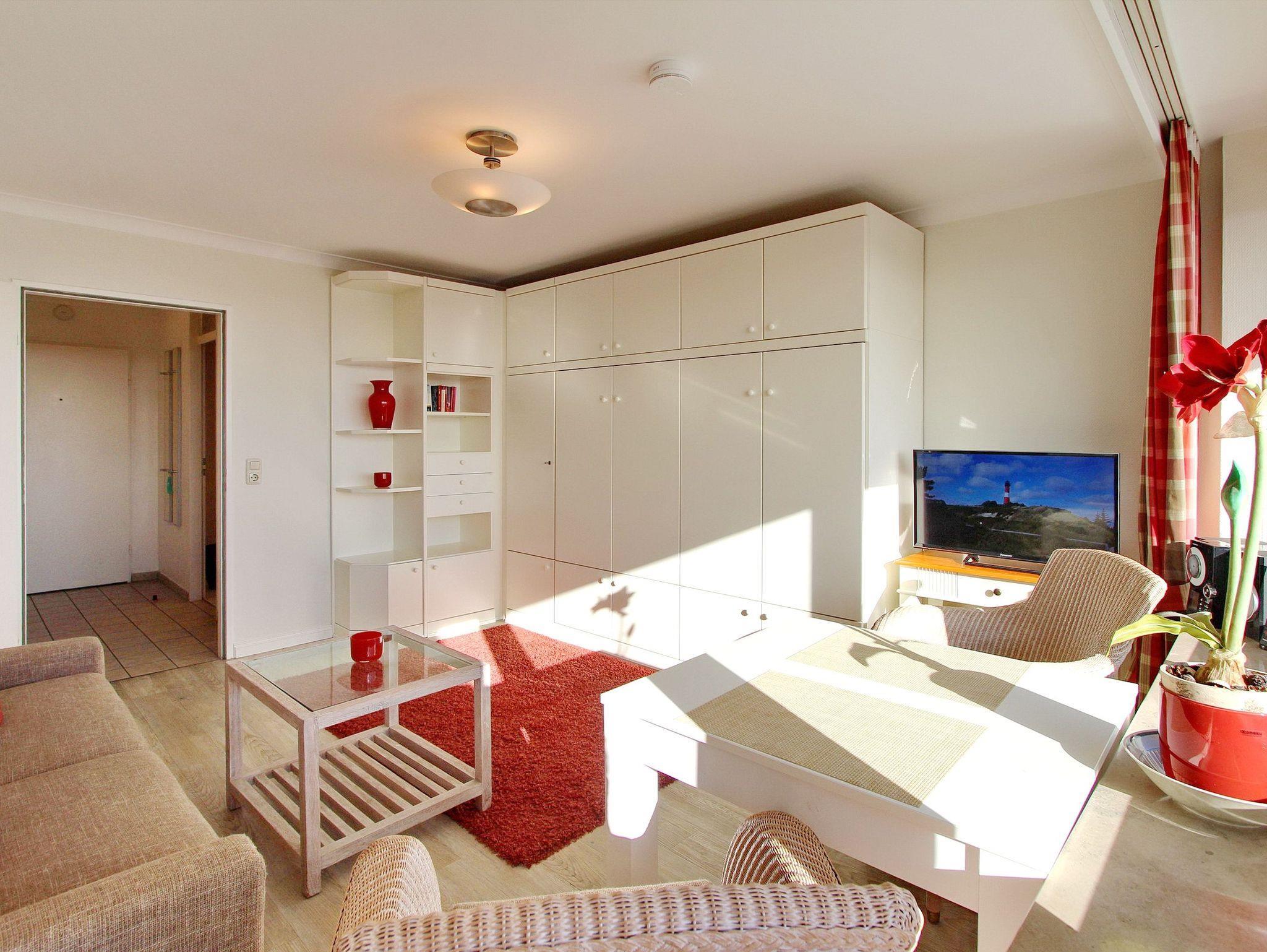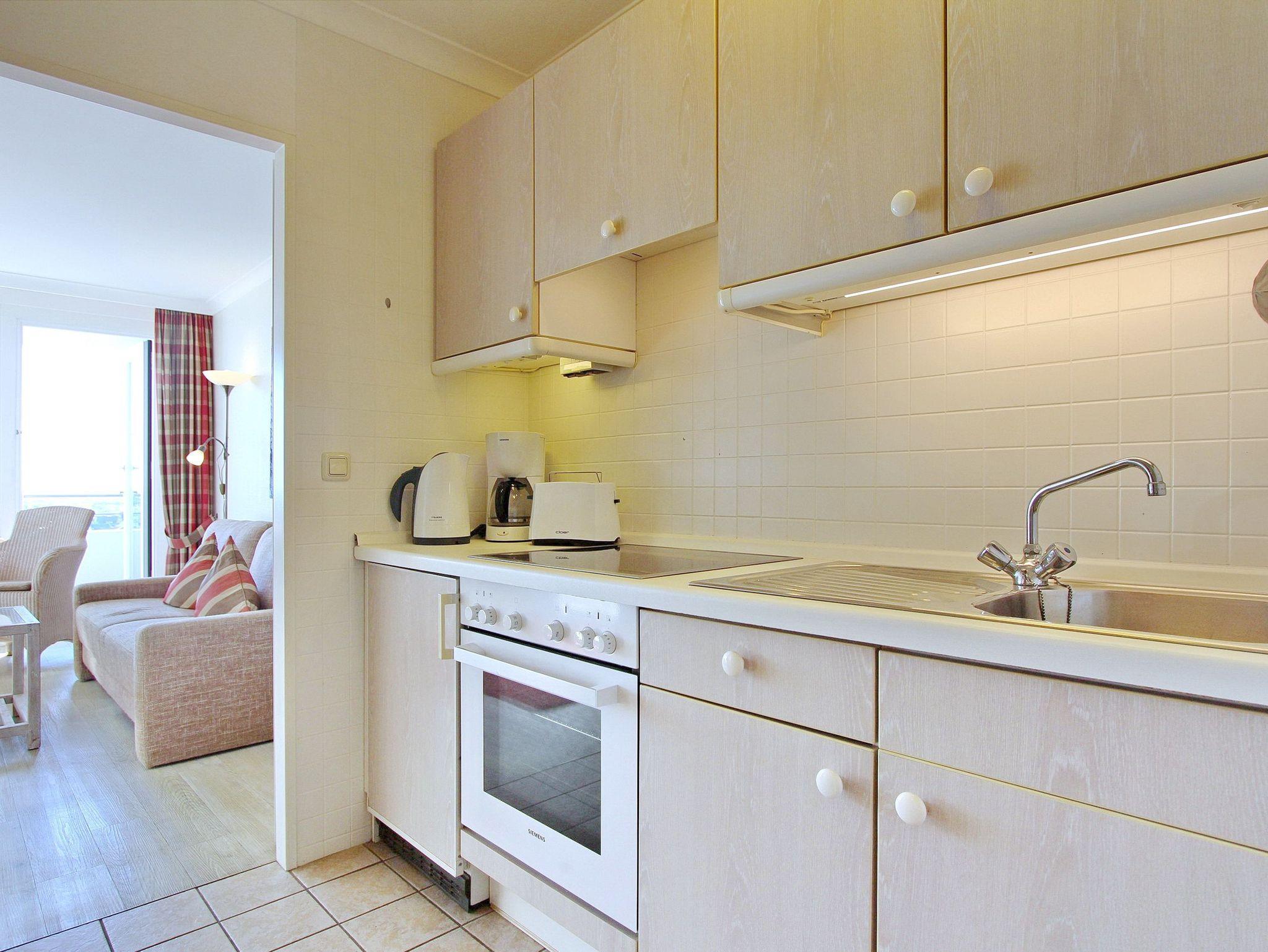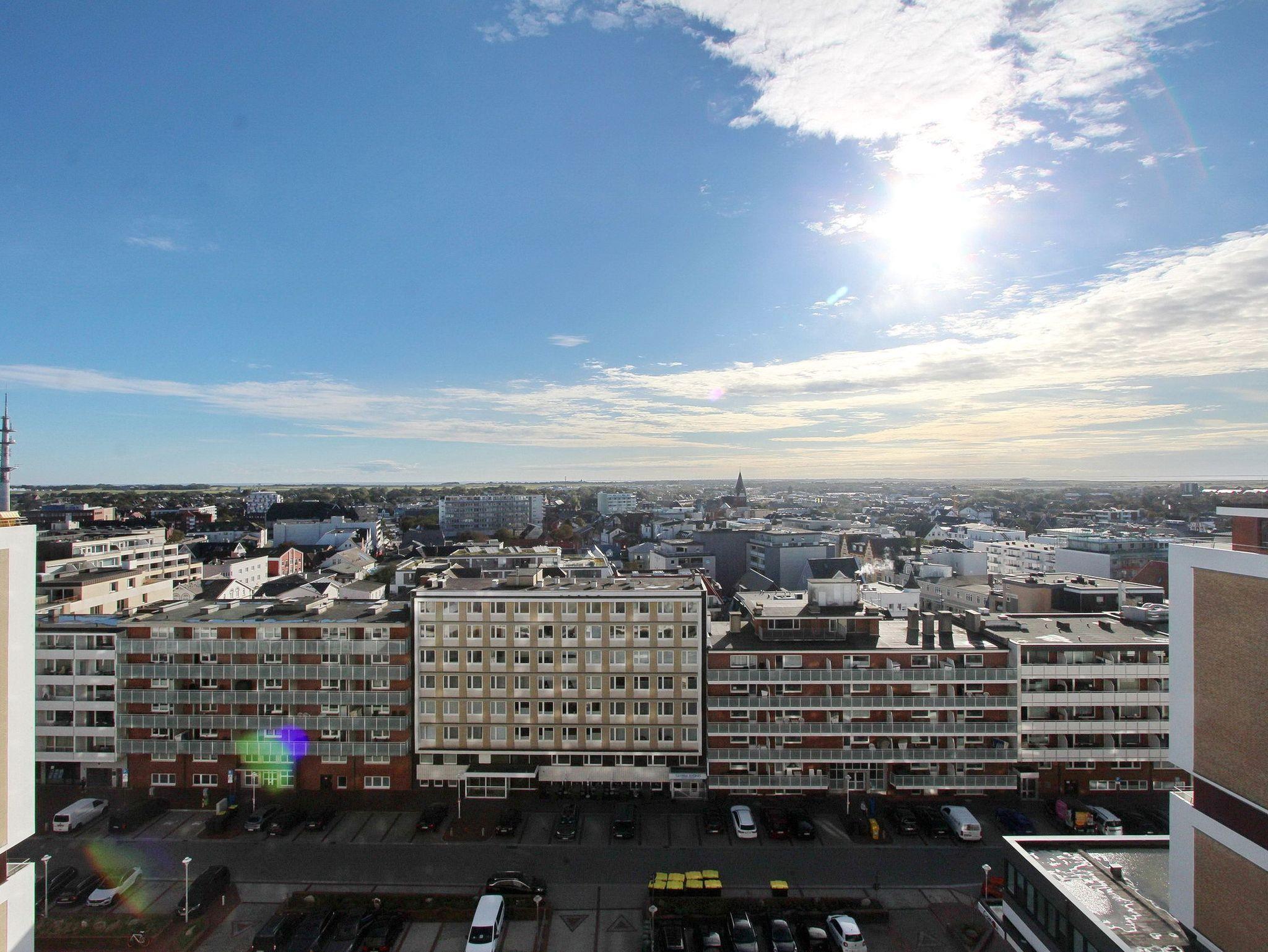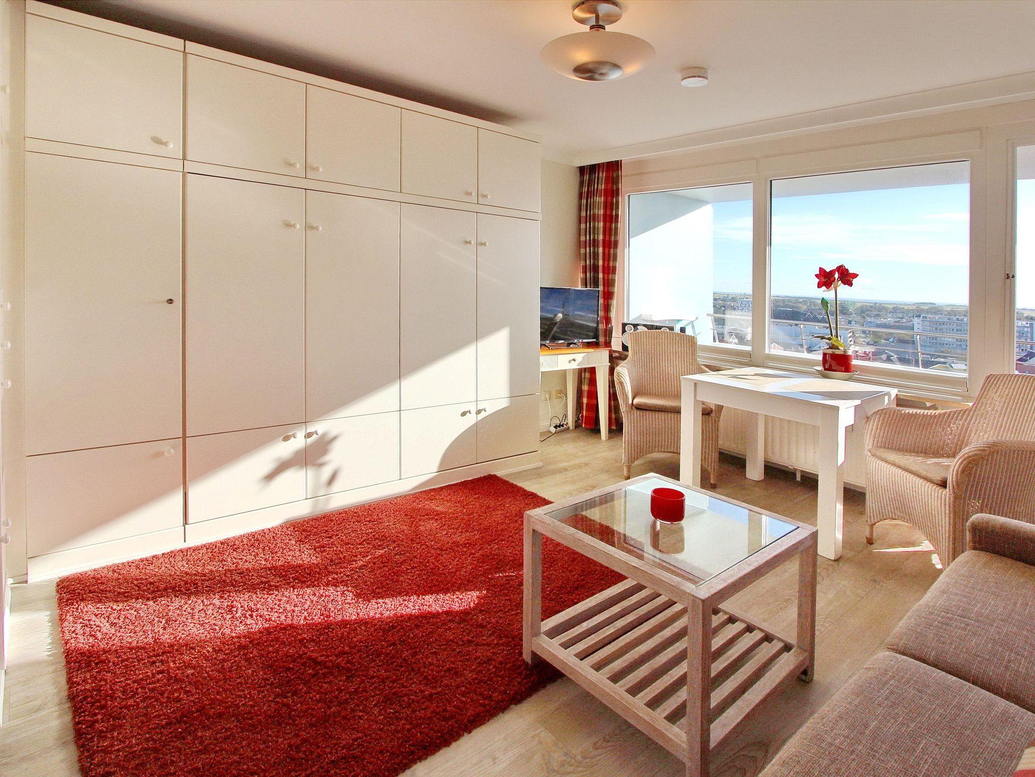 Schöne Einzimmerwohnung in der 9. Etage vom Haus Metropol mit einem traumhaften Weitblick über die Insel und die Stadt - bei klarem Wetter auf das nordfriesische Wattenmeer bis zum Festland. Der kombinierte Wohn-/Schlafraum mit vorgelagertem Ostbalkon verfügt über Einzelschrankbetten, einem Essplatz mit 2 Stühlen am Fenster und einer gemütlichen 2-Sitzer-Couch. Modernes Duschbad/WC. Die Einbauküche mit Flur ist mit einem Backofen, einem Cerankochfeld mit 4 Platten und einem Kühlschrank ausgestattet. Zur technischen Ausstattung gehört ein Flachbild-TV und ein Radio. Nichtraucherwohnung. Haustiere nicht gestattet. Ein freies WLAN Netz (WEG Haus Metropol - Passwortfrei - ohne Gewähr) steht Ihnen kostenfrei zur Verfügung. Wohnungsgröße ca. 30 m².