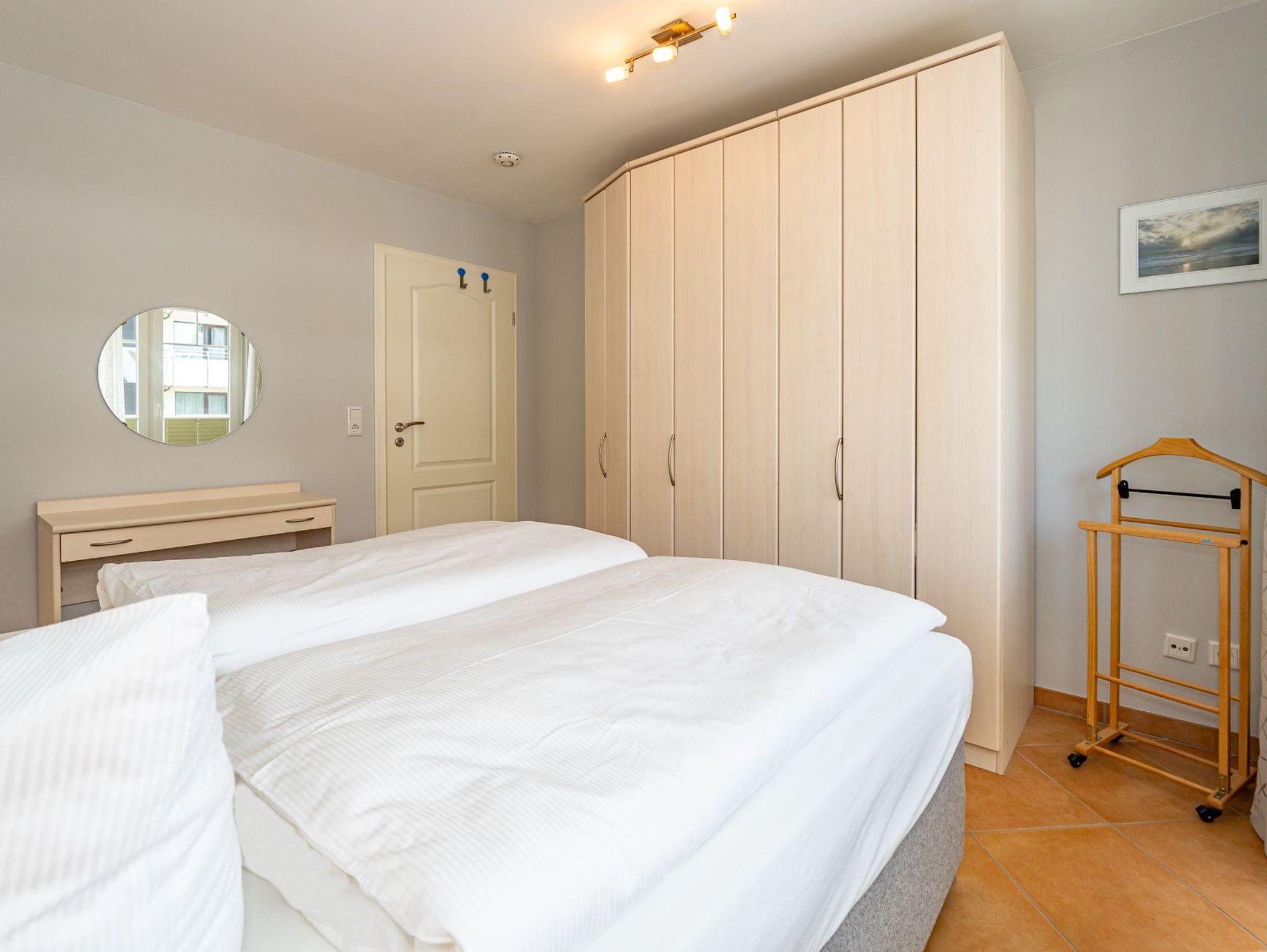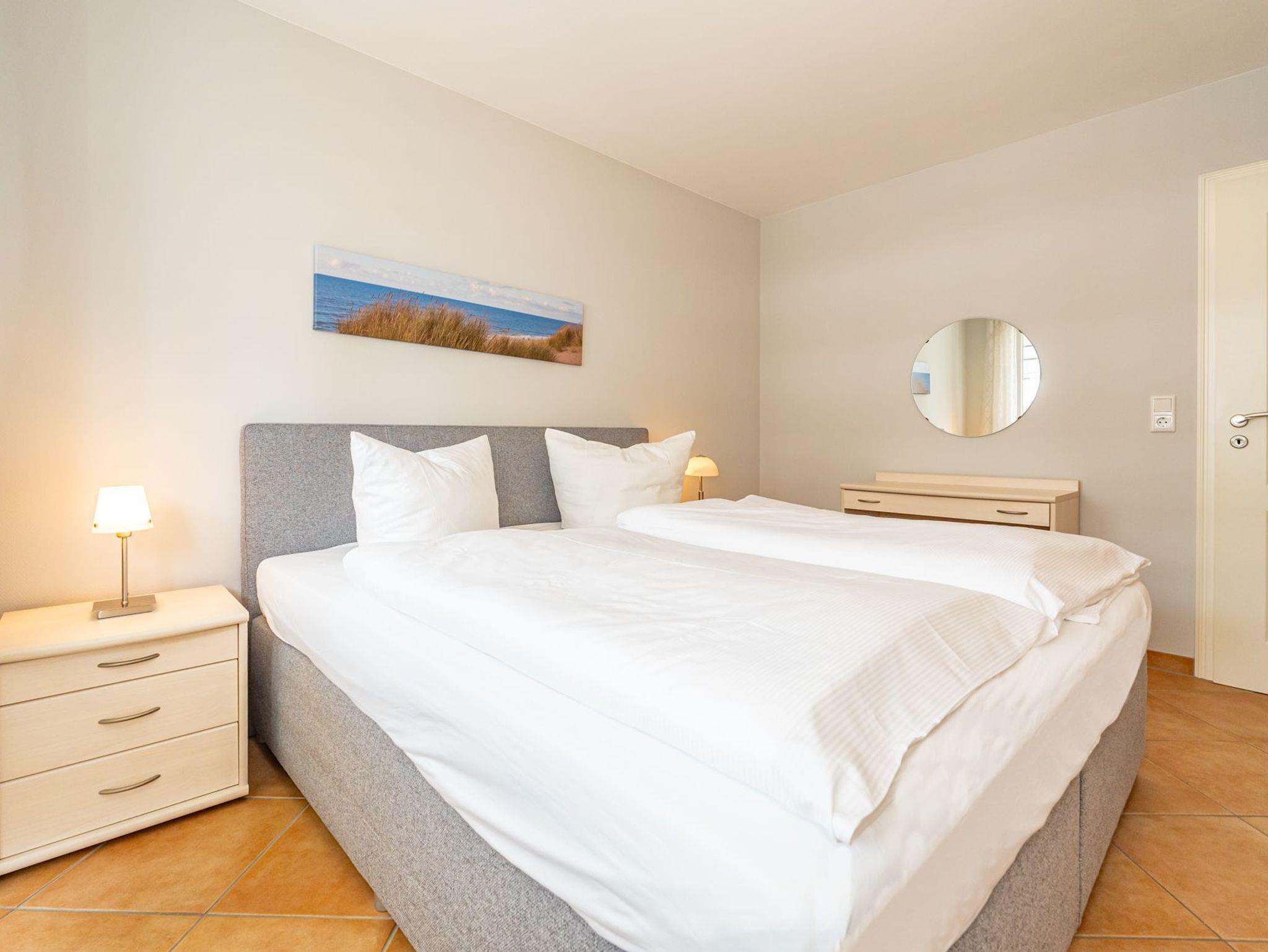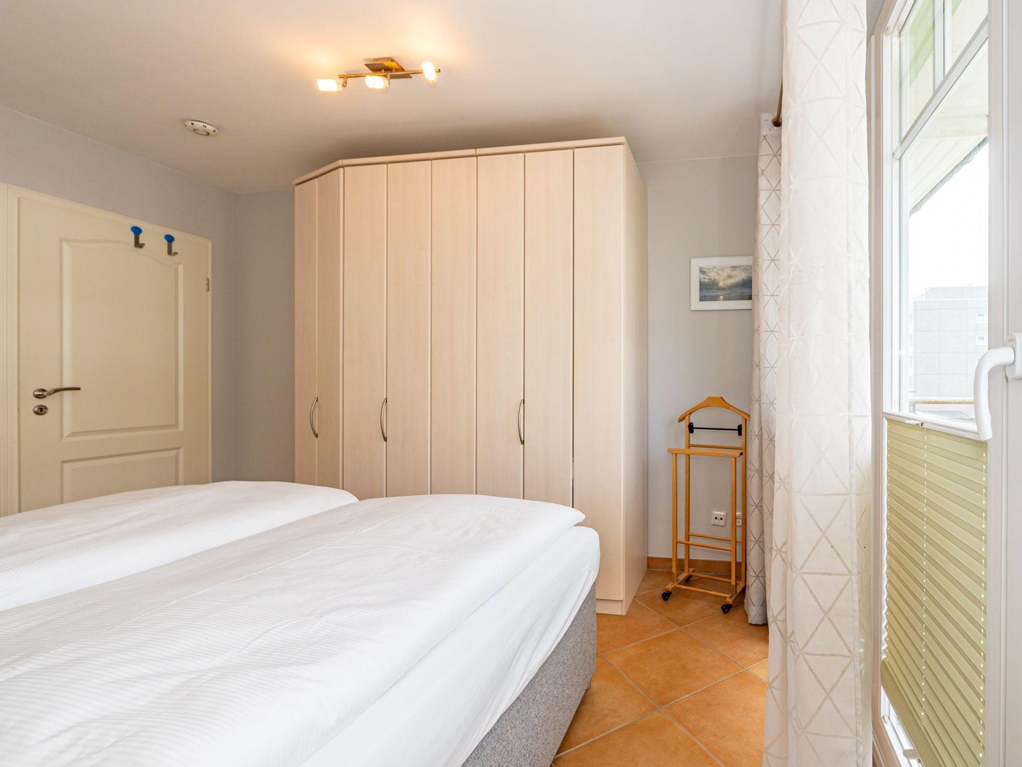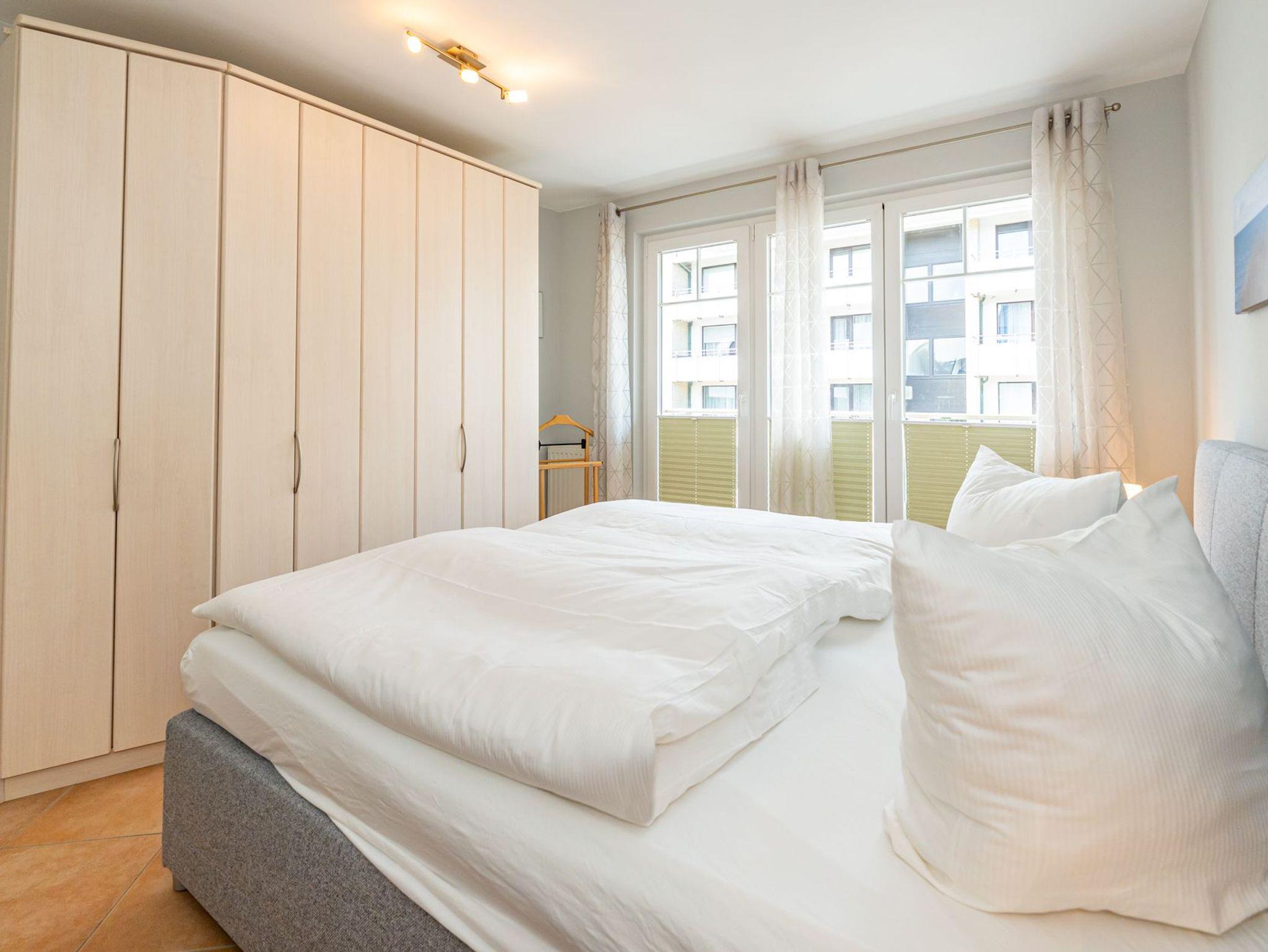 Das Schlafzimmer hat ein Doppelbett mit durchgängiger Matratze (1,80 x 2,00m) mit Austritt zum separaten, zweiten Balkon (Westseite).
