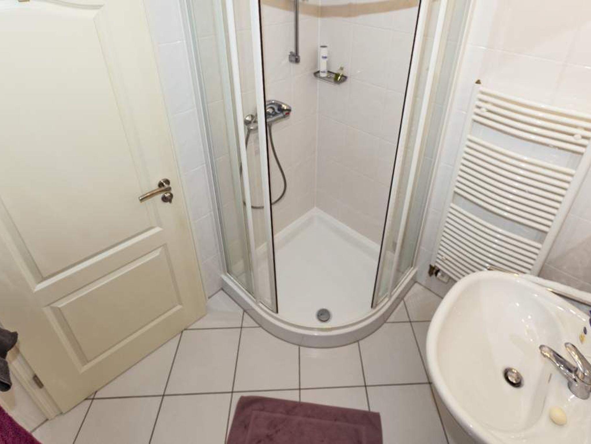Im modernen Badezimmer befinden sich eine Dusche mit flachem Einstieg, ein Waschtisch, ein Handtuchtrockner, ein Fön sowie das WC.