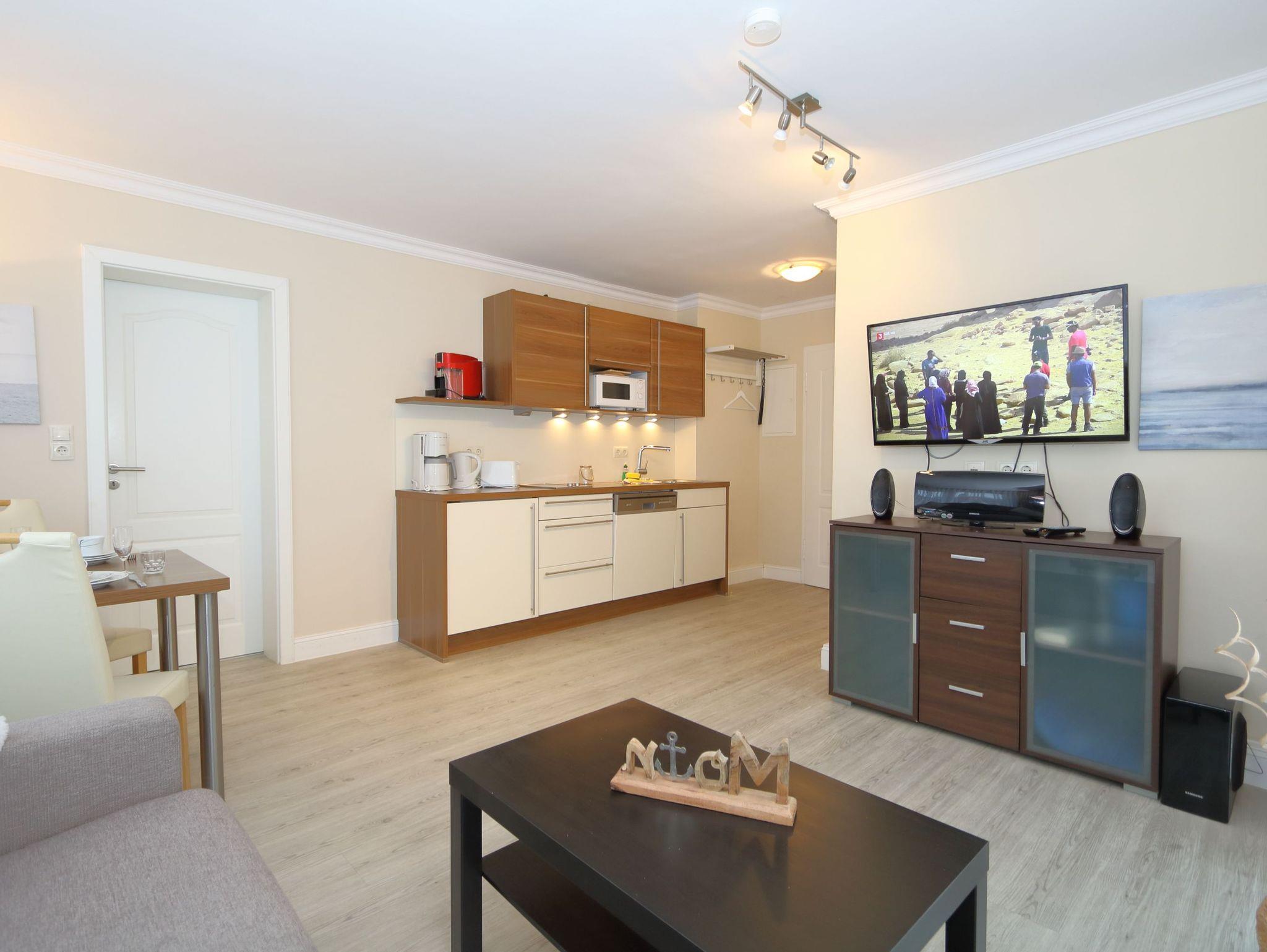 Ein großer Fernseher mit Smart-TV und ein kleines Stereoradio sorgen für Unterhaltung.