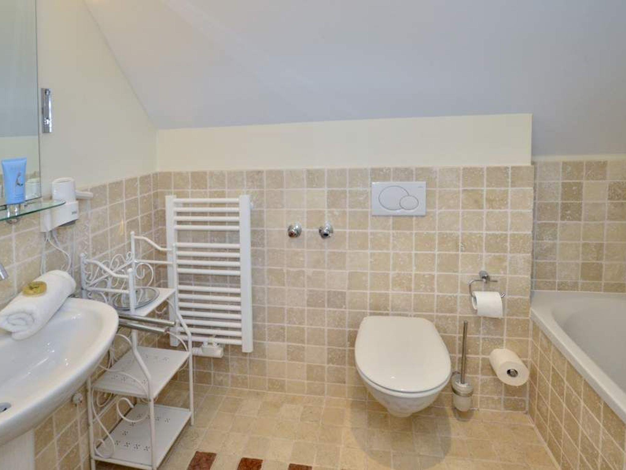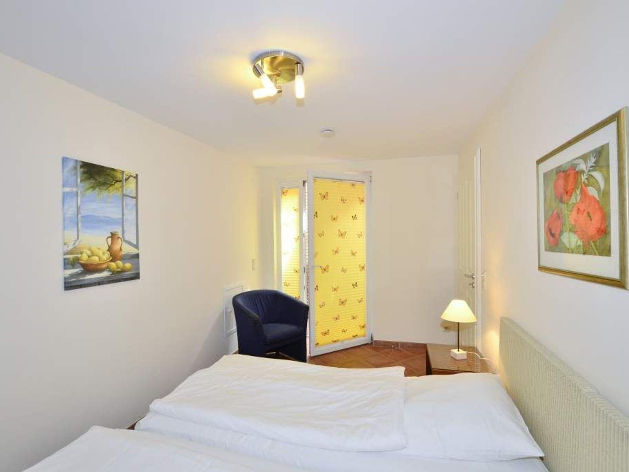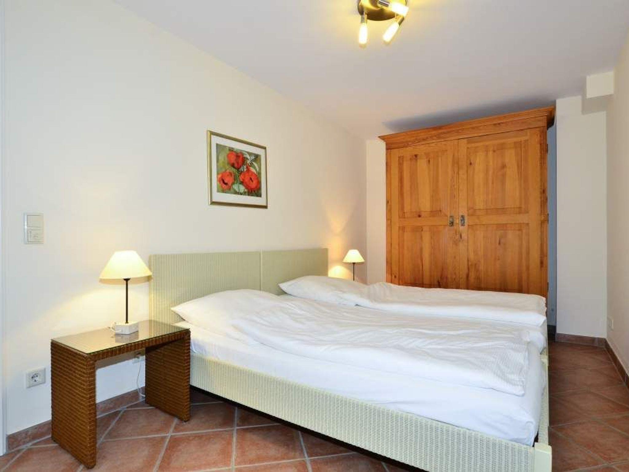 Das 1. geräumige Schlafzimmer hat ein gutes Doppelbett (mit zwei Einzelmatratzen 0,90 x 2,00 m) und einem Flachbildfernseher, sowie ein schickes Wannenbad/WC mit Föhn.