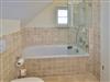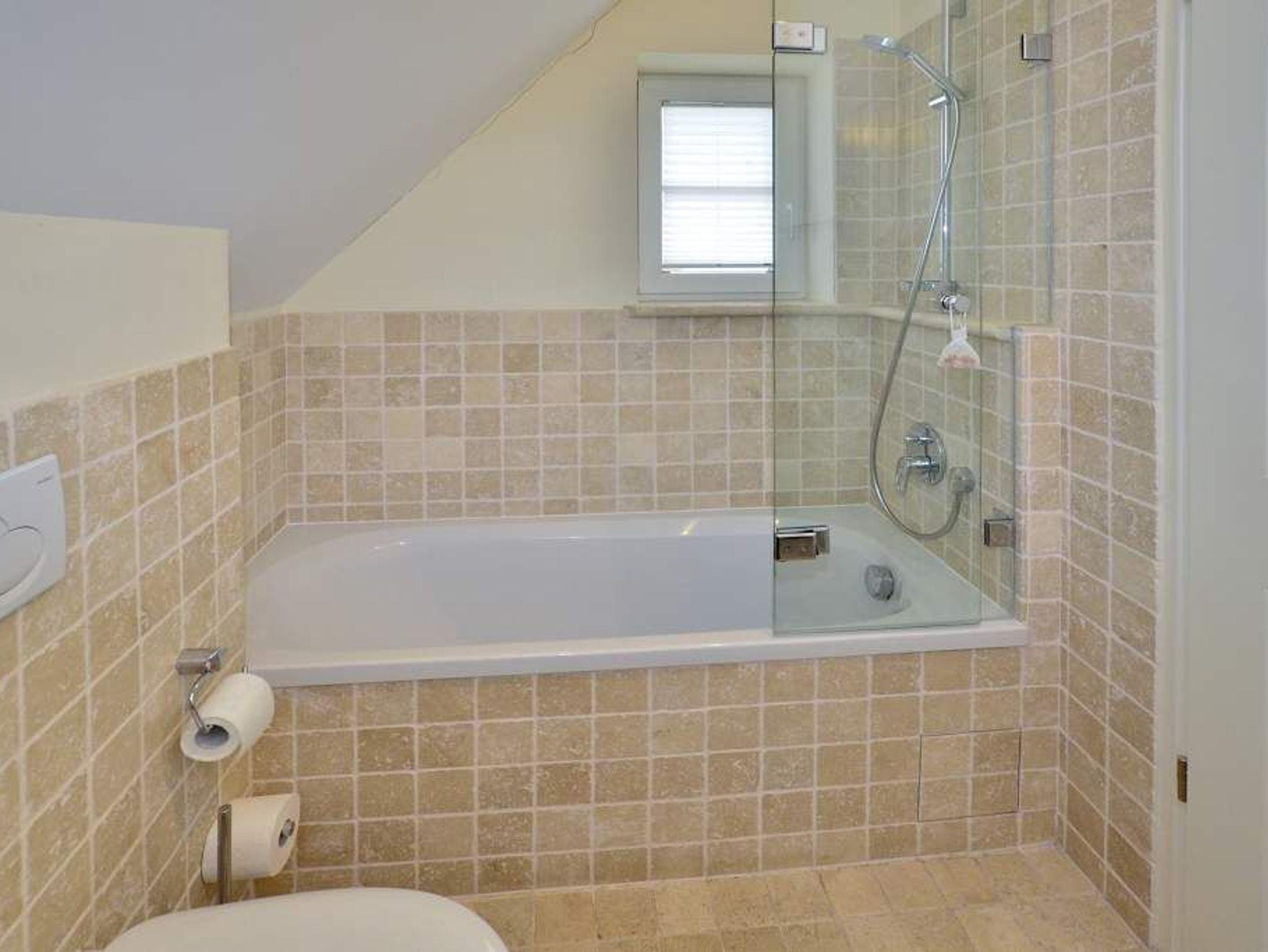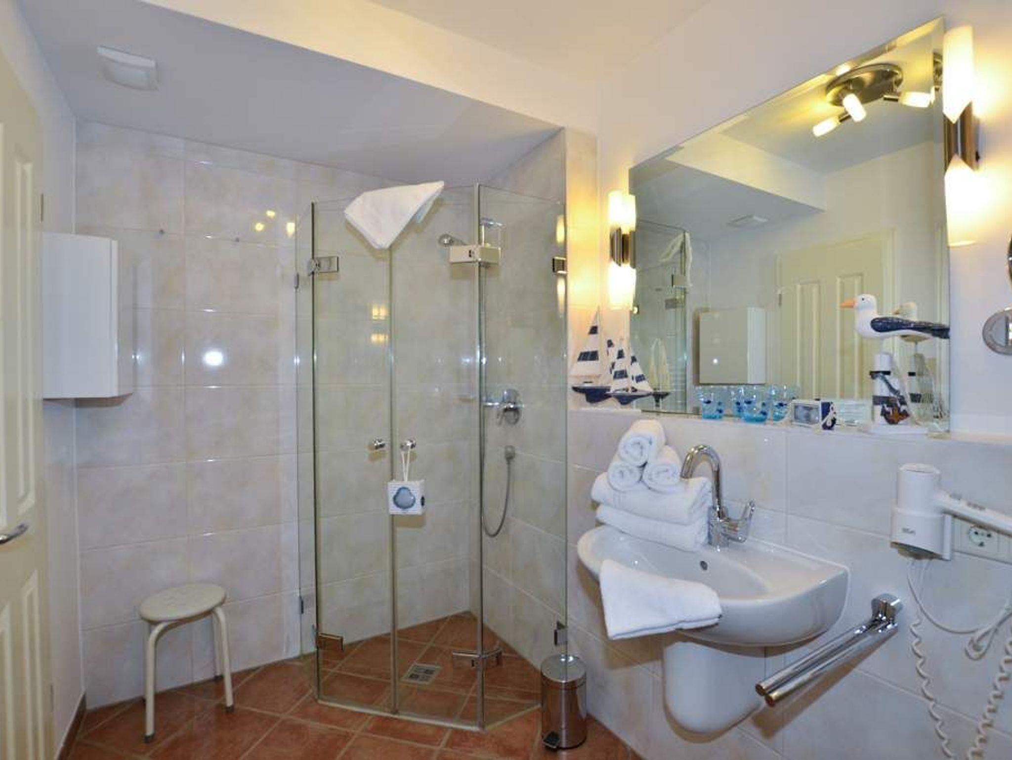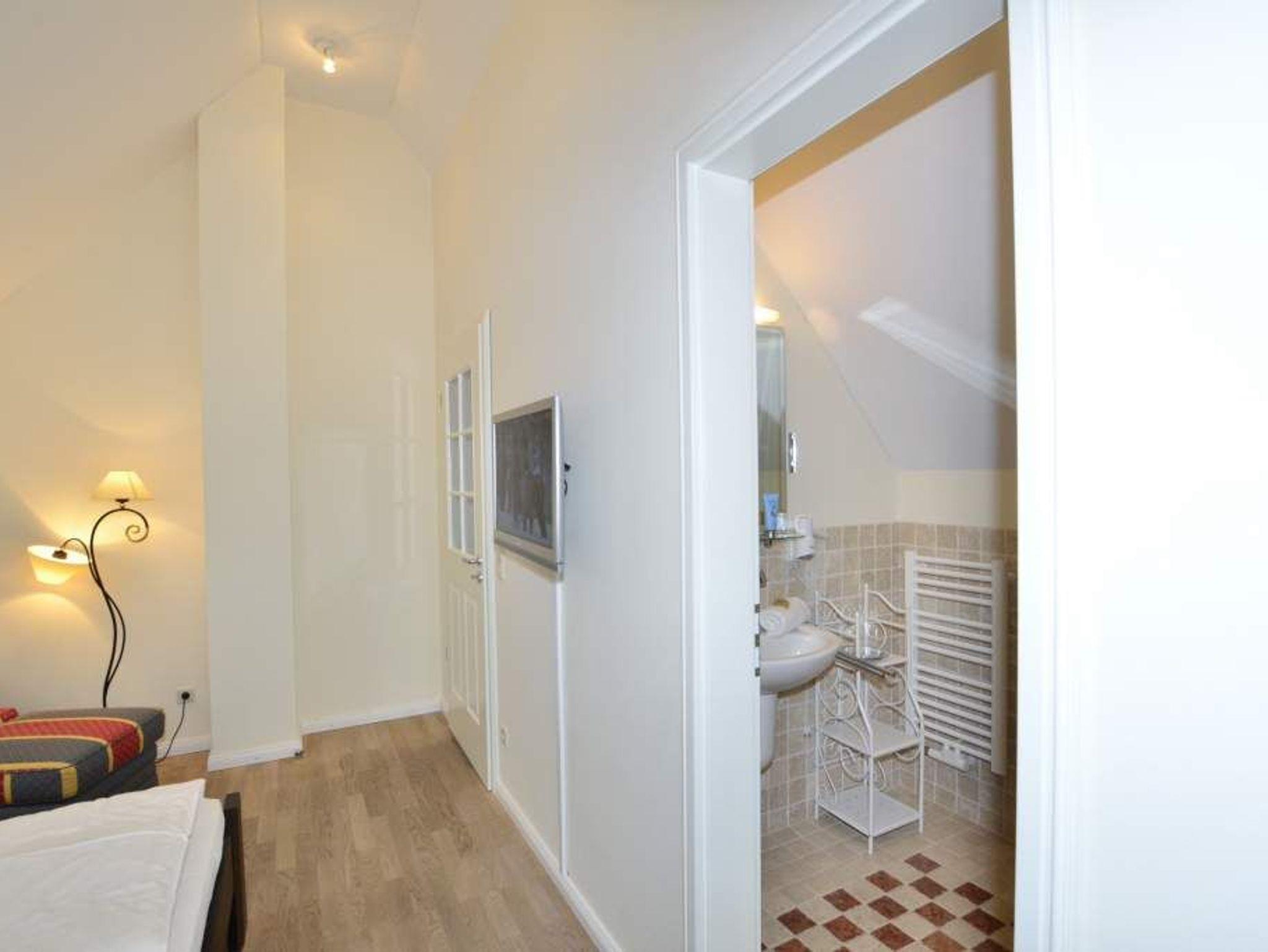 Das 1. geräumige Schlafzimmer hat ein gutes Doppelbett (mit zwei Einzelmatratzen 0,90 x 2,00 m) und einem Flachbildfernseher, sowie ein schickes Wannenbad/WC mit Föhn.