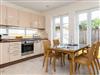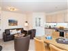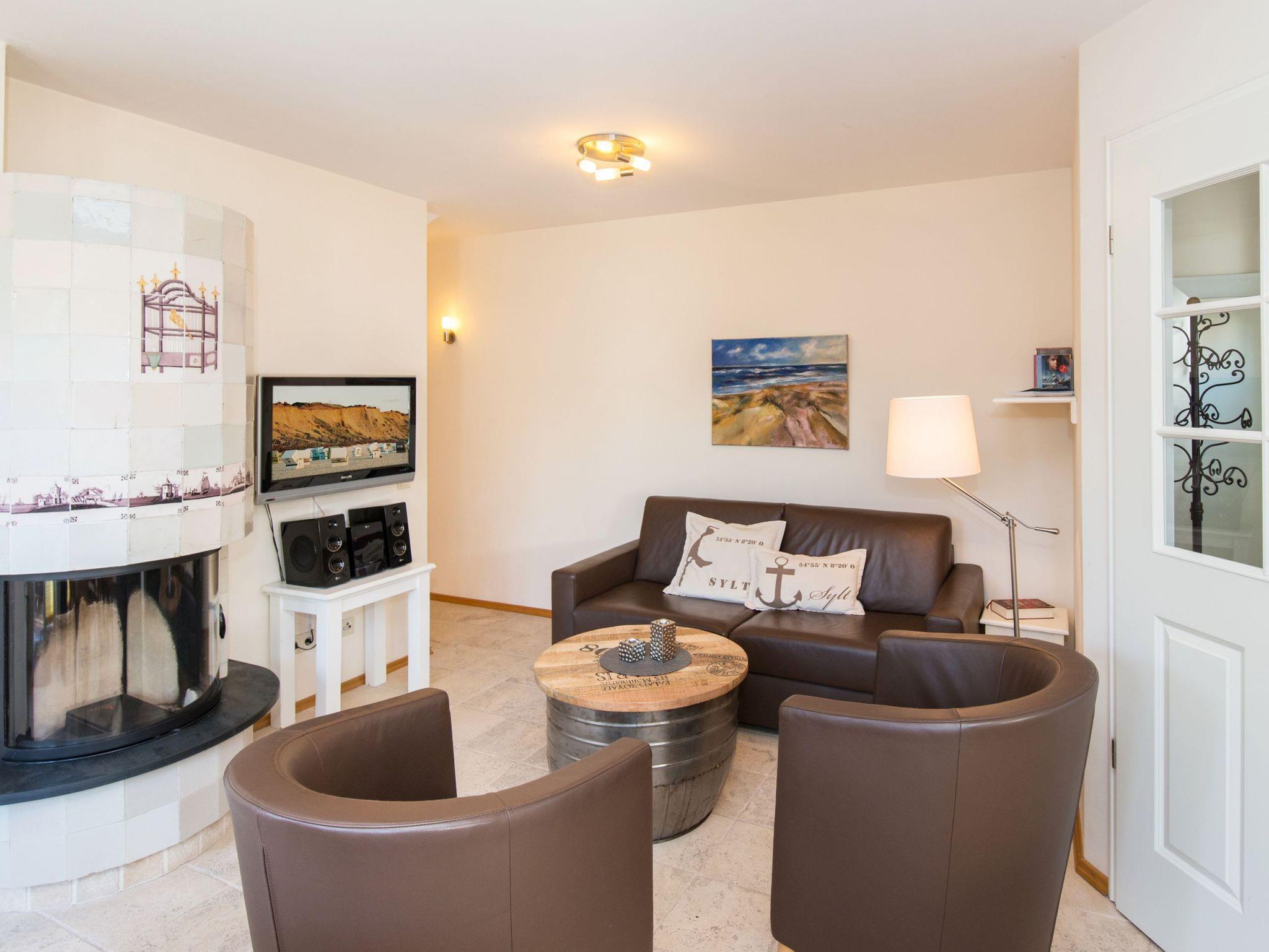 Das Wohnzimmer ist mit einem Zweisitzer-Sofa, zwei Sesseln, einem Essplatz und einem aufwendig gemauerten Kamin (umrahmt von echten Delfter-Fliesen) ausgestattet und hat eine offene, gut ausgestattete Küche.