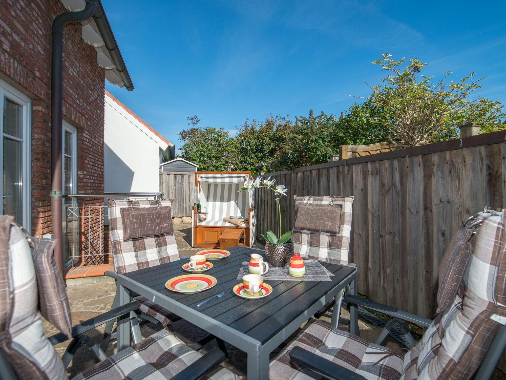 Die nach Südosten ausgerichtete Sonnenterrasse bietet einen Saison-Strandkorb (ca. vom 01. April bis 15.Oktober) und Gartenmöbel mit Auflagen.