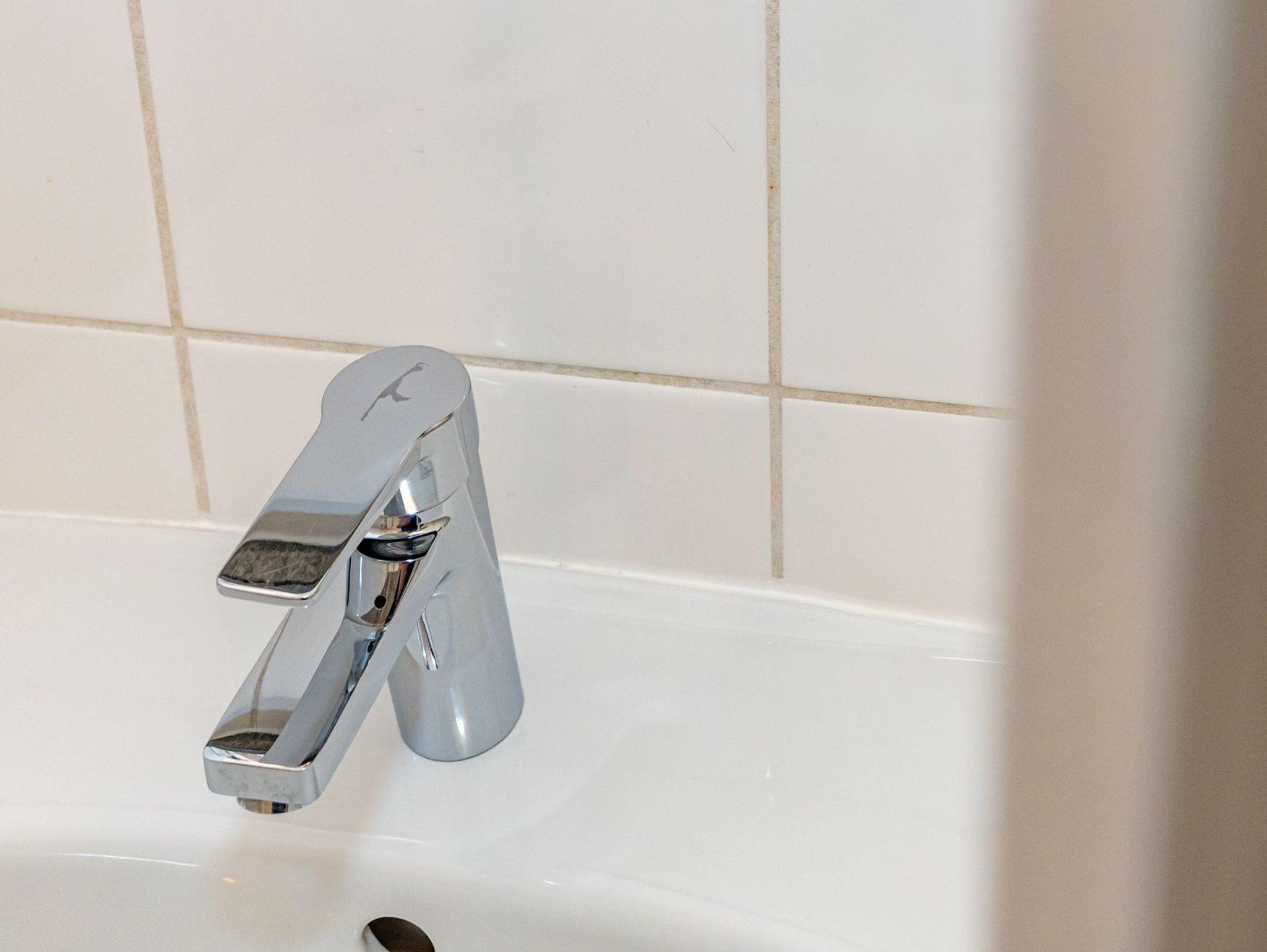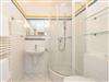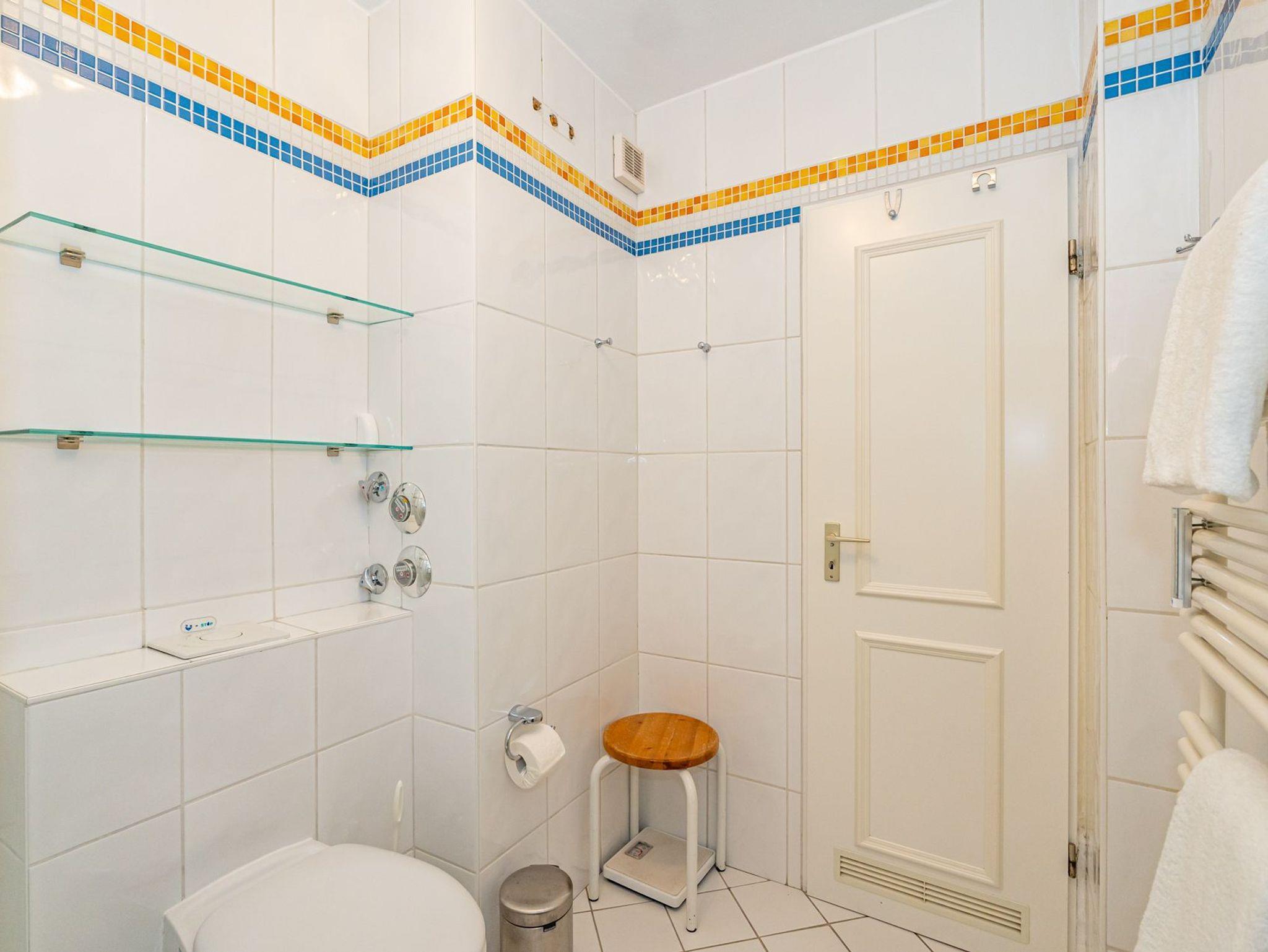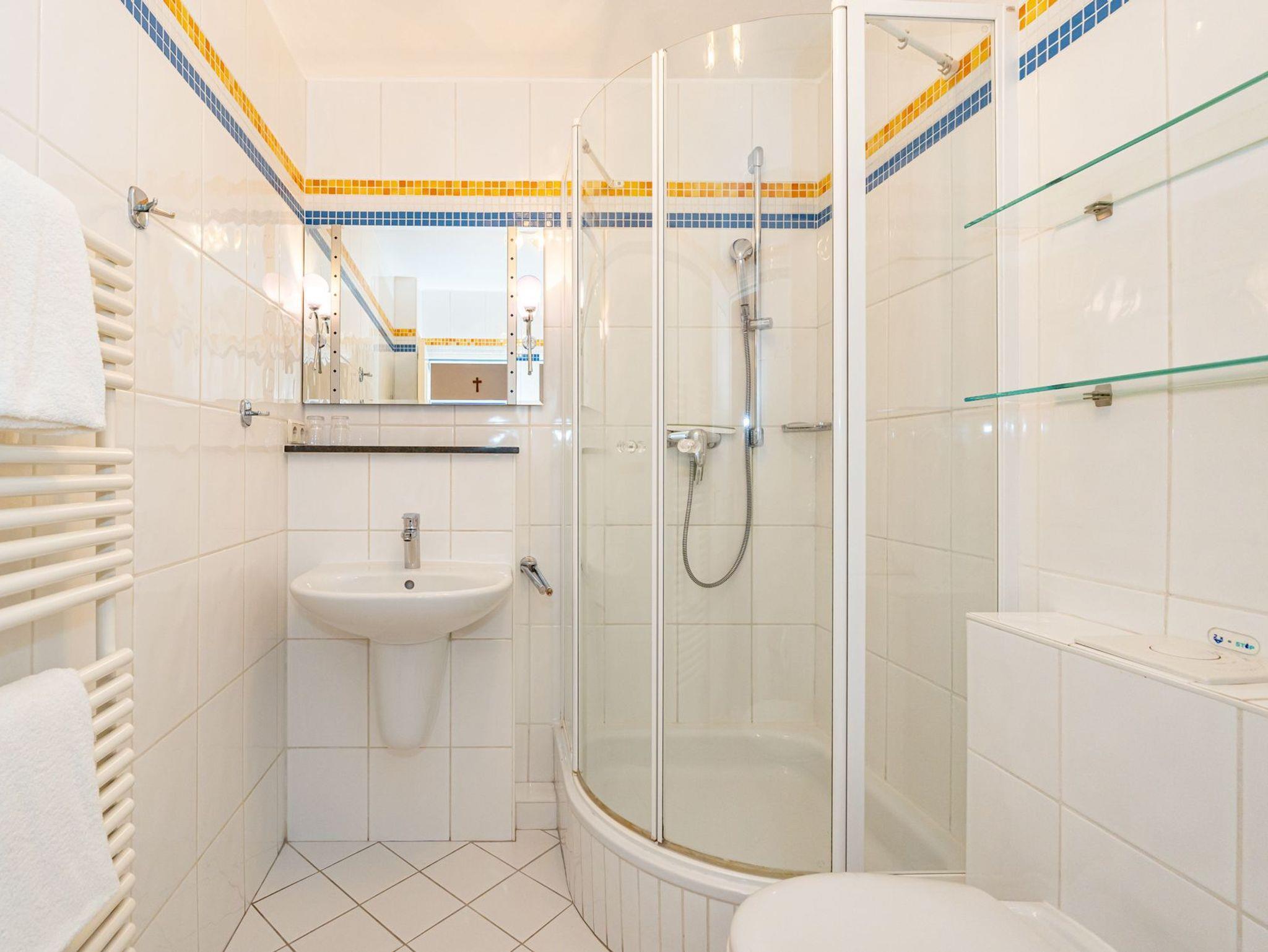 Im Bad befindet sich eine Dusche, ein Waschtisch und ein Handtuchtrockner.