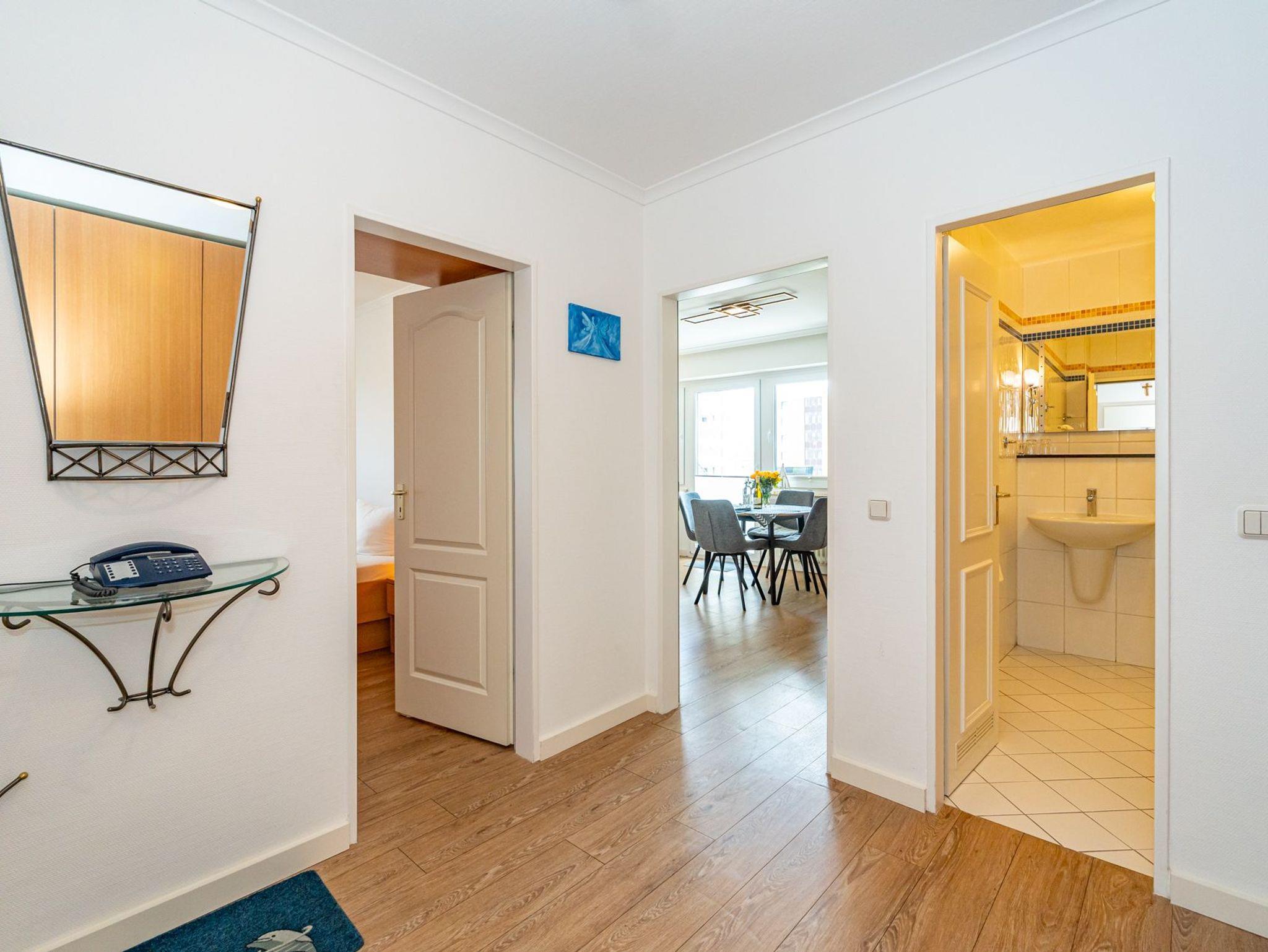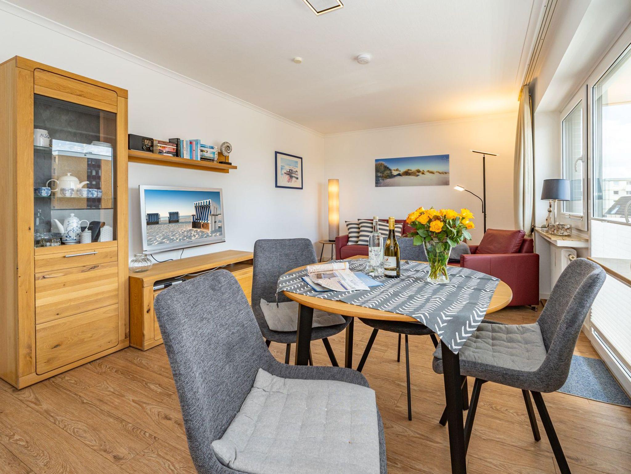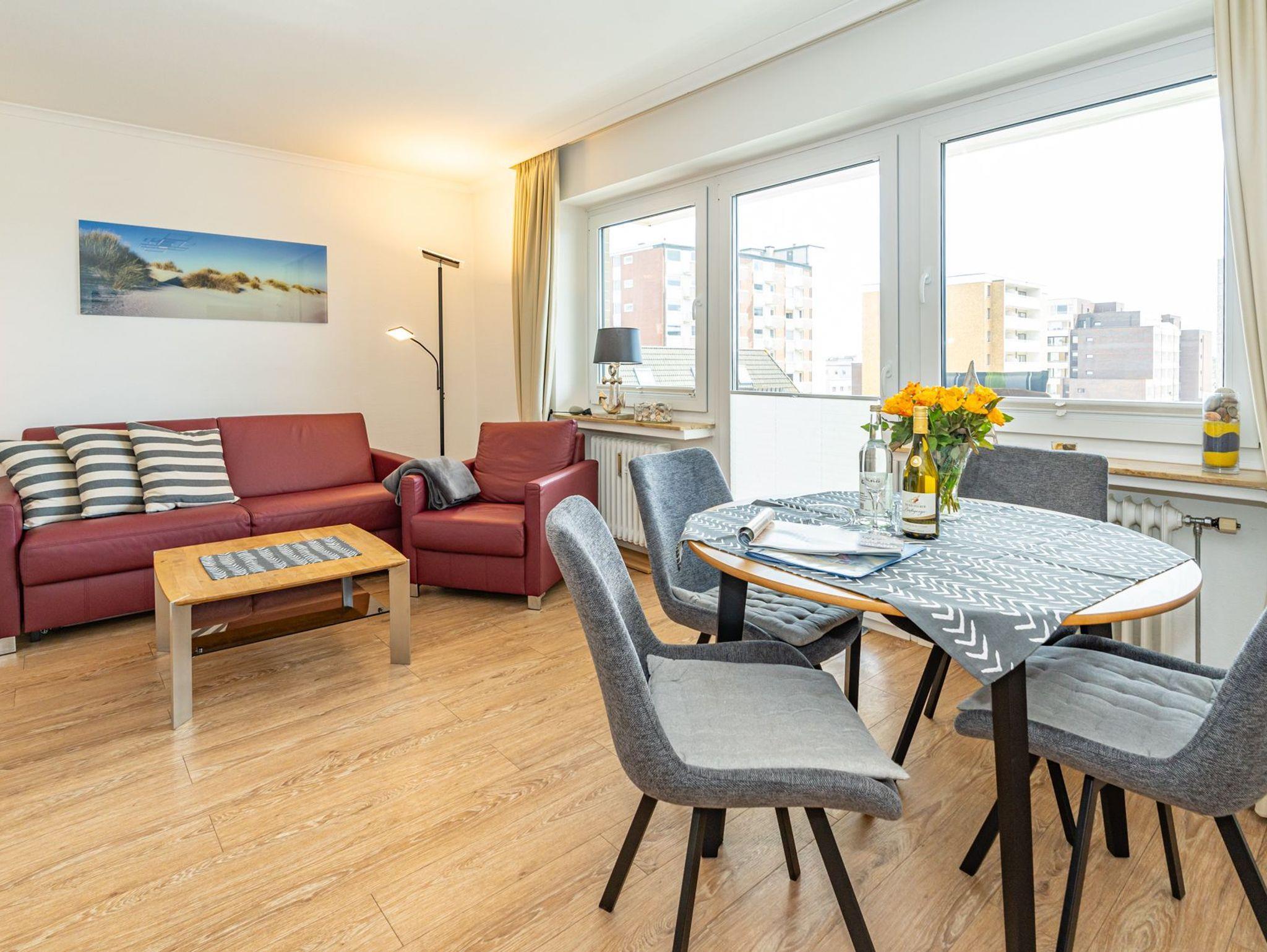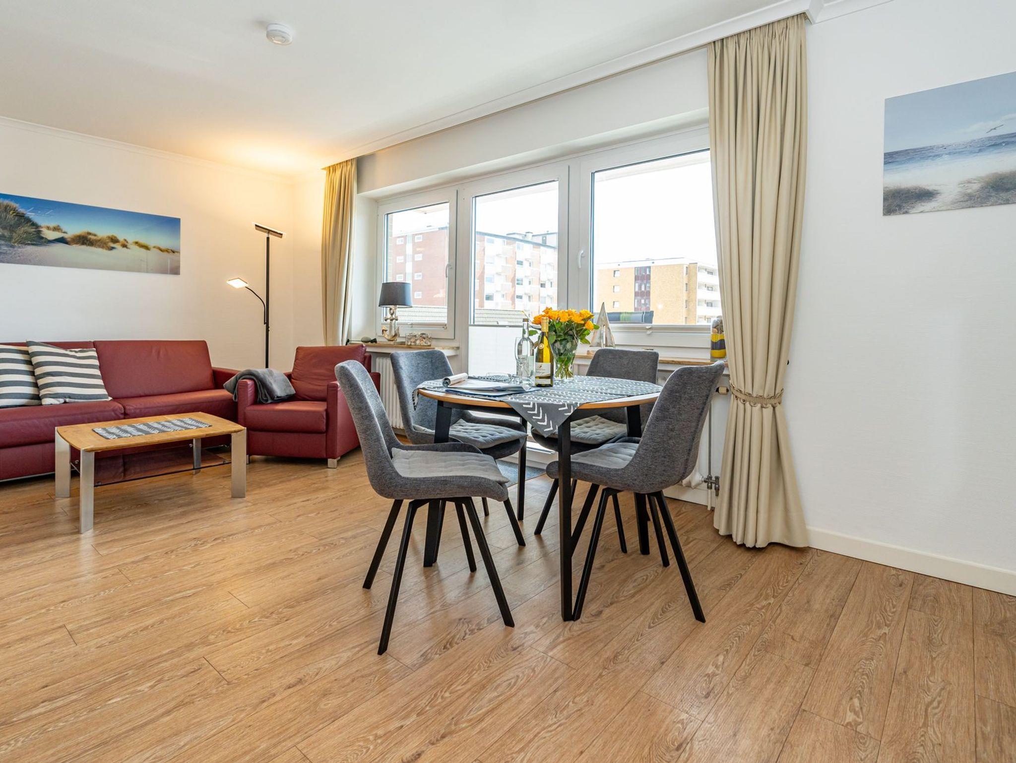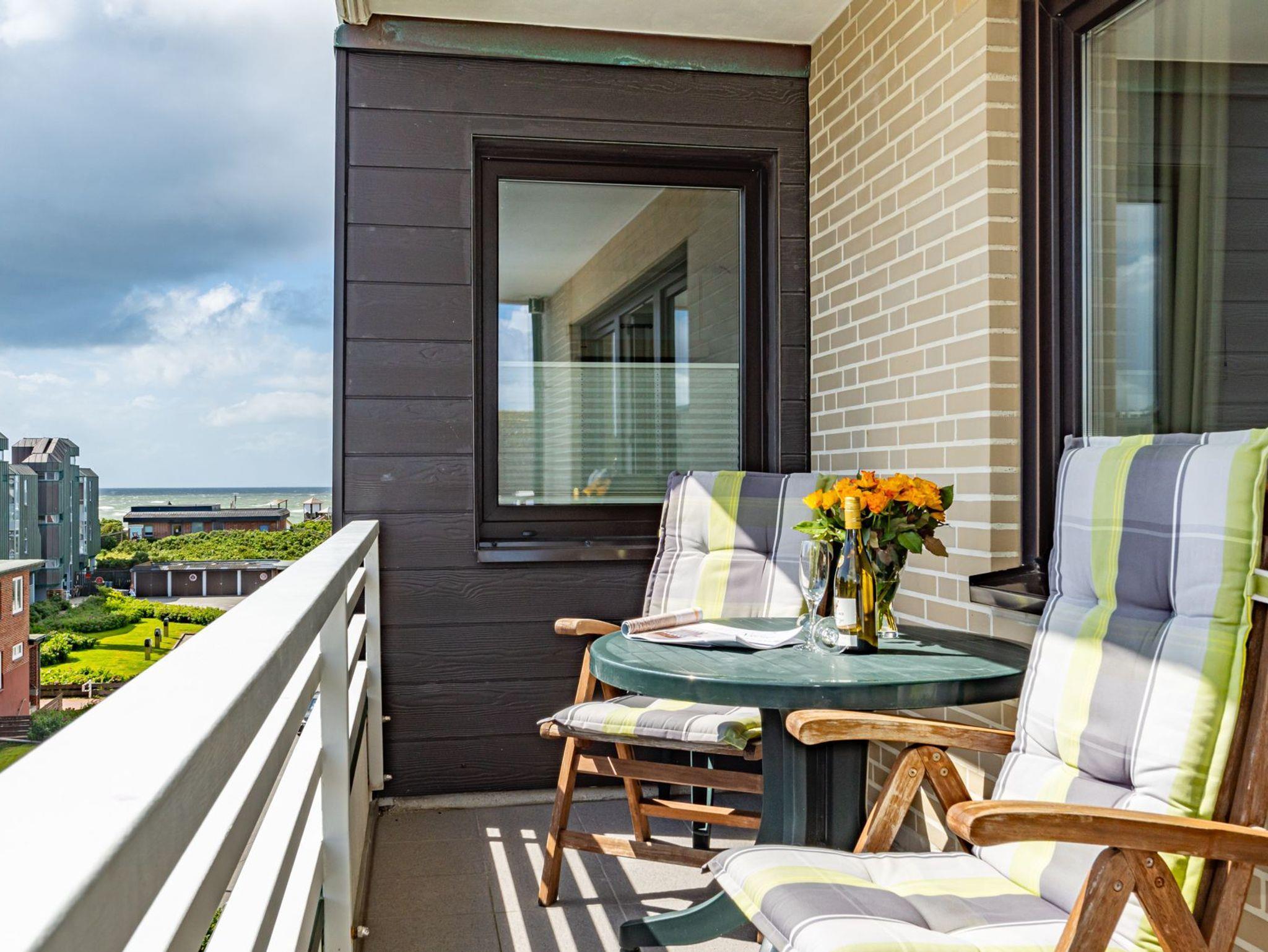 Diese gemütliche Nichtraucher-Ferienwohnung in der 3. Etage bietet auf ca. 52 qm Platz für bis zu 4 Personen. Genießen Sie sonnige Stunden auf der großzügigen Südloggia, ausgestattet mit Balkonmöbeln und Auflagen.