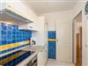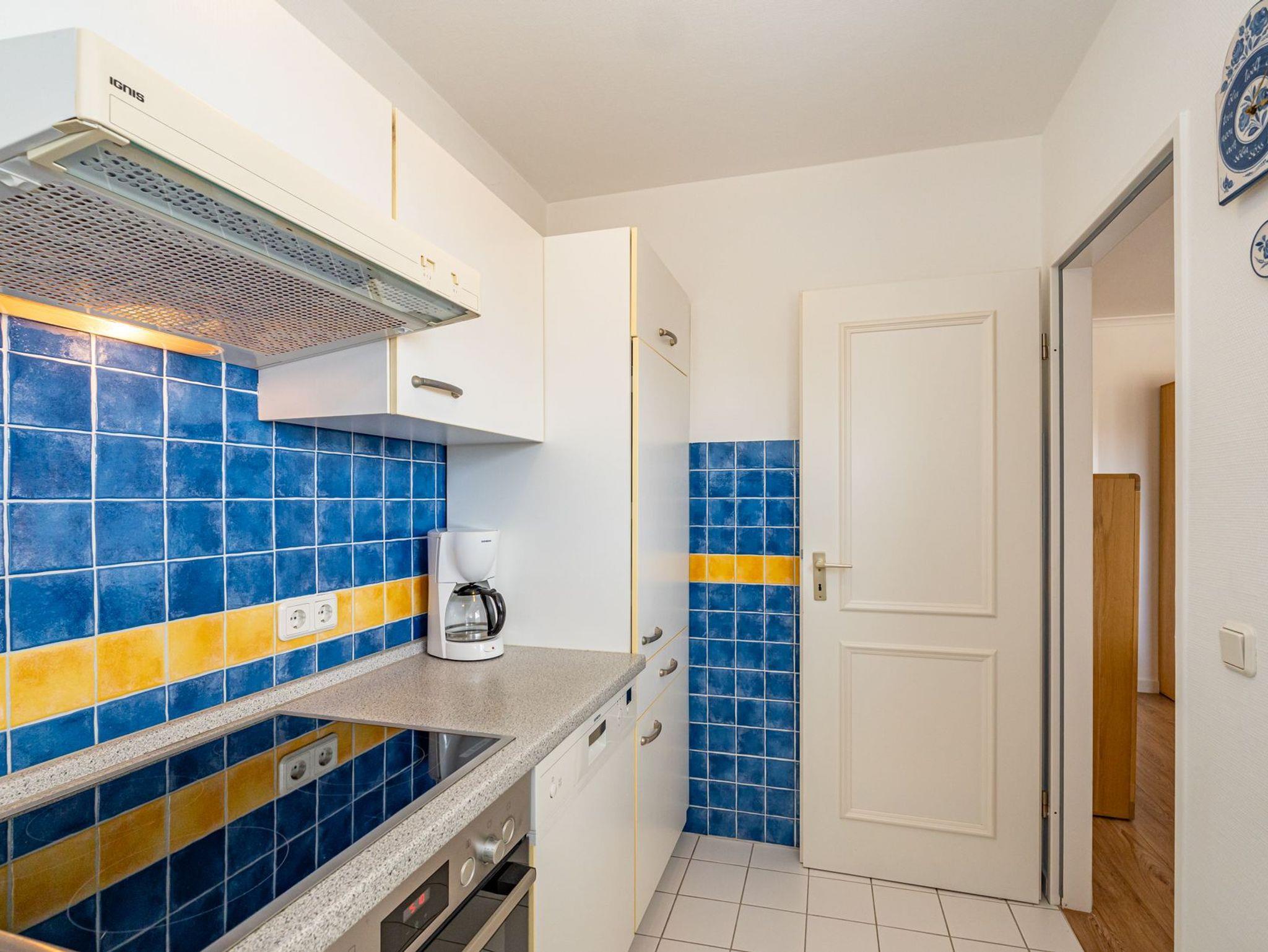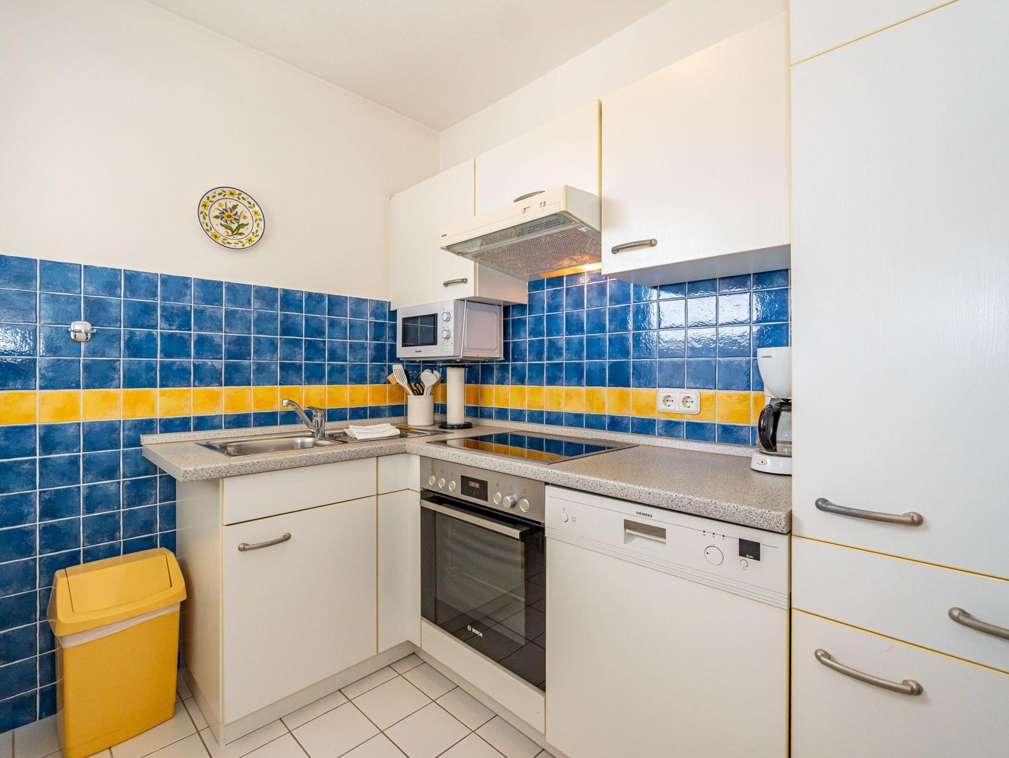 Die Küche hat einen Geschirrspüler, ein Ceran-Kochfeld, Backofen, Mikrowelle, einen Kühlschrank mit Gefrierfach und Fenster.