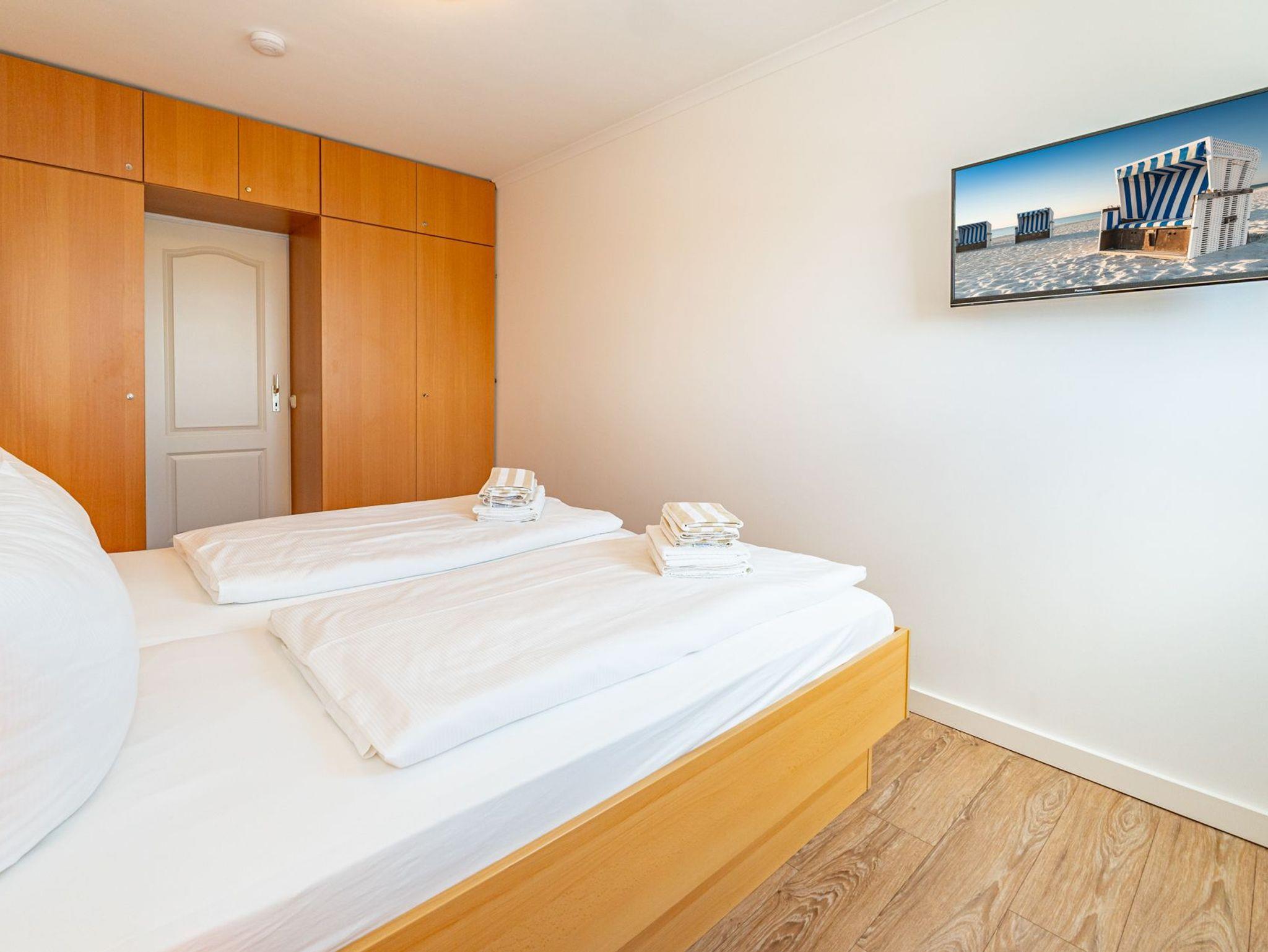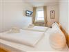 Das Schlafzimmer hat ein Doppelbett (2 m x 1,80 m) mit zwei Einzelmatratzen und einen weiteren Flachbild-TV.