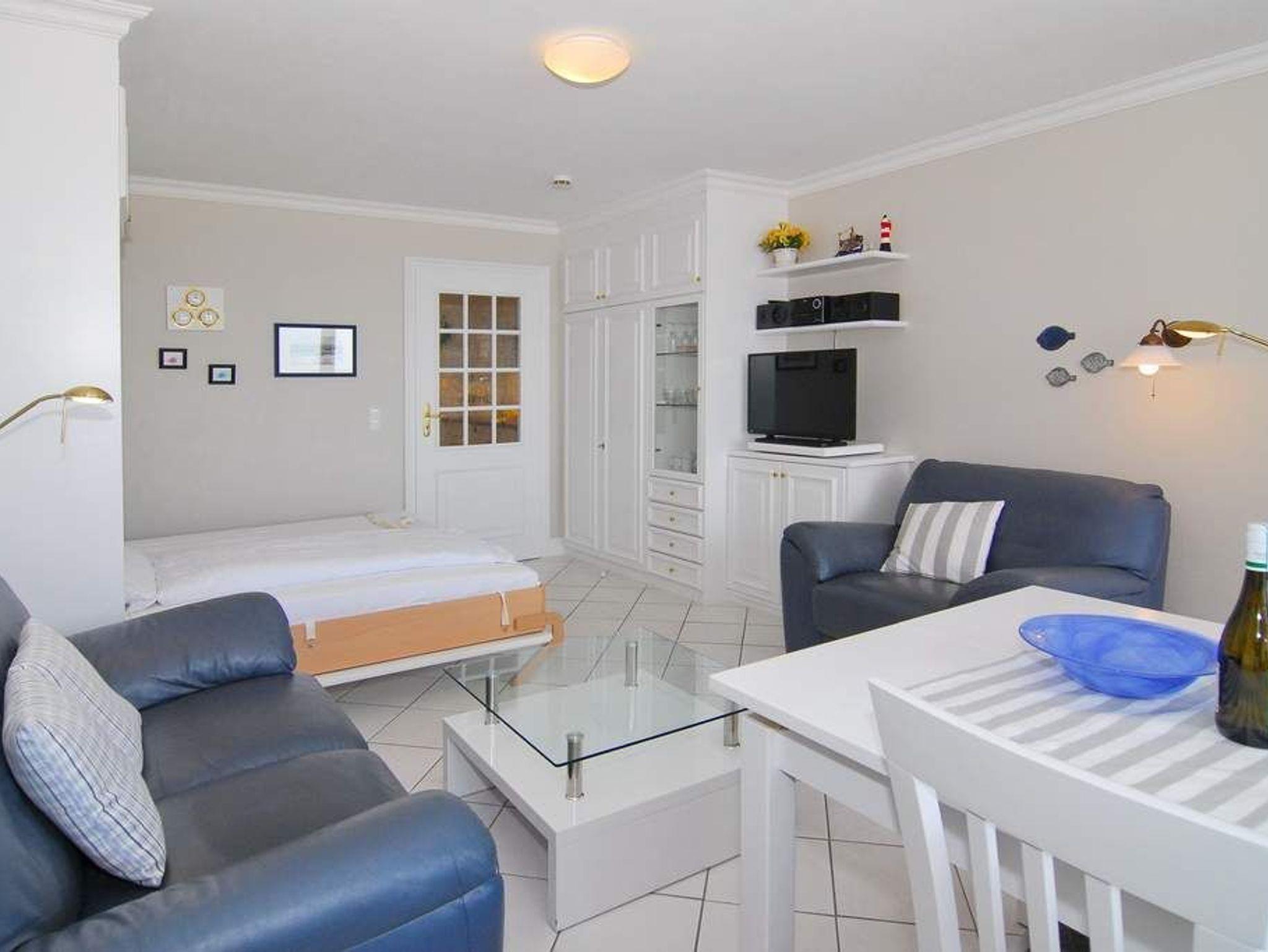 Exklusive1-Zimmer-Ferienwohnung ca. 34m², 5 OG. im Haus am Meer , Wohn-/Schlafraum mit Doppelschrankbett (2 x 0,80 x 2m), Essplatz mit Blick auf`s Meer, Zweisitzercouch, Radio, Flach-TV, Telefon (Festnetzflatrate) und W-LAN (ohne Gewähr). Westbalkon mit Balkonmöbeln, Küchenzeile im Flurbereich mit Geschirrspüler und Mikrowelle, Garderobe, Duschbad/WC. Das Apartment ist komplett gefliest, Tierhaltung ist nicht gestattet! PBettwäsche und Handtücher sind zur Anreise aufgezogen. Ein PKW-Stellplatz kann kostenpflichtig zugebucht werden. Nichtraucher-Wohnung! Beginnend vom 15.10.2025 bis 5.4.2026 (Ostern) findet die Fassandensanierung der Landseite (Osten) sowie des Südgiebels statt. Mit Baulärm ist in dieser Zeit zu rechnen.