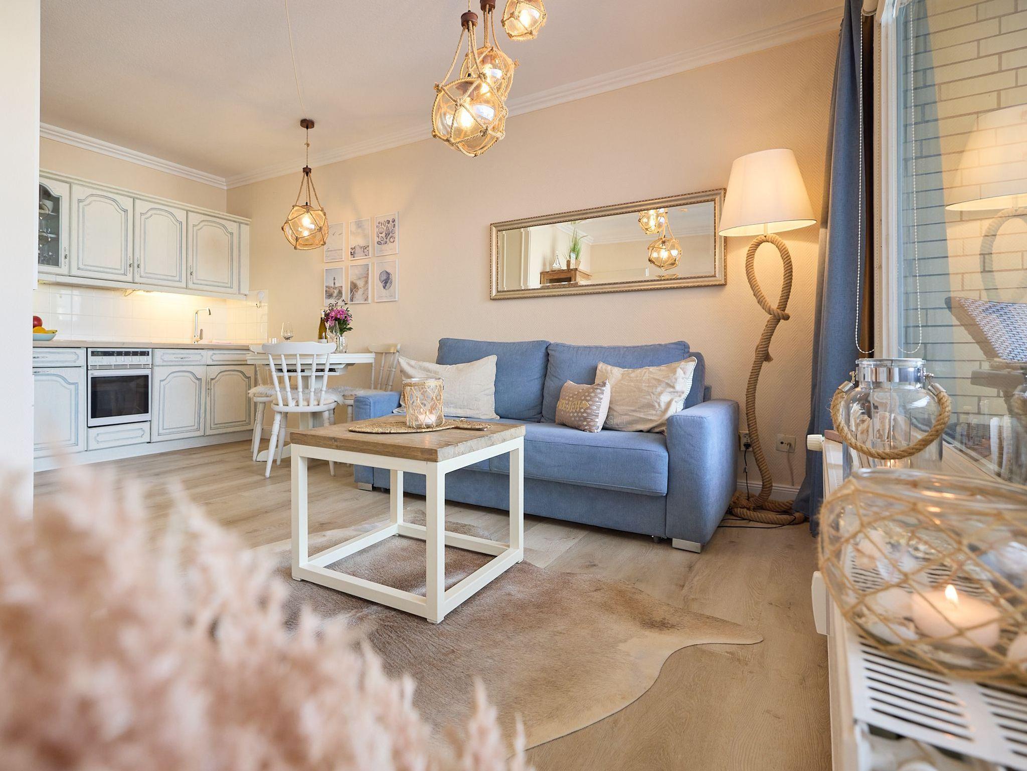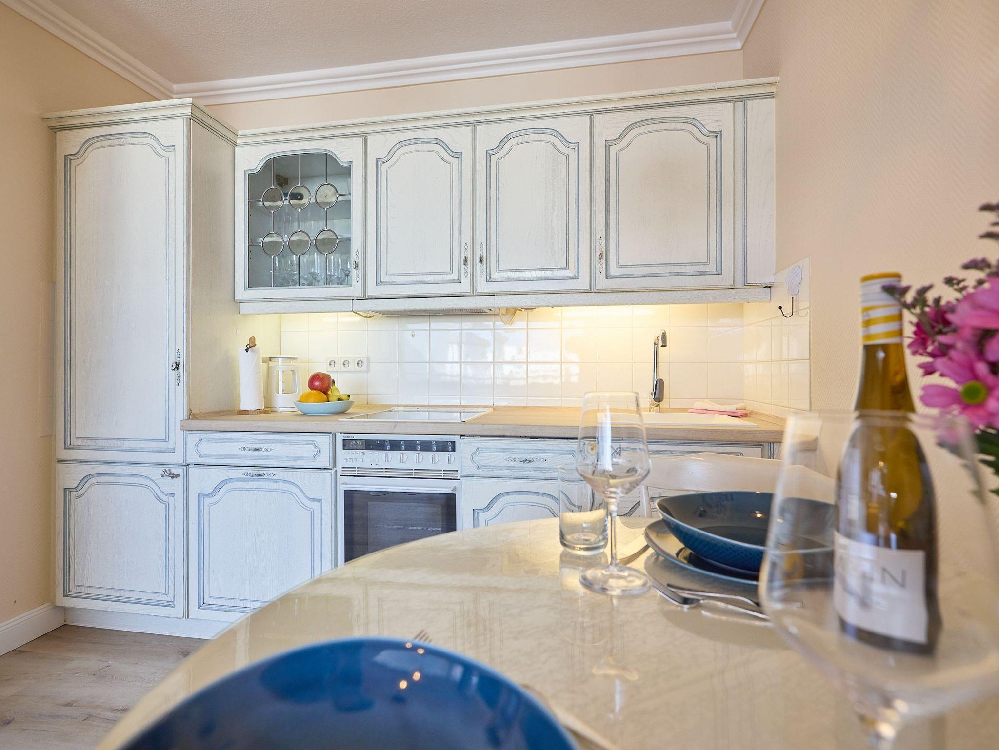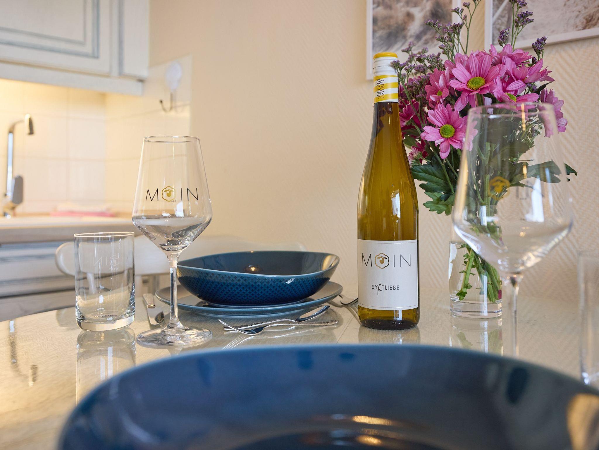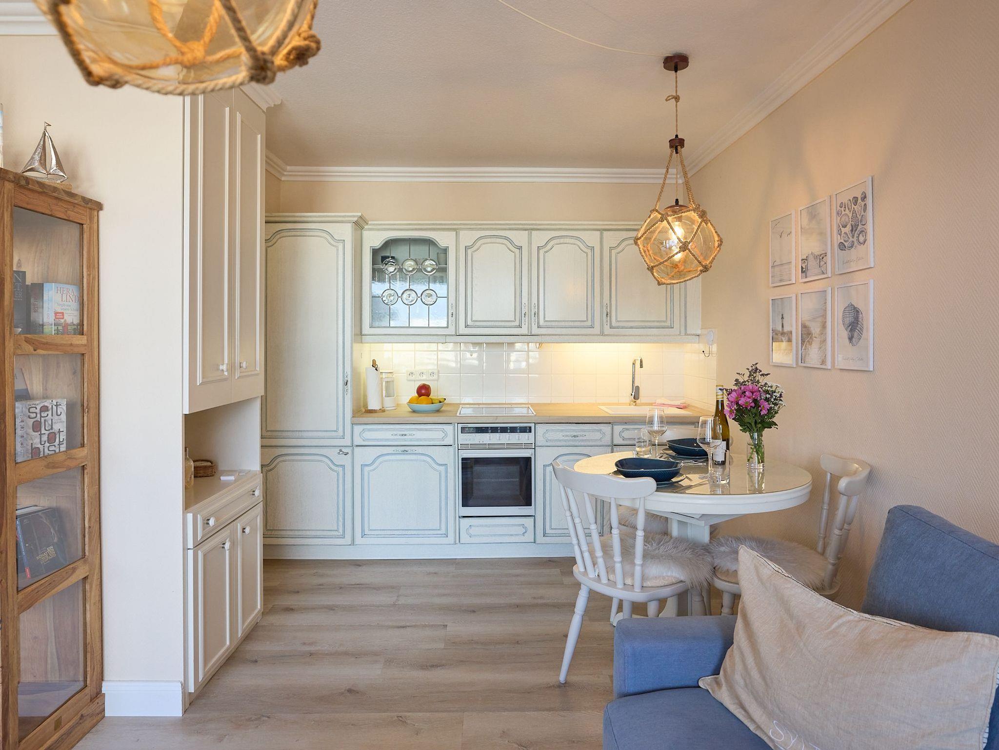 Die im Wohn- und Essbereich integrierte Küchenzeile verfügt über ein Ceran-Kochfeld, Backofen und Kühlschrank mit Gefrierfach. Ein Geschirrspüler, eine Kaffeemaschine, ein Wasserkocher sowie modernes Geschirr, Töpfe, Pfannen und Gläser gehören ebenso zur Ausstattung. Zudem erwartet Sie eine kleine Grundausstattung an Kaffee, Zucker, Salz, etc. Der Flurbereich bietet einen geräumigen Kleiderschrank und einen Schuhschrank. Angrenzend zum Flur finden Sie das Duschbad und das Schlafzimmer.