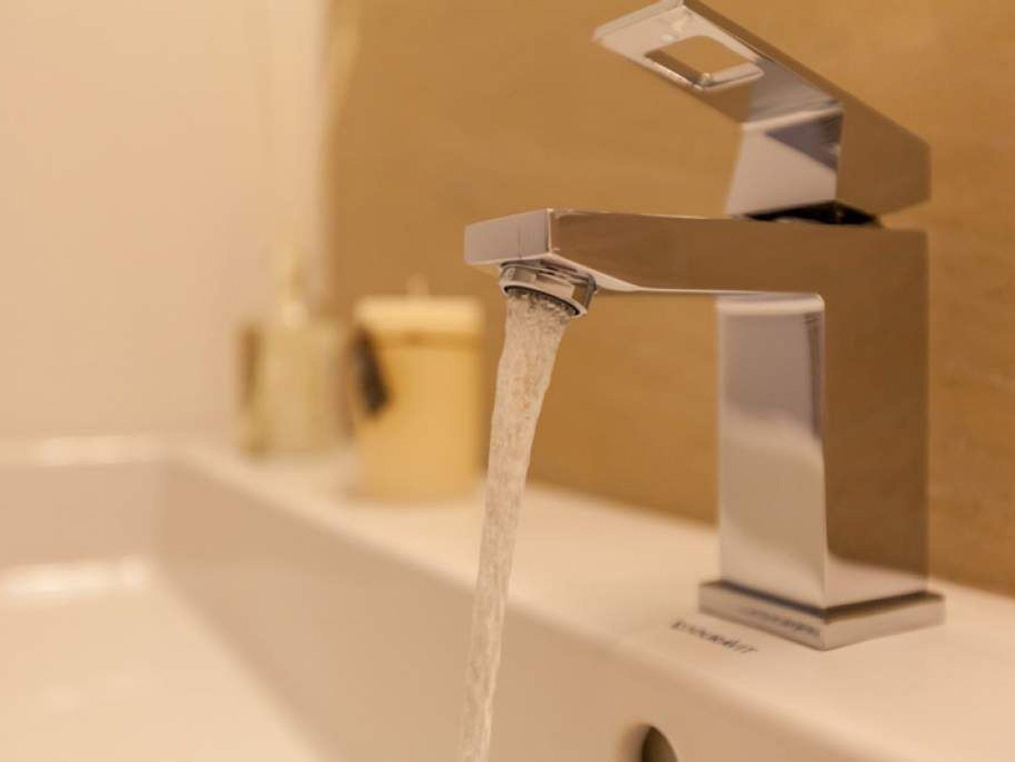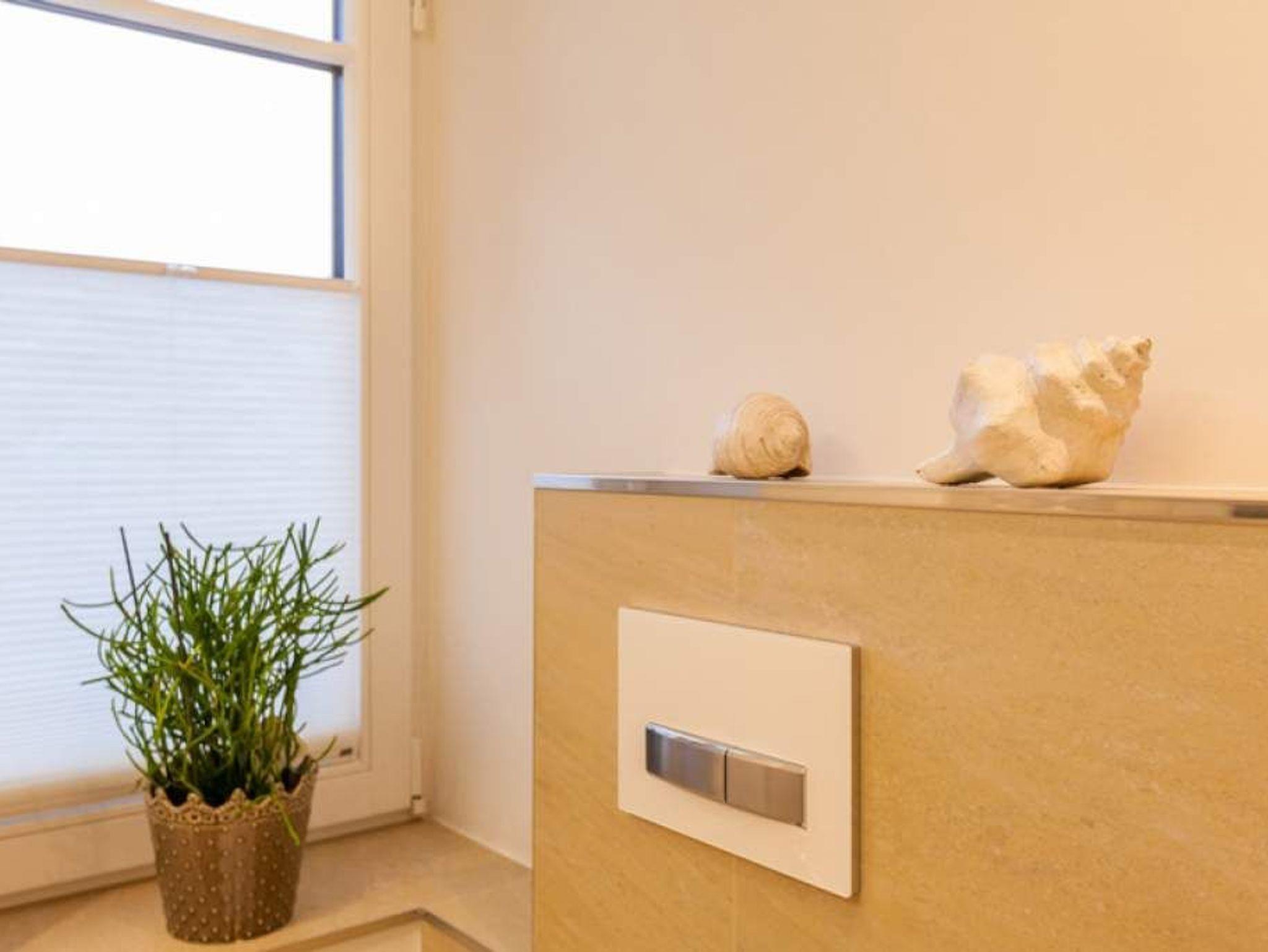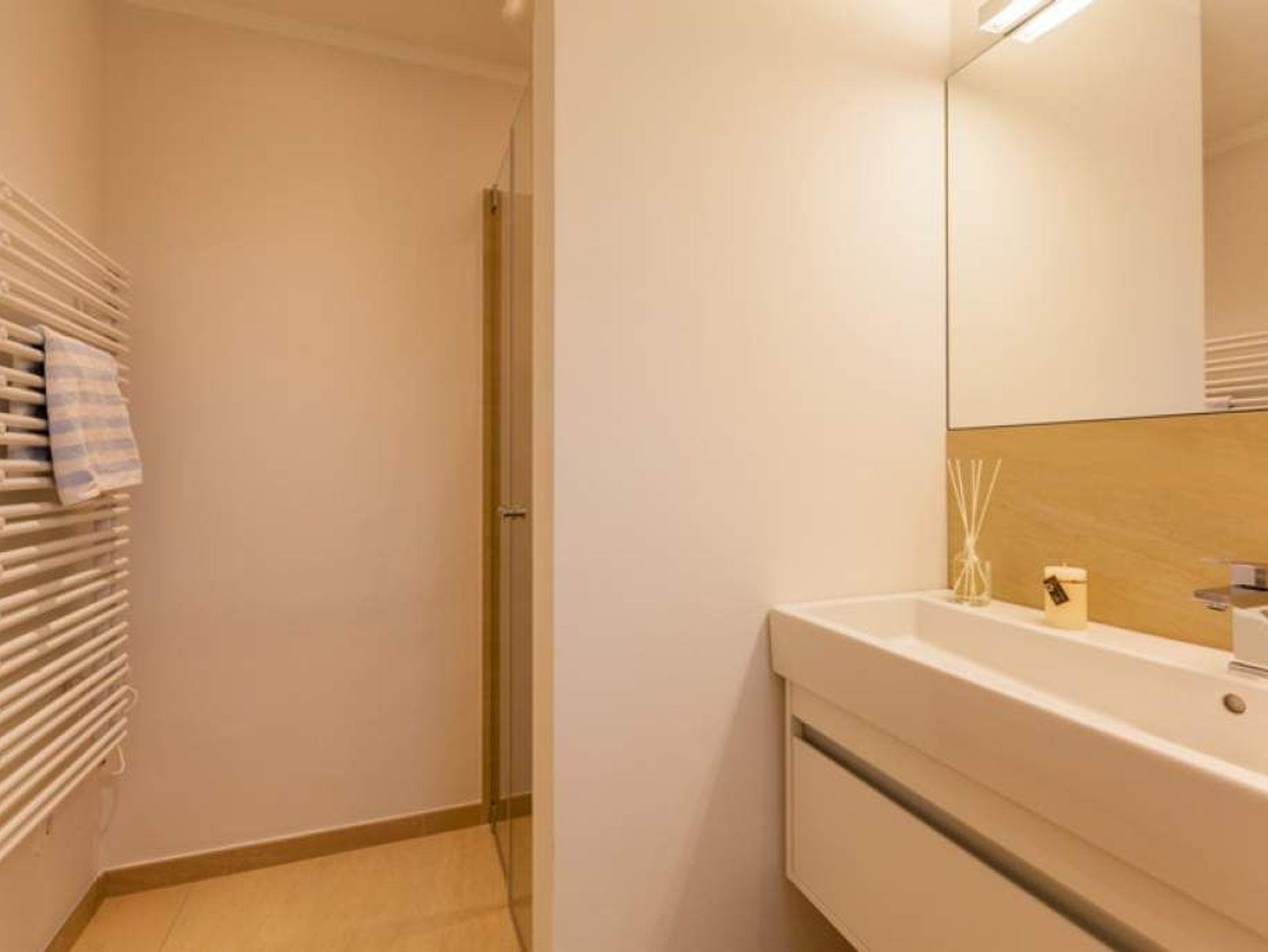 Das neue Bad lässt mit moderner Regendusche, Fön, Kosmetikspiegel, Waschtisch, Handtuchwärmer und WC keine Wünsche offen.