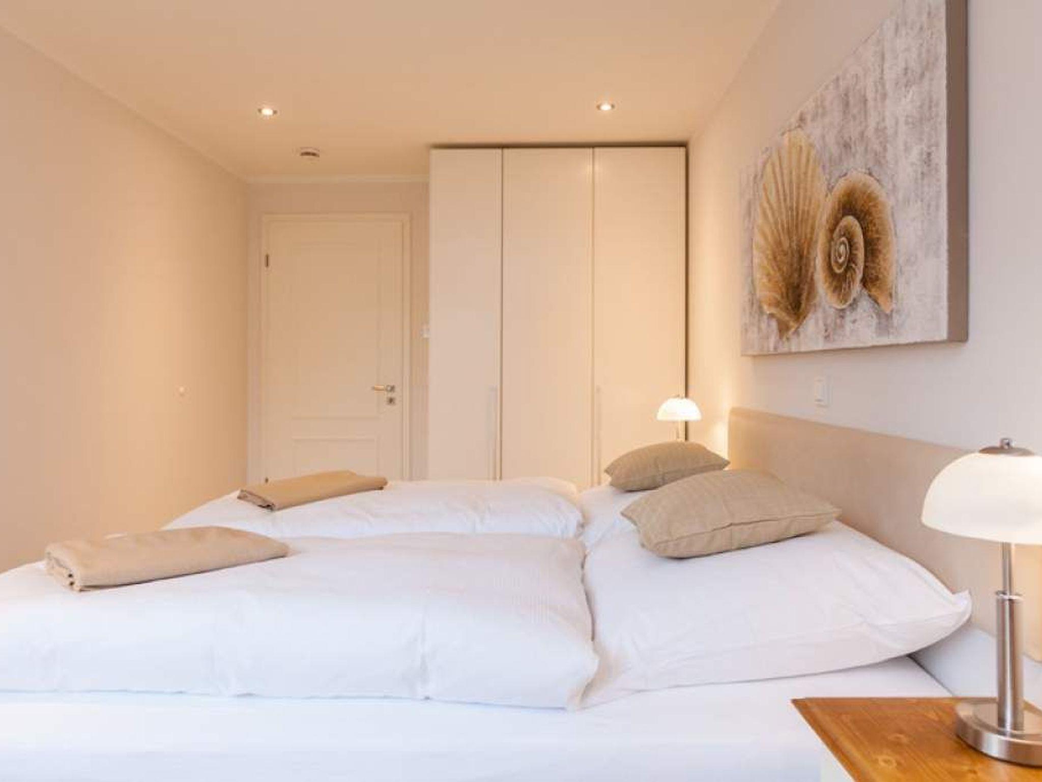 Vom Vorflur gelangt man außerdem in das geräumige Doppel-Schlafzimmer mit Boxspringbett (Einzelmatratzen 0,90 x 2,00 m) in optimaler Liegehöhe (Kinderzustellbett möglich) mit weiterem Flachbild-TV.