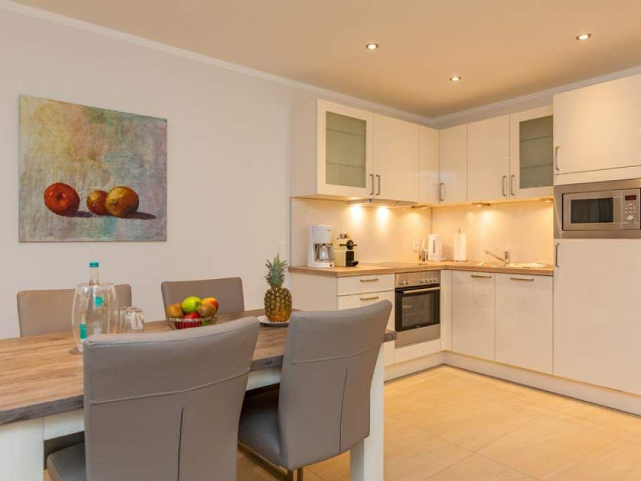 Die offene Küche ist mit Cerankochfeld, Geschirrspüler, Mikrowelle, Backofen, Kühlschrank, Nespresso-Maschine und einem Eierkocher voll ausgestattet. Toaster, Kaffeemaschine und Wasserkocher gehören zur Grundausstattung.
