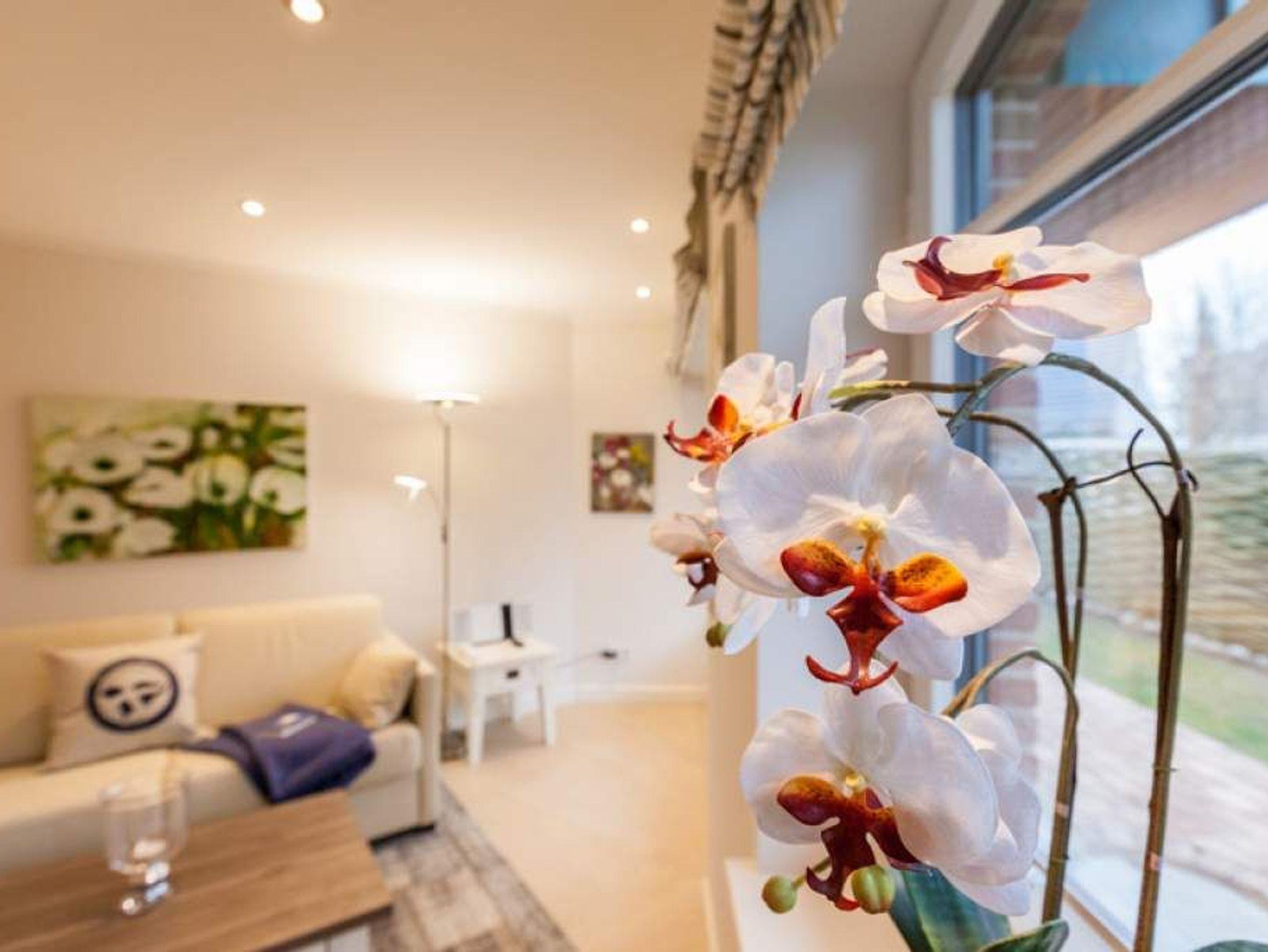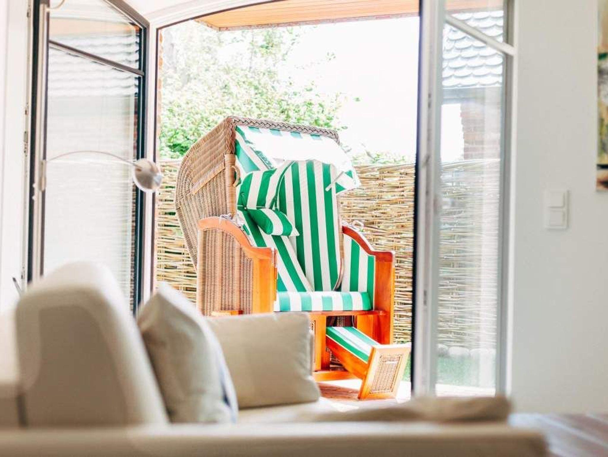 Luxuriöse 2-Zimmer-Nichtraucher-Ferienwohnung auf einer Ebene (barrierefrei), ca. 58 qm im Erdgeschoss mit Südostterrasse mit Strandkorb und kleinem Garten für 2 Personen