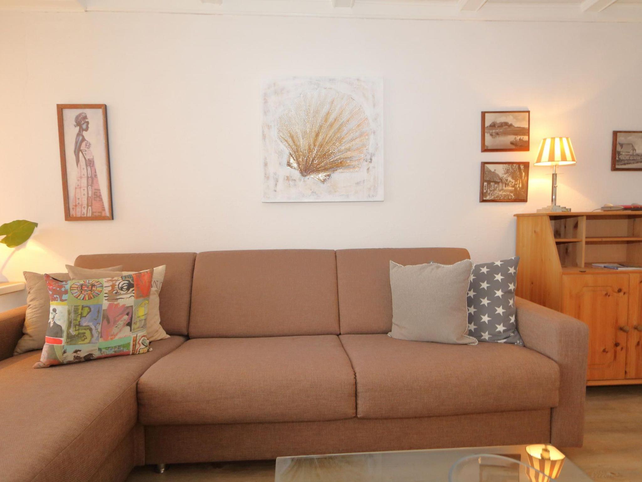 Ein gemütlicher Einrichtungsstiel in warmen Farben erwartet Sie. Moderne Sitzgarnitur, Flachbildfernseher und Radio sowie Eßecke am Küchentresen.