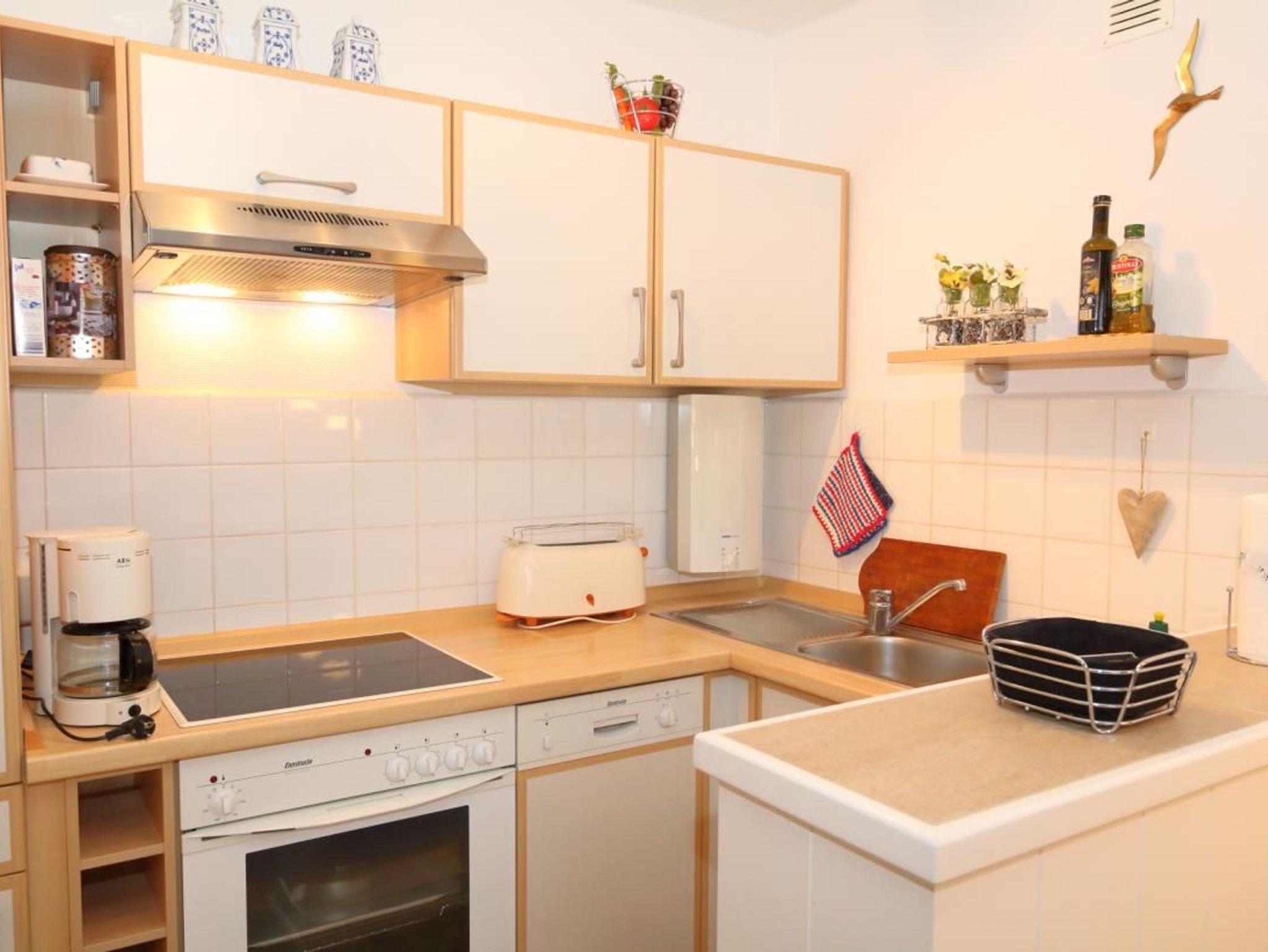 Küche mit Ceranfeld, Spülmaschine, Kühlschrank mit Eisfach, Filter-Kaffeemaschine, elektrischer Wasserkocher und Toaster sind selbstverständlich.